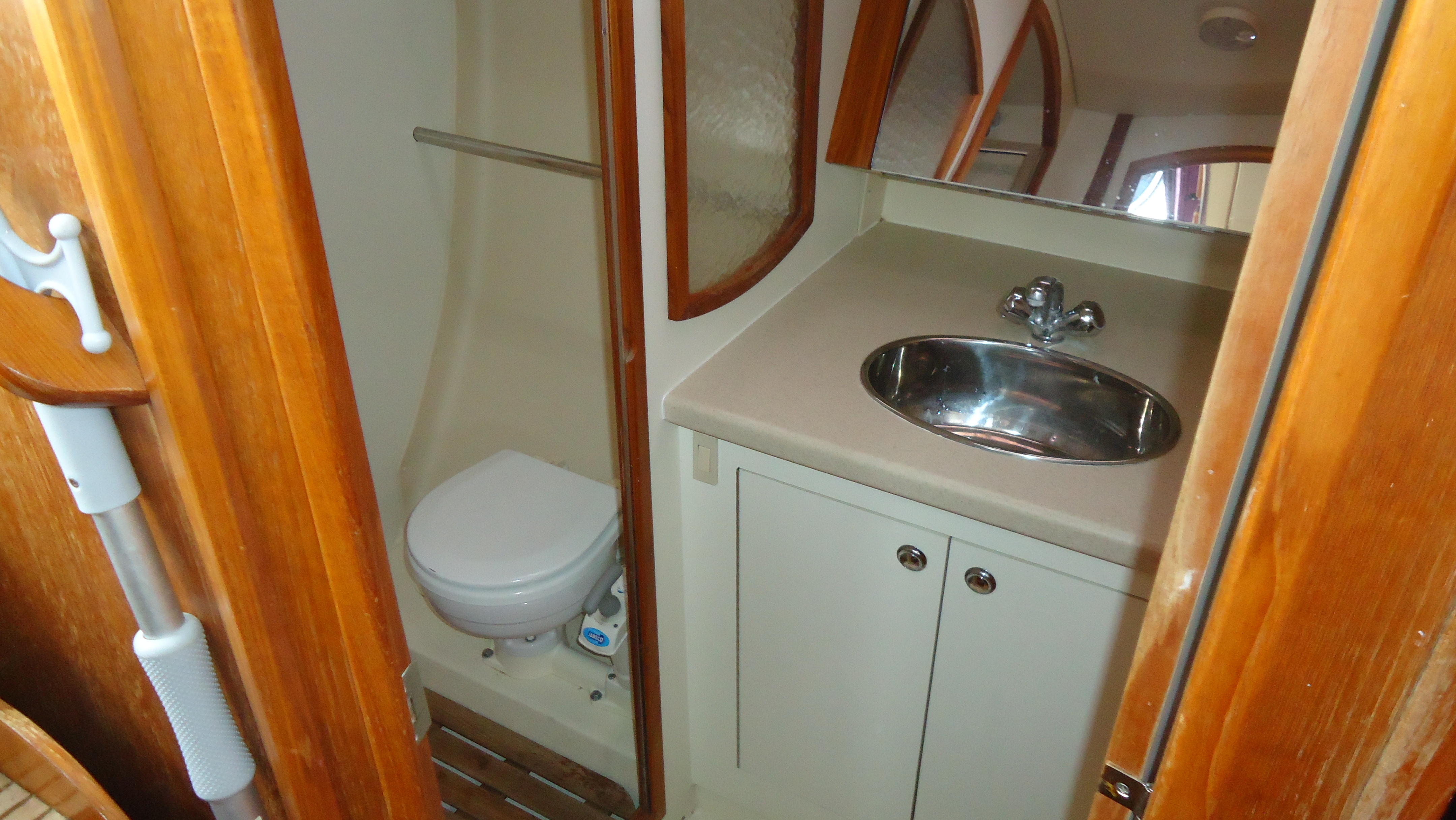 HEAD with vanity unit with sink and mixer tap, manual sea toilet to holding tank and shower. Also to Port is the