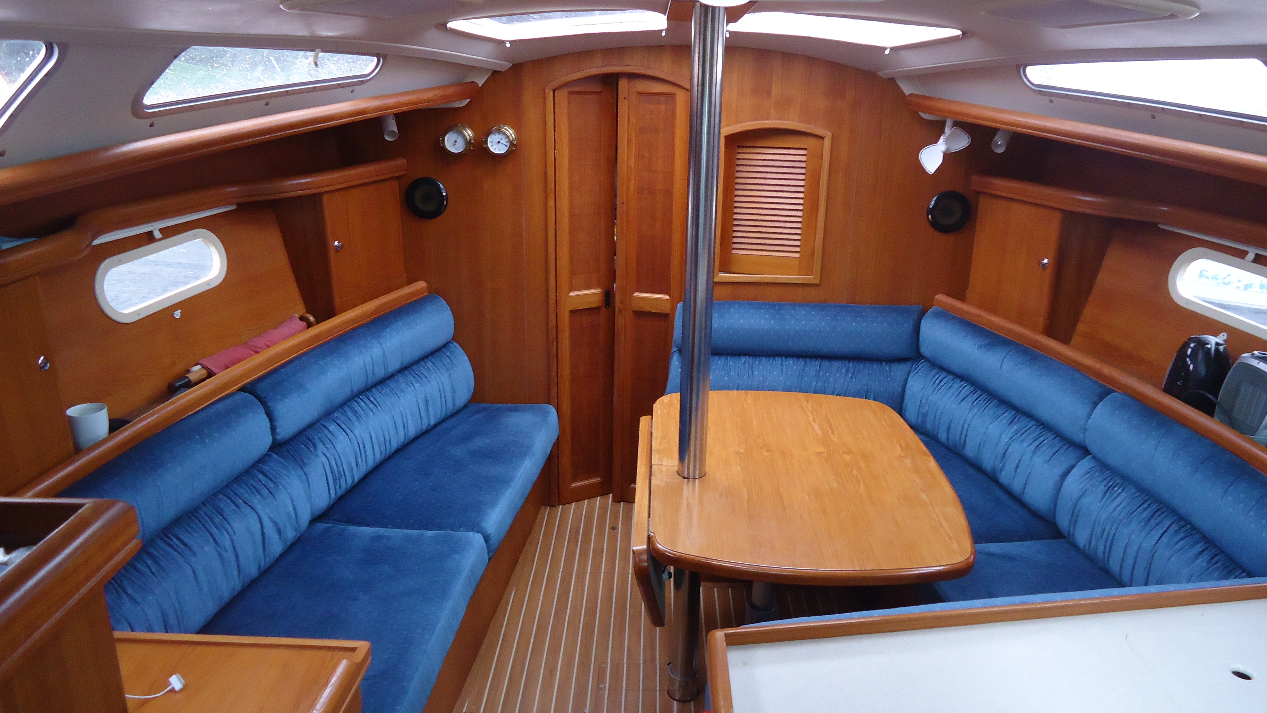 SALOON SEATING with large U shaped seating with drop down leaf table, which coverts to double to starboard and opposite to port is bench seat or single berth.
