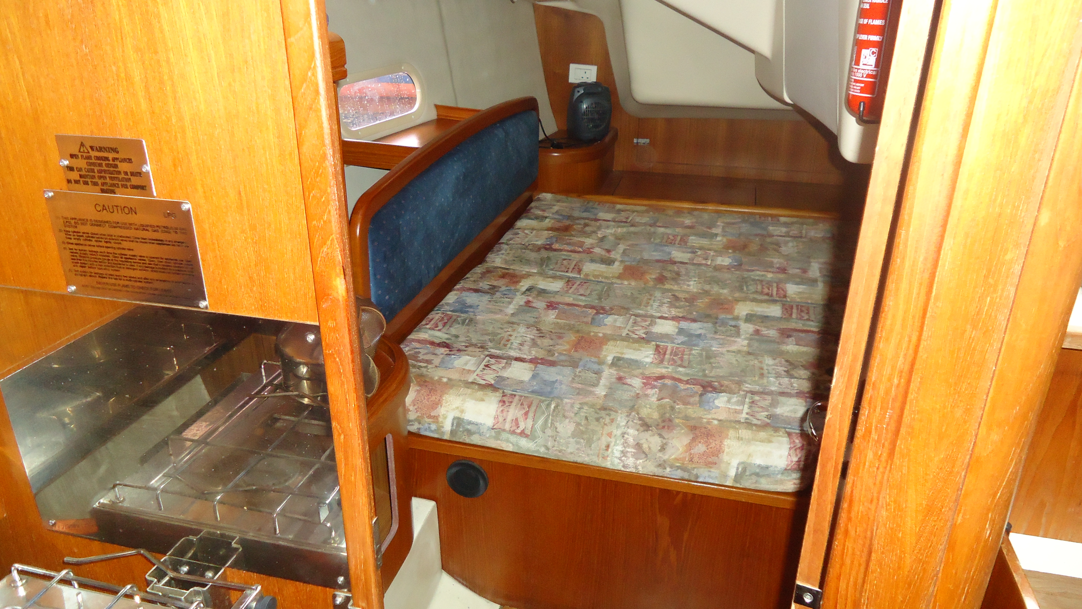 GALLEY to starboard with large fridge, stainless steel sink with mixer tap, full oven with grill and 2 burner gas hob and plenty of storage. Opposite to port is the