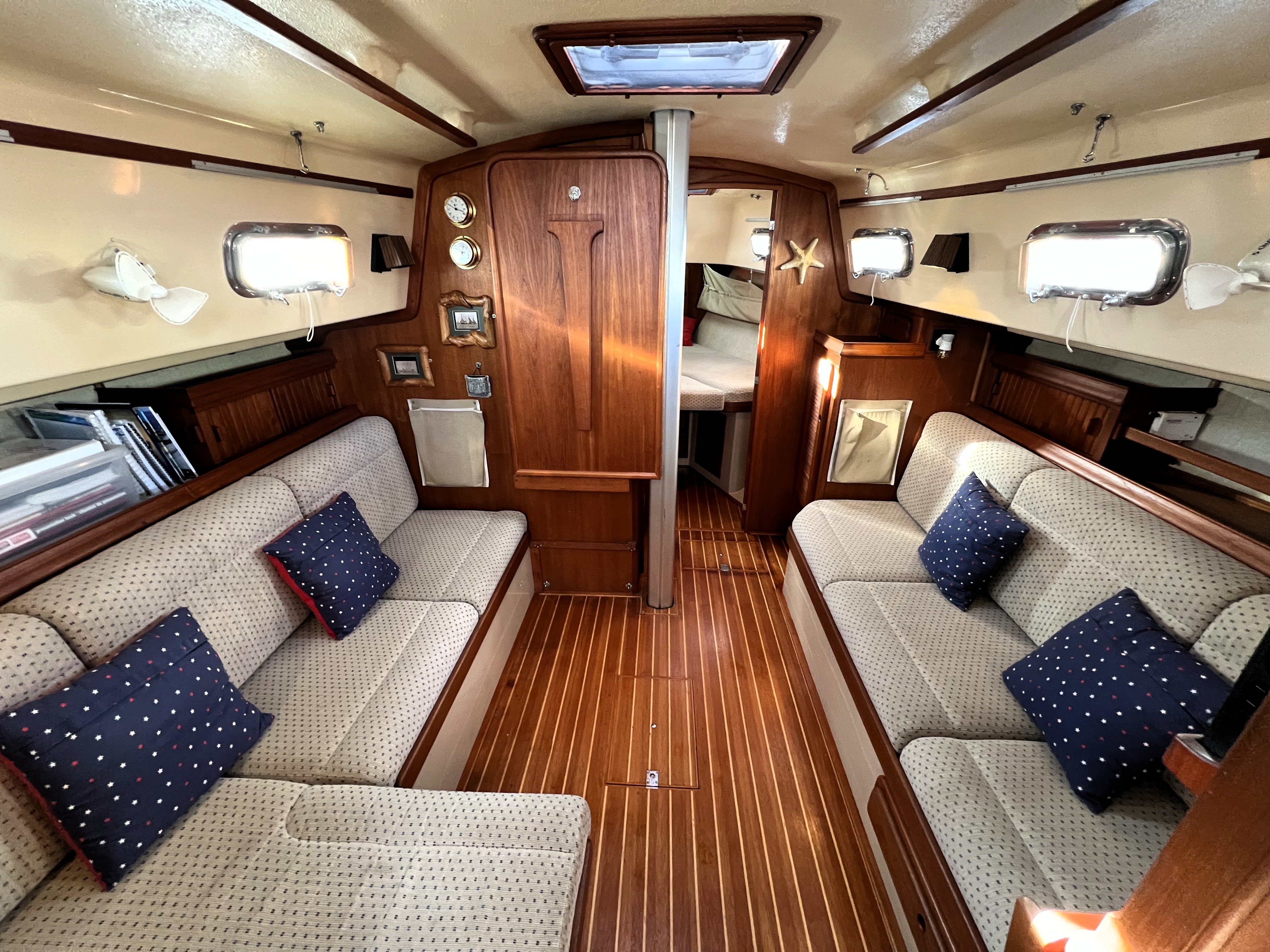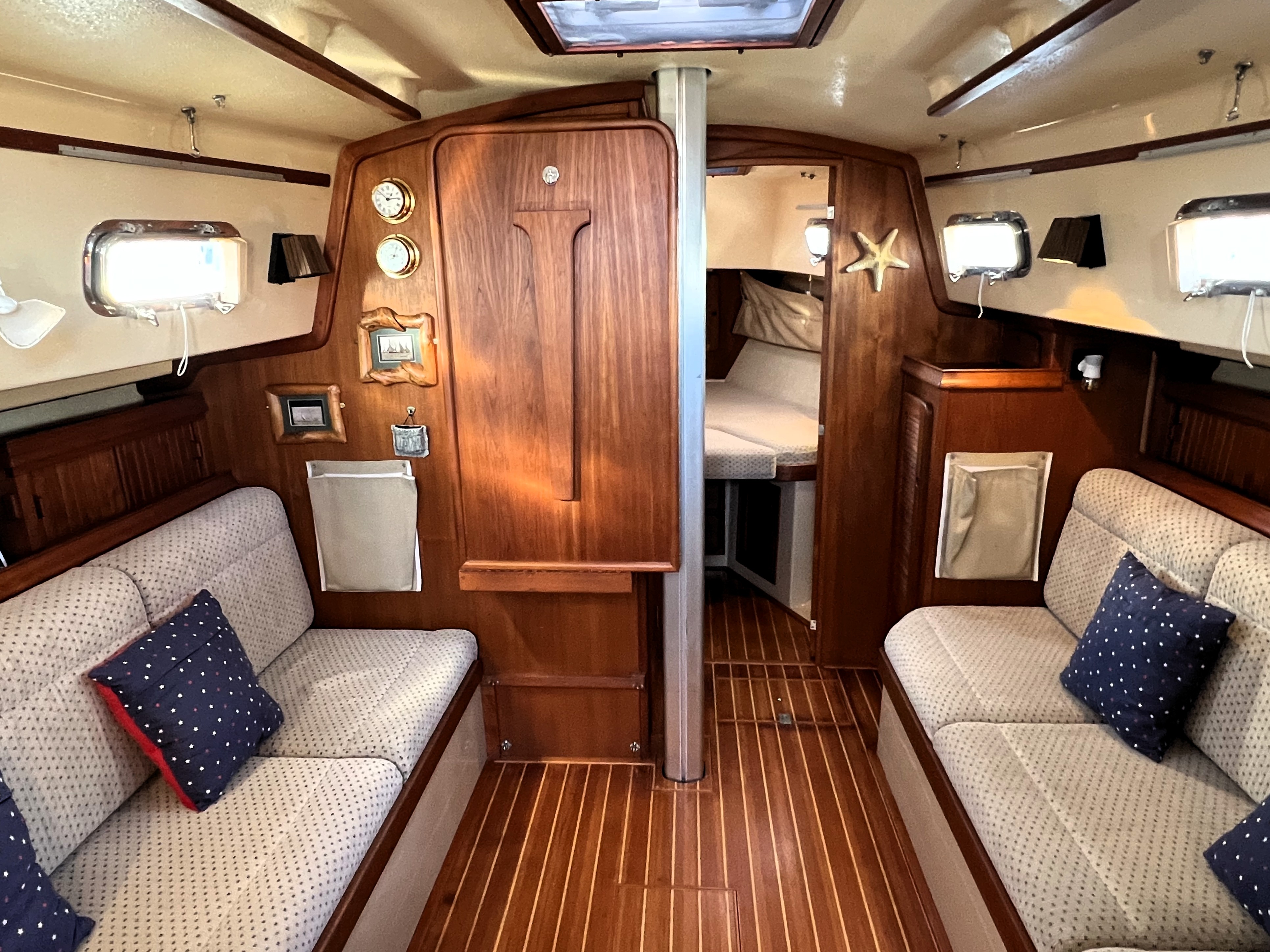 Beautiful saloon area with two large bench seats to convert to single berths.