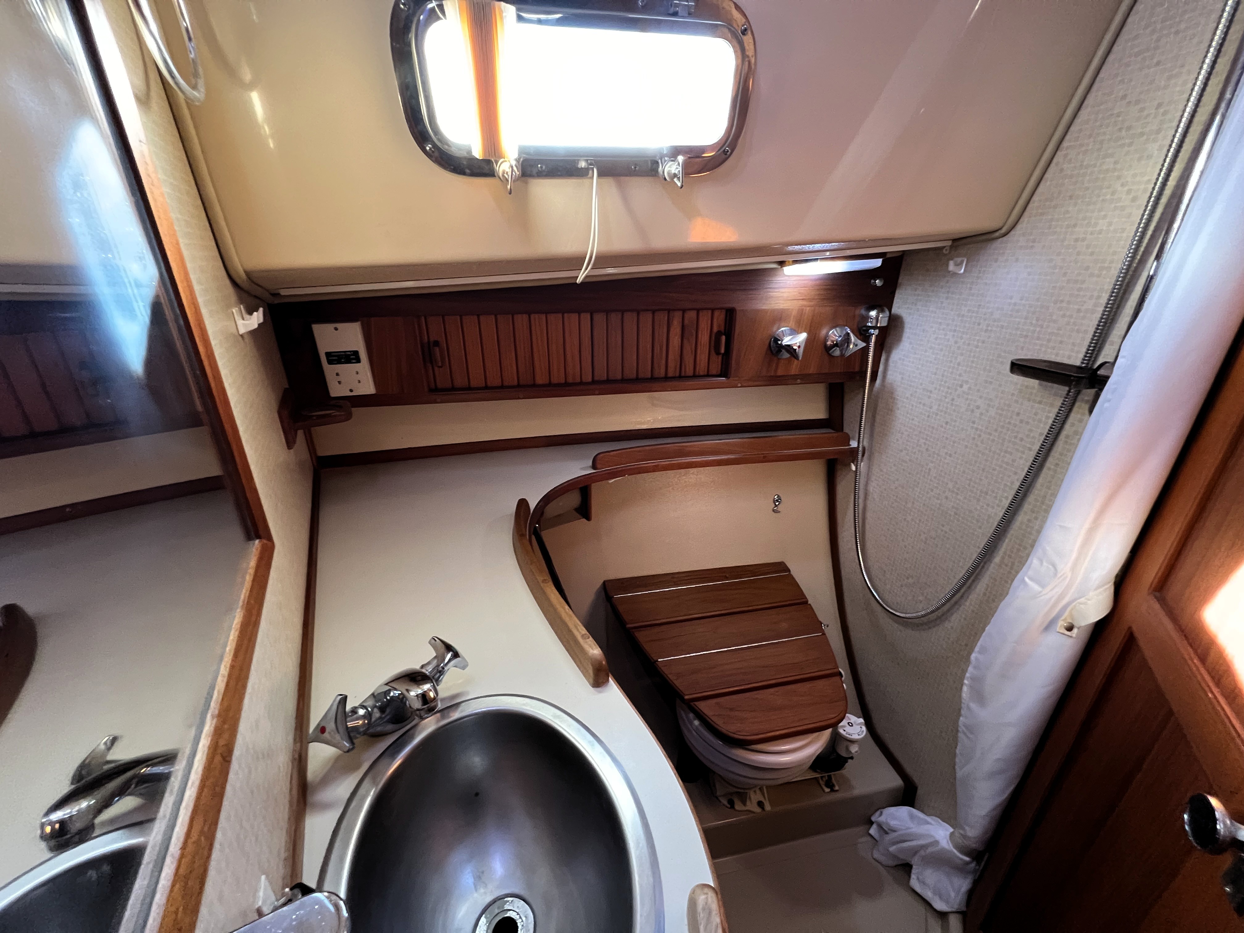 Sperate heads with shower and manual flush WC to the port side, with Jack and Jill access.