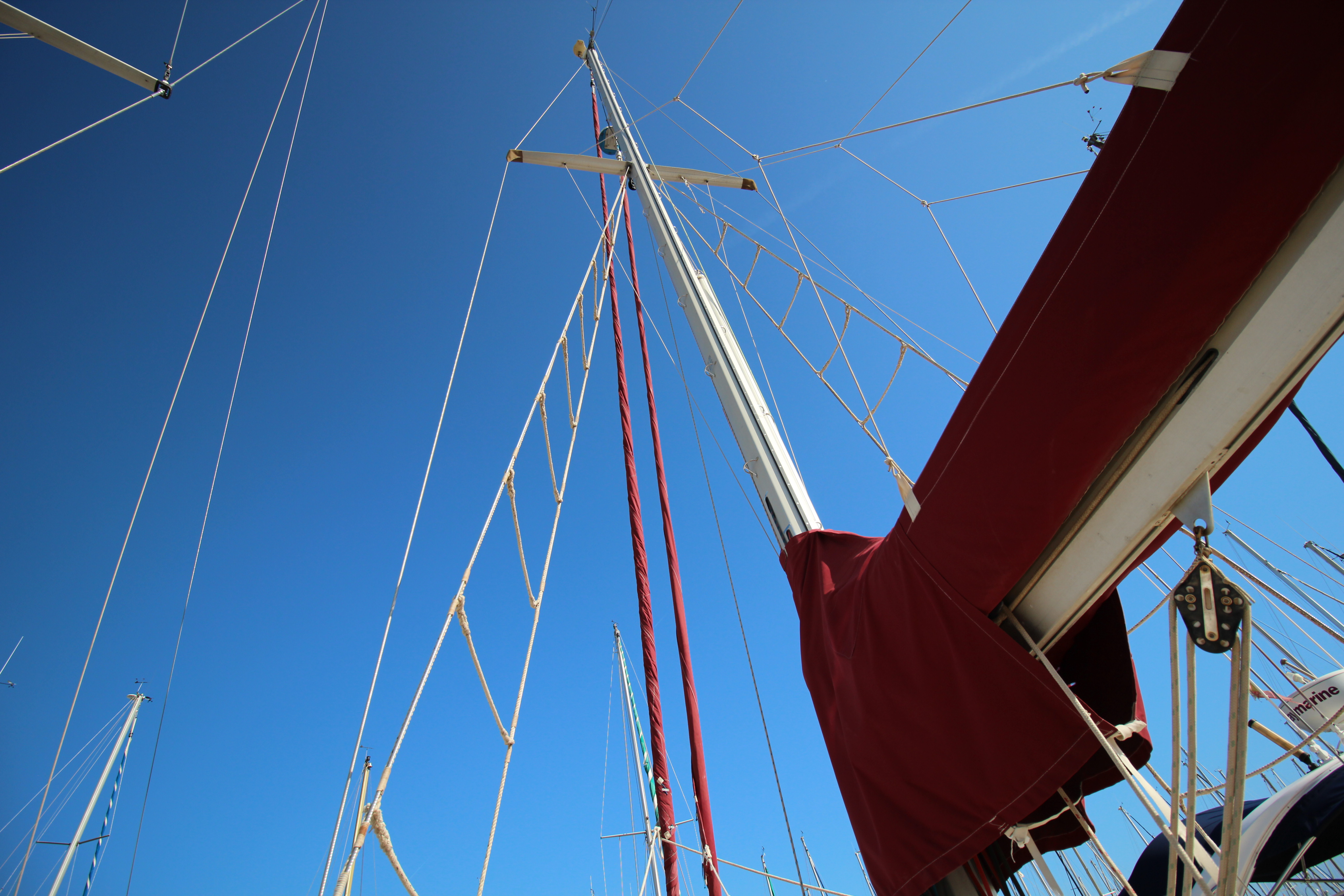 Anodized aluminium, single spreader, keel stepped mast.