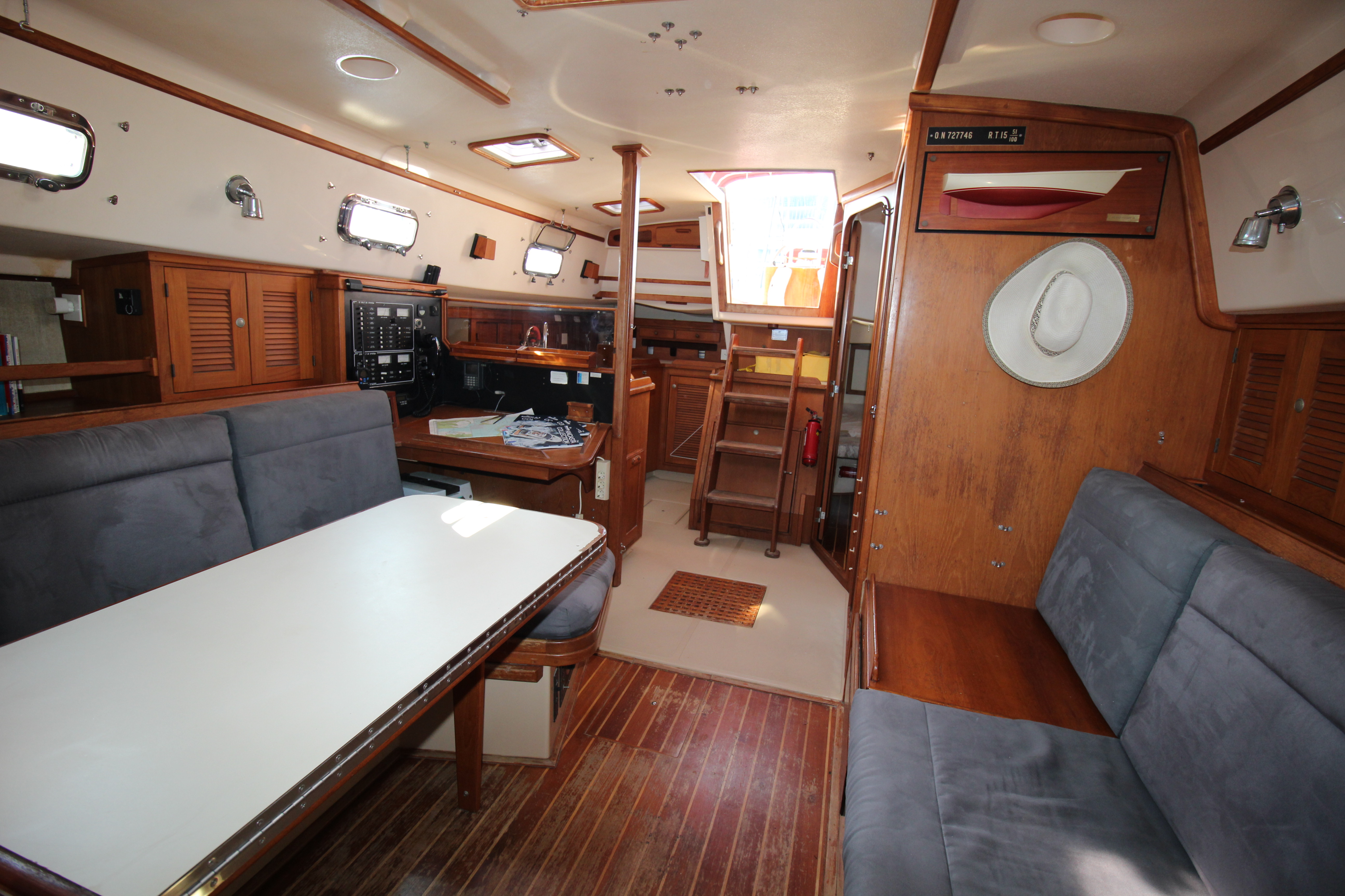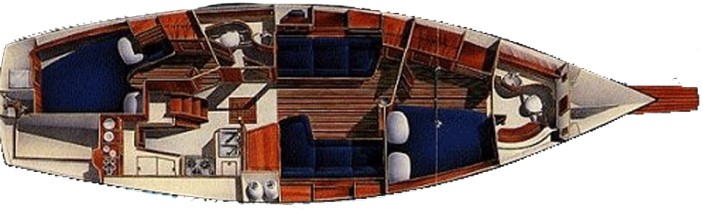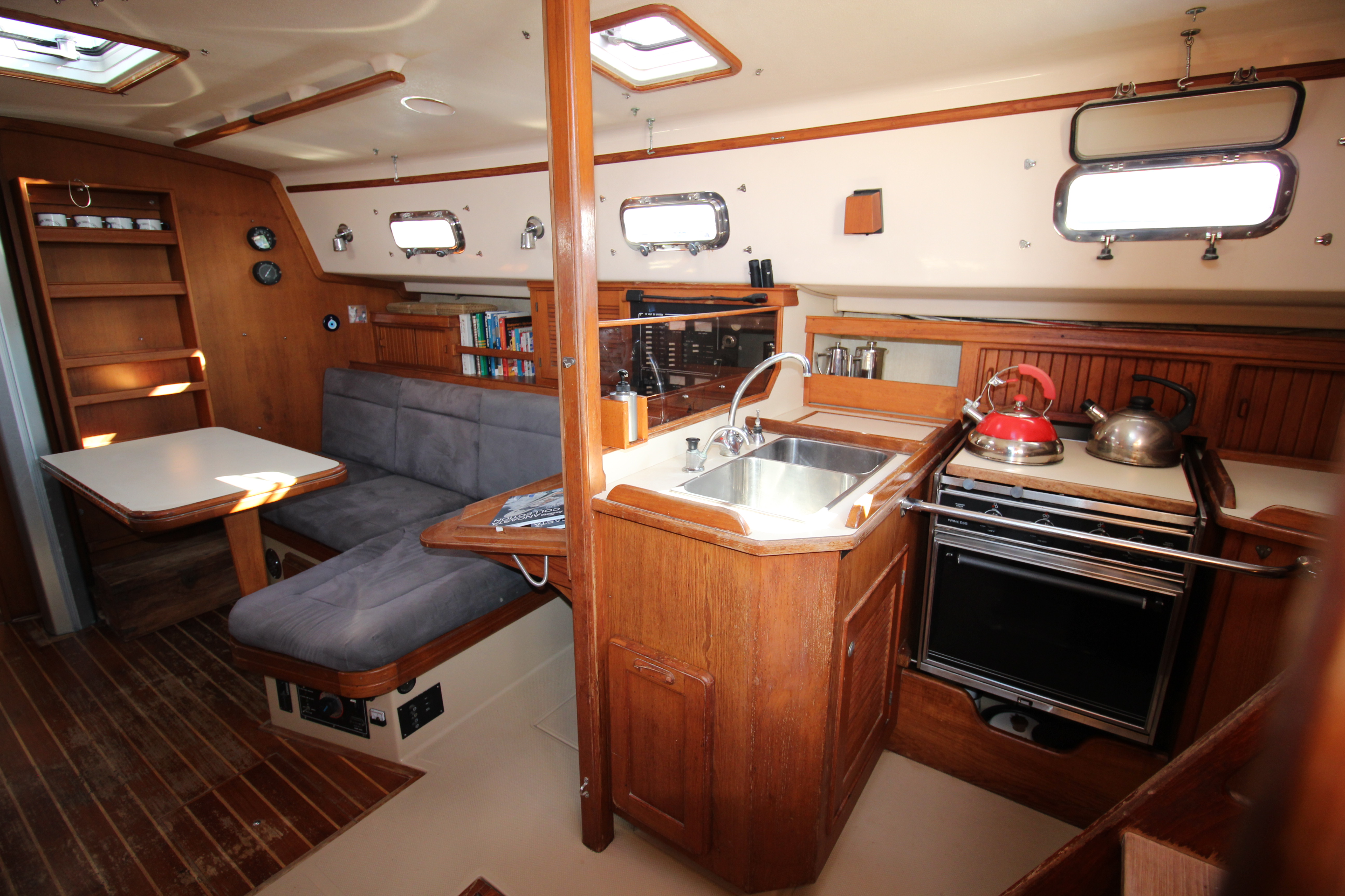 Two opening ports plus overhead hatch, varnished teak & holly sole.