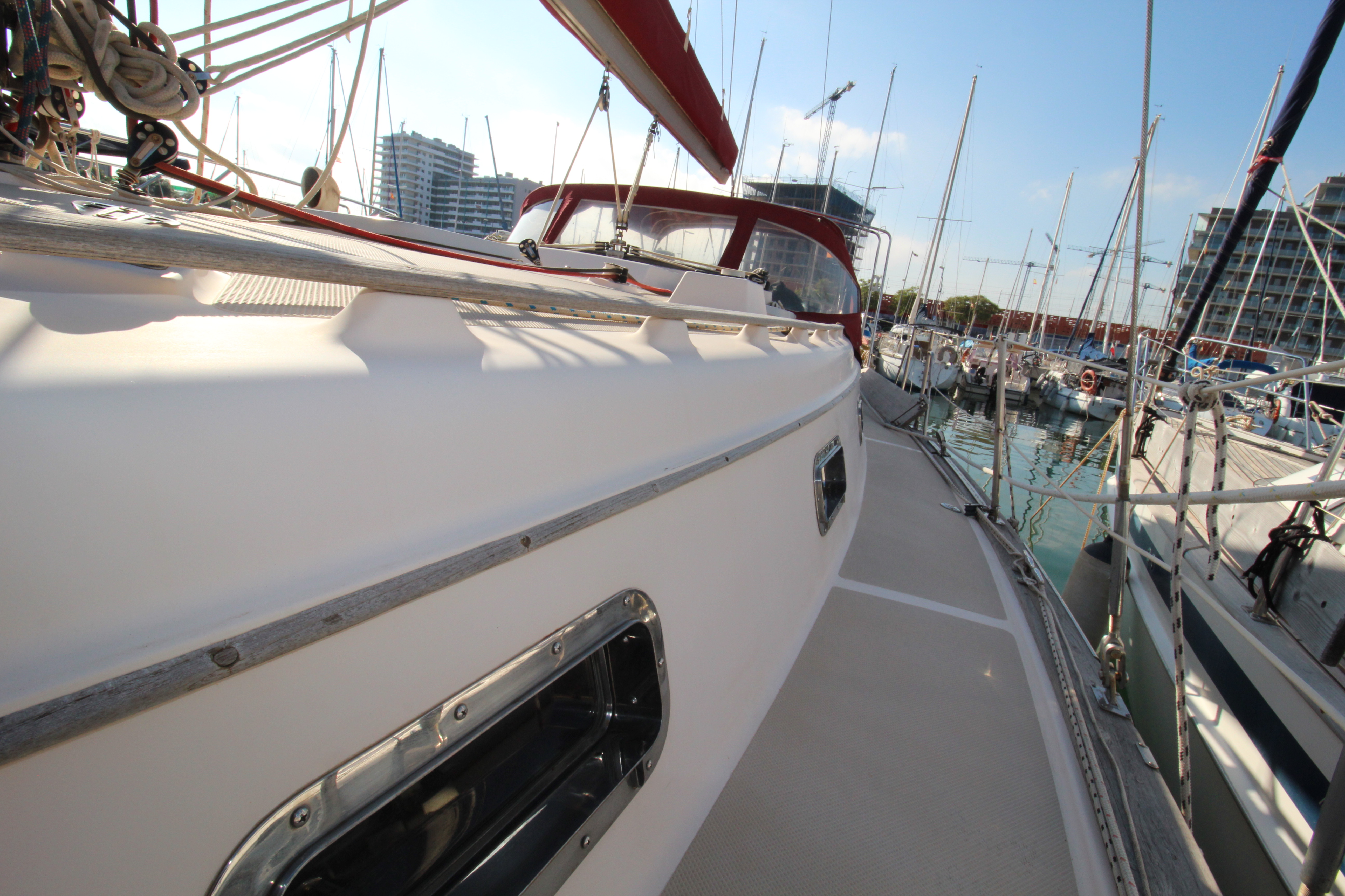 Three opening ports, overhead hatch, deck vents, varnished teak & holly sole.