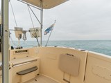 Opening windows in the enclosed deckhouse offer panoramic views, while the centre windshield panel hinges upward to allow socializing with family and friends in the forward cockpit. Control of this vessel is made easy and comfortable with dual swivel helm and companion chairs plus a large console forward of the wheel for engine controls and instrumentation.