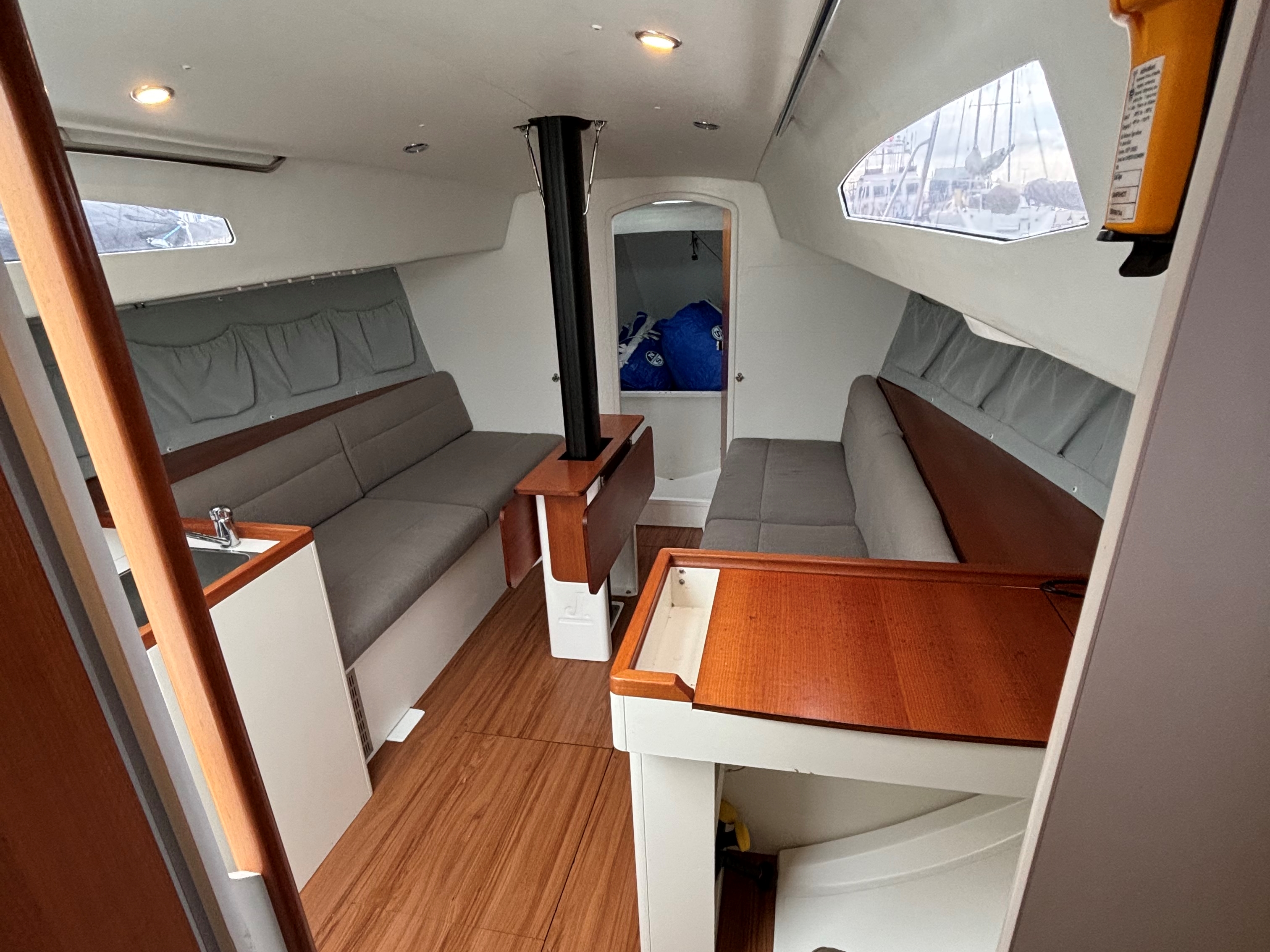 Two full length settee, L shaped galley, nav station starboard, forepeak is dedicated for the head and sail storage.