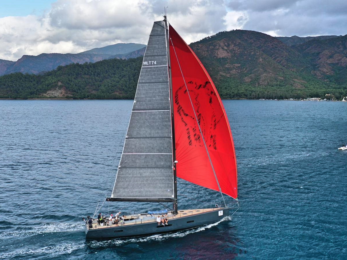 In race mode the boat carries a generous square-head mainsail of 174 m sq, while in cruising mode the fully battened main is only 146 m sq.