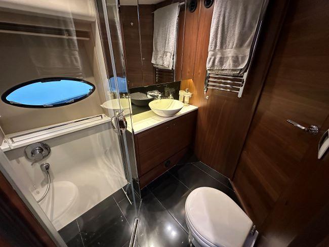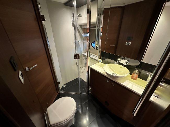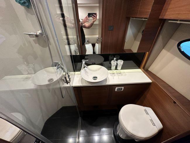 En-suite heads, electric fresh water toilet, sink, storage and separate shower compartment