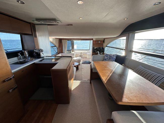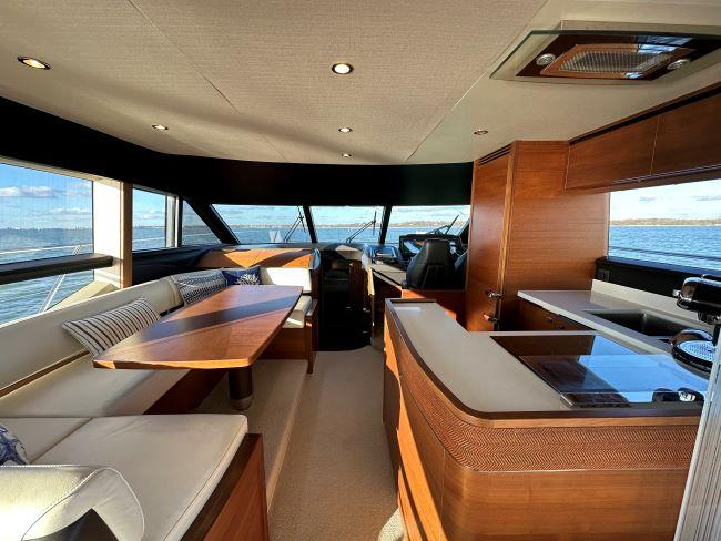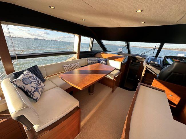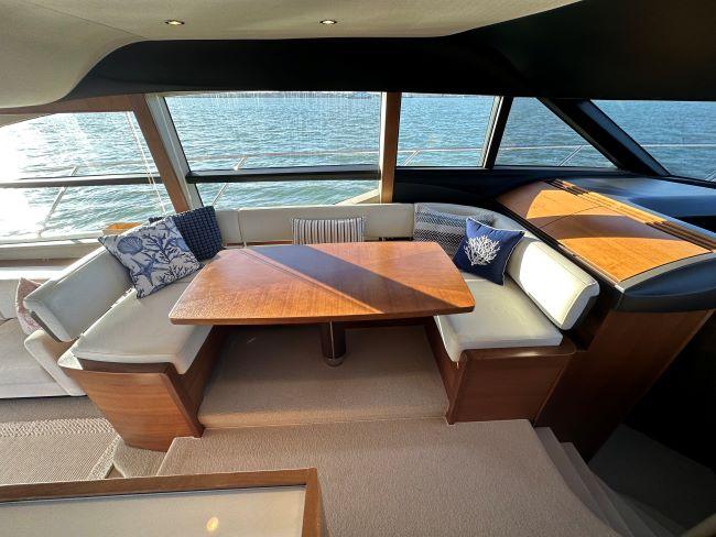 Forward section with U-shaped seating around dining table to port and lower helm to starboard