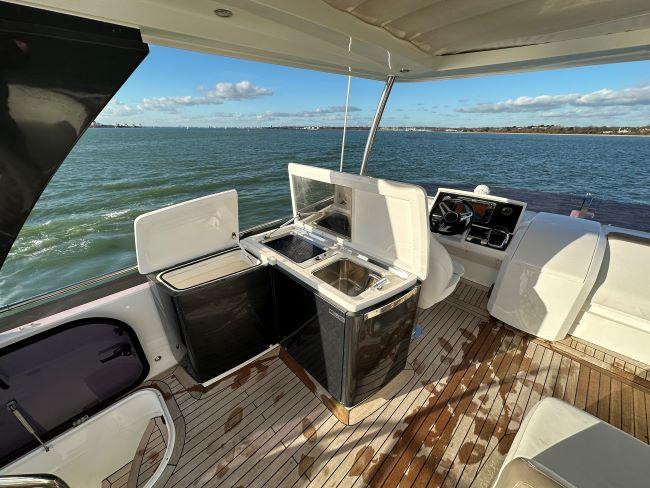 Aft saloon section comprises U-shaped seating to starboard and bench seat to port with pop up 40'' HD LED Smart TV, illuminated glass cupboard, additional saloon fridge, cupboard with Harmon Kardon surround system with additional storage and wine storage for 8 bottles
