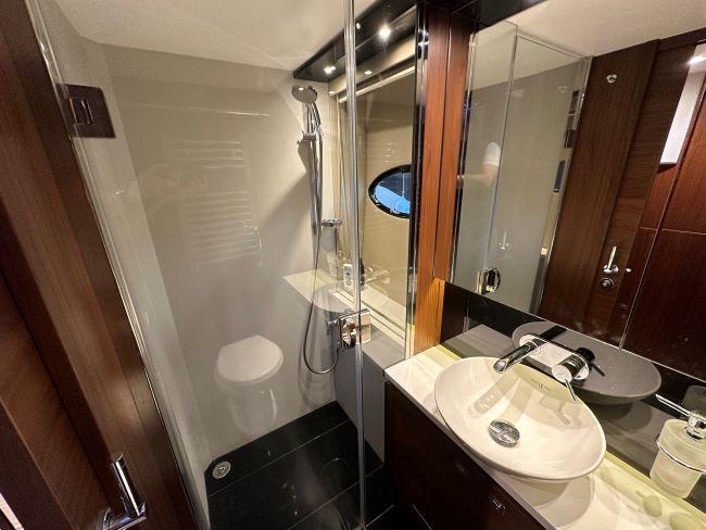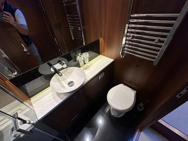 En-suite head with electric fresh water toilet, sink, storage and separate shower compartment