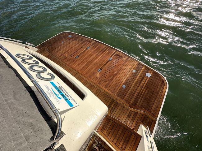Teak decking to flybridge, side, fore decks, cockpit and bathing platform