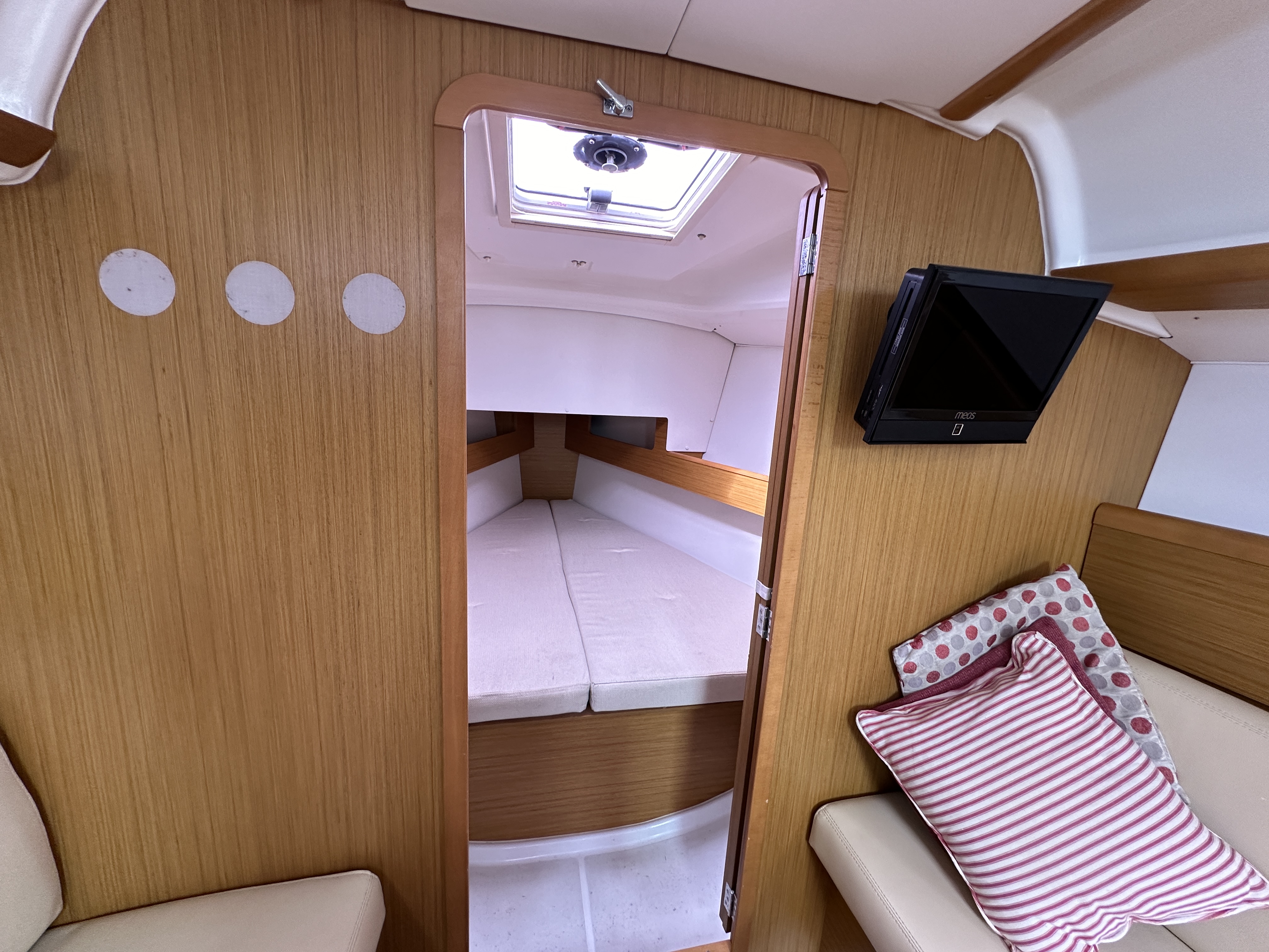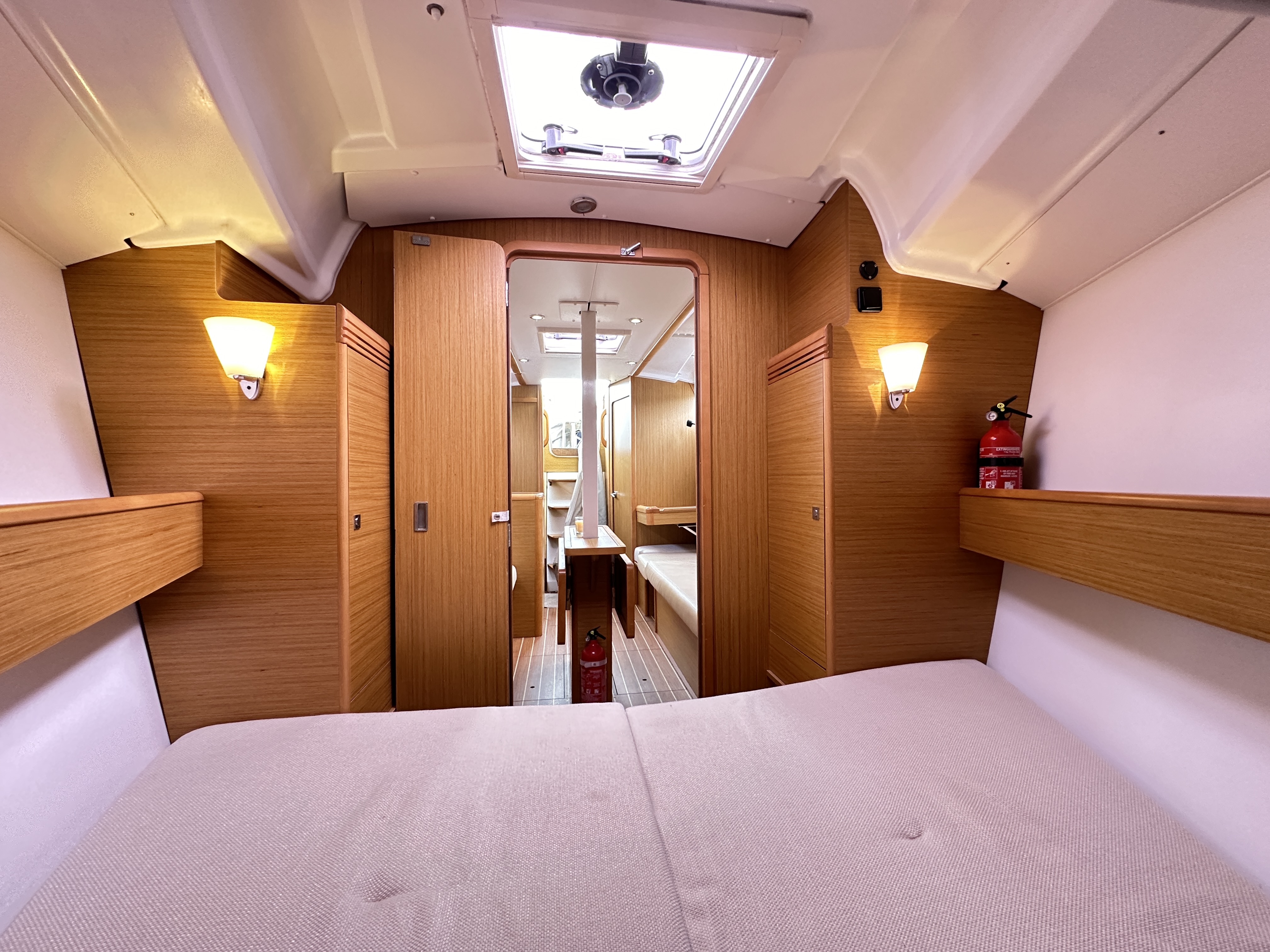 Double cabin aft (berth 6’11” x 6’7”) and one double cabin forward (berth 6’7” x 5’11”).