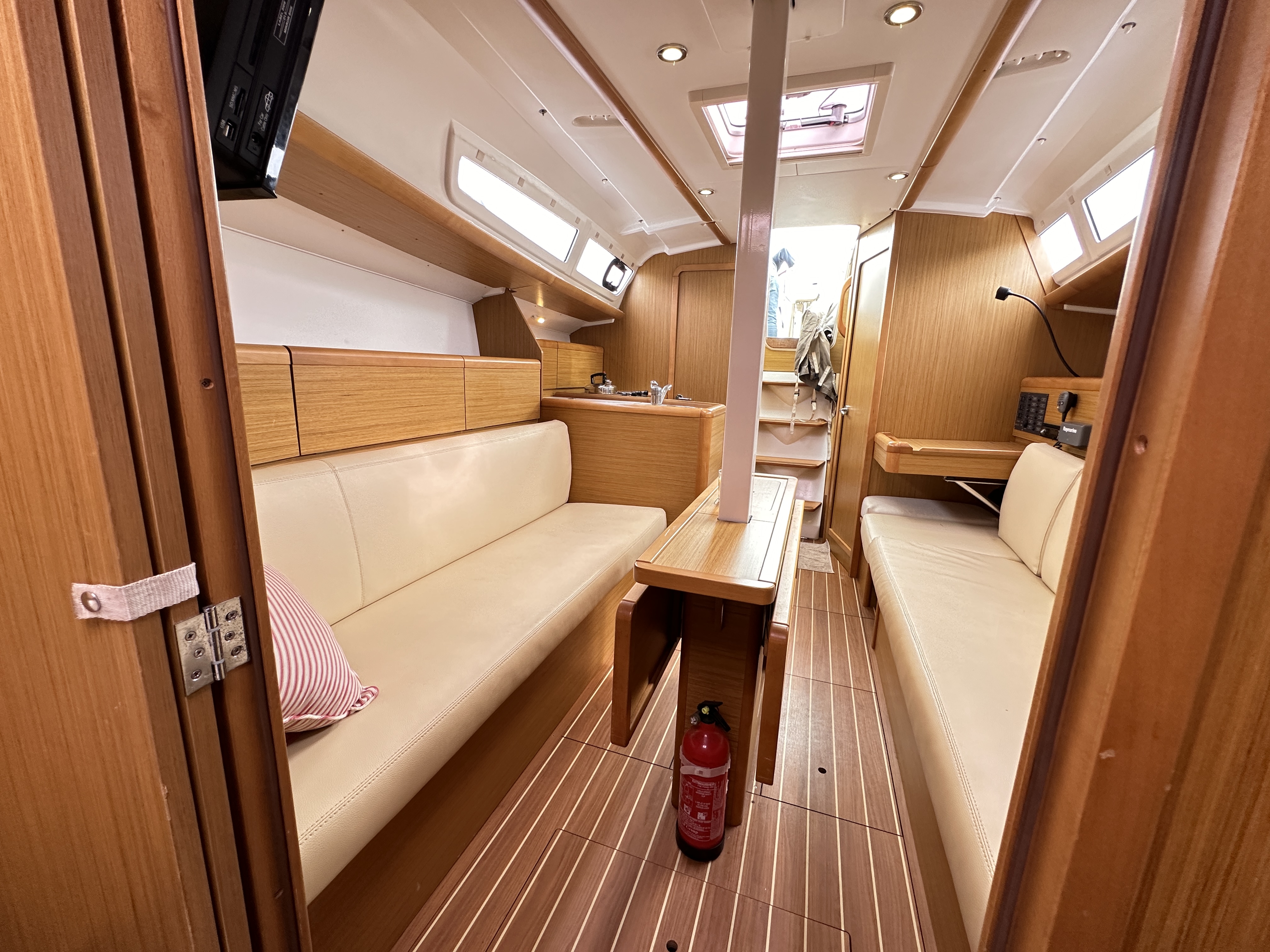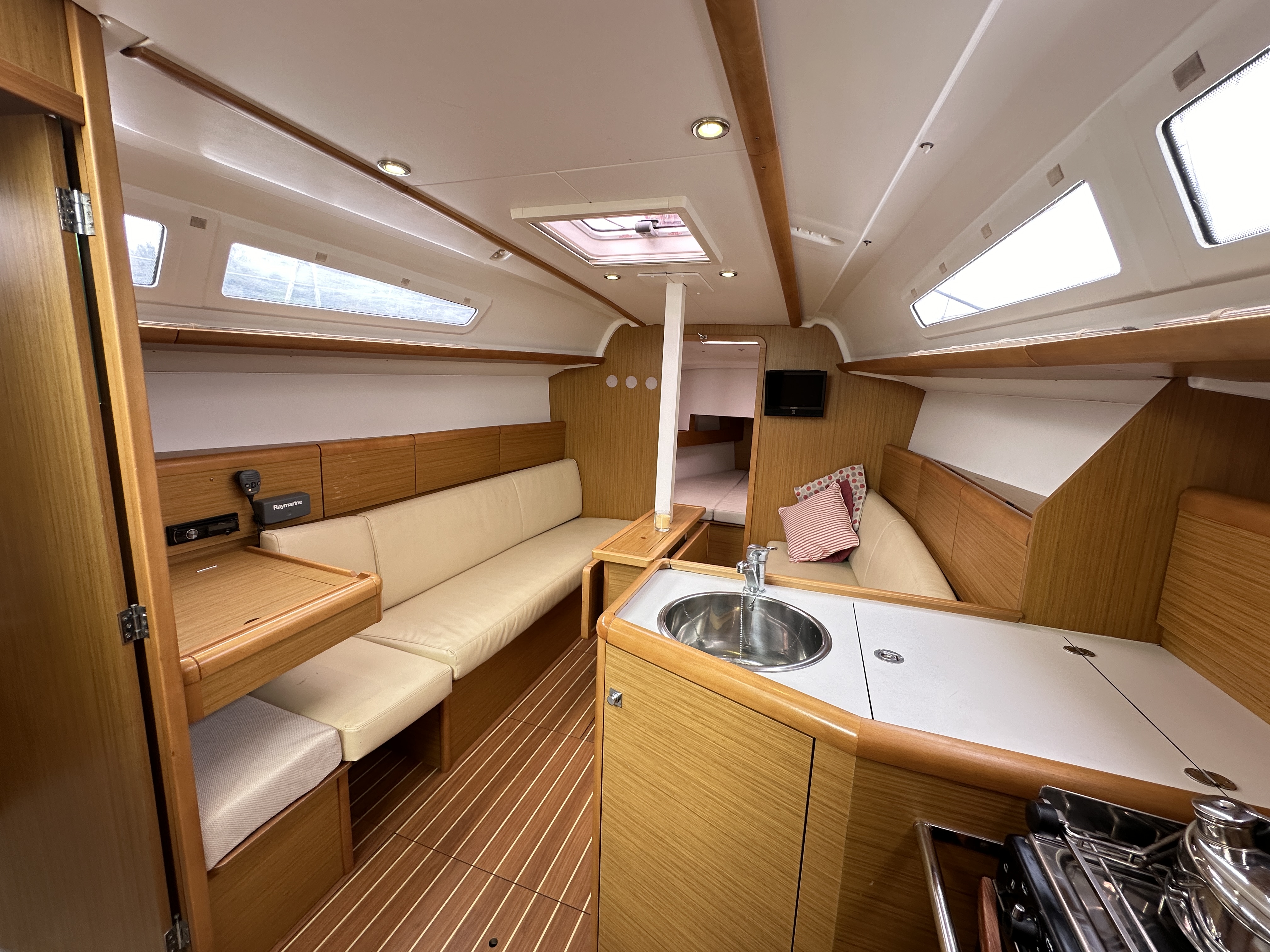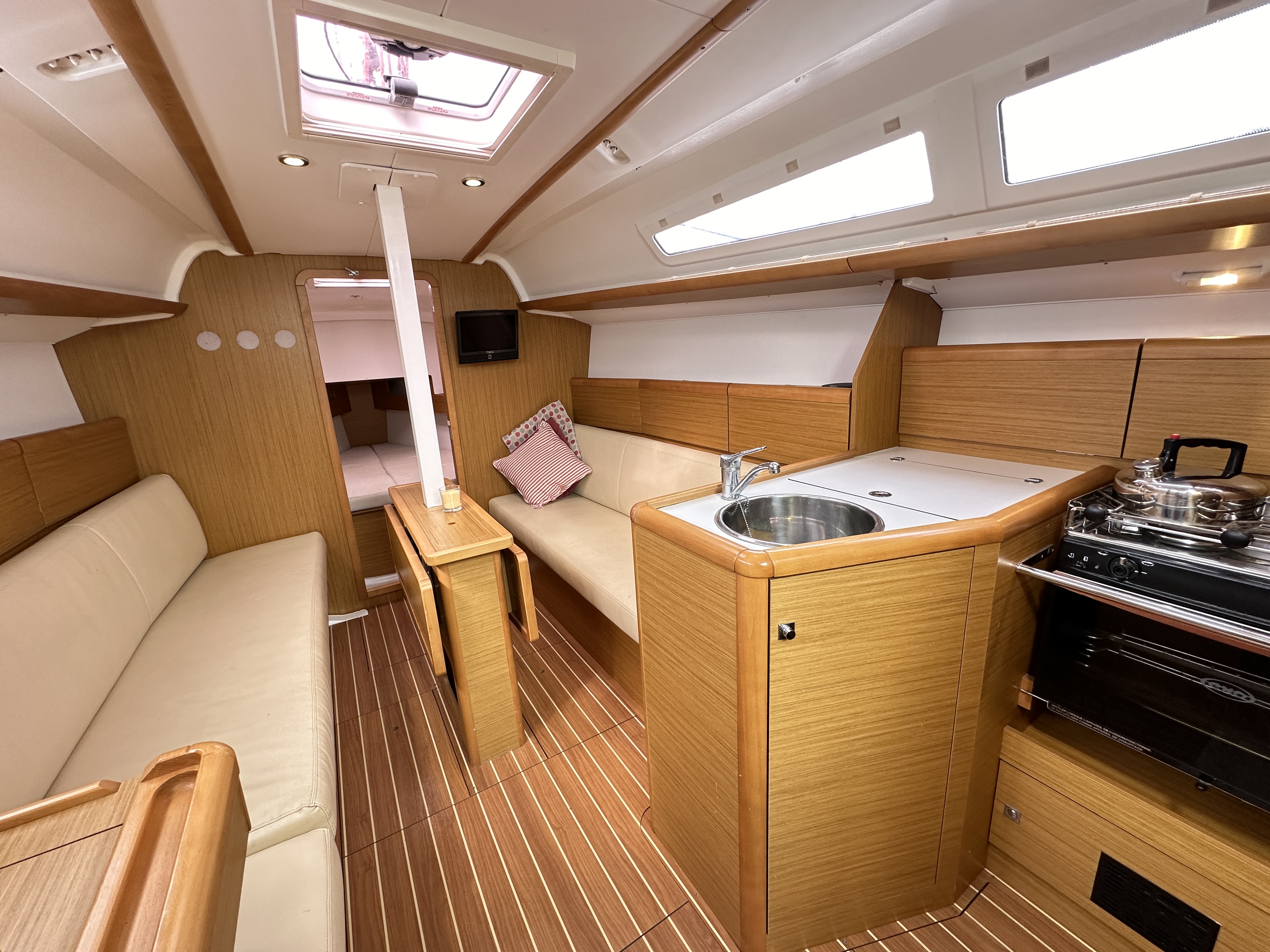 Light wood interior throughout with cream leatherette upholstery in the saloon and cream washable fabric in the cabins