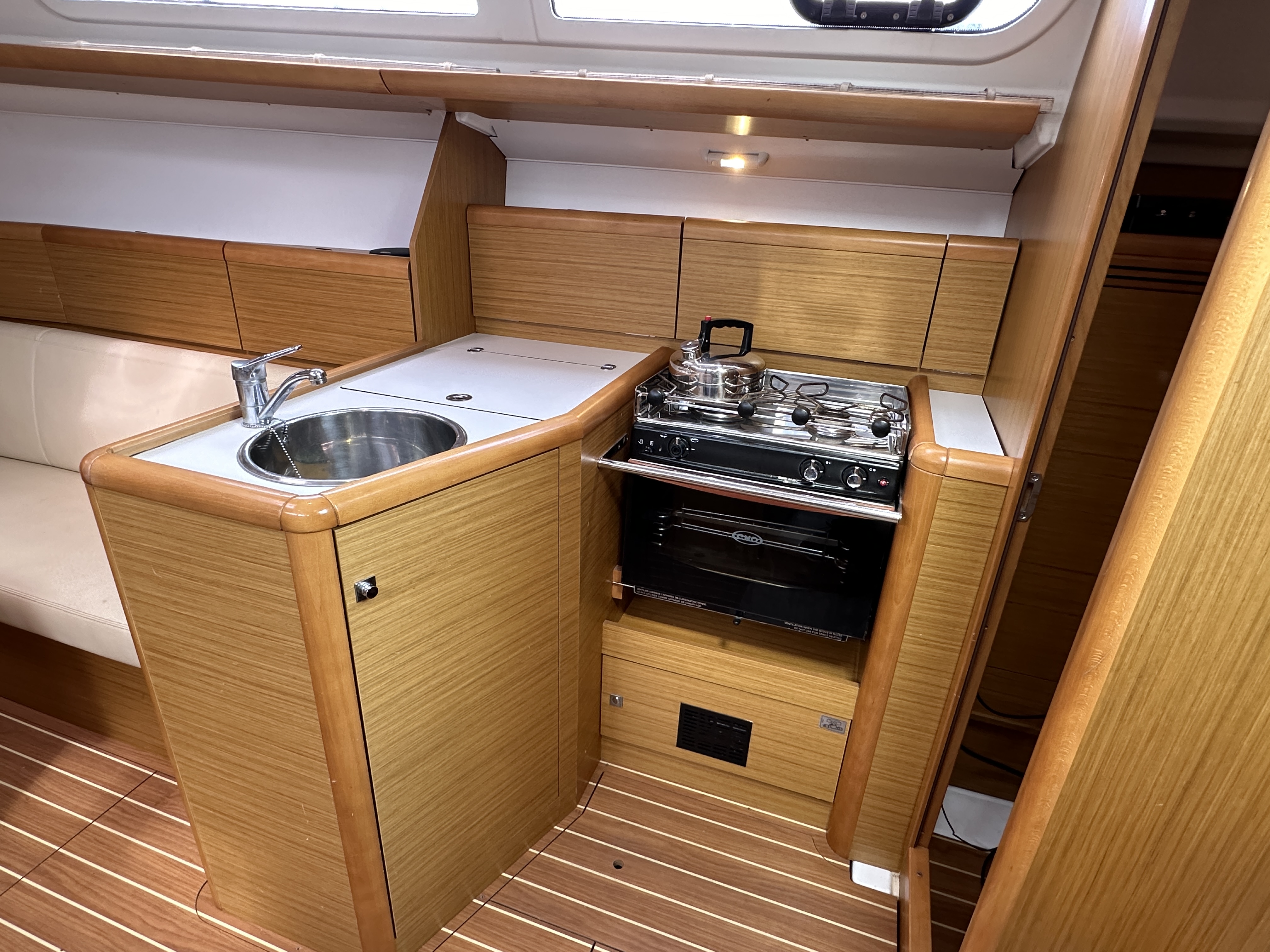 The galley to starboard is fully equipped with Stainless steel sink, two burner cooker with oven and grill and a 12v fridge.
