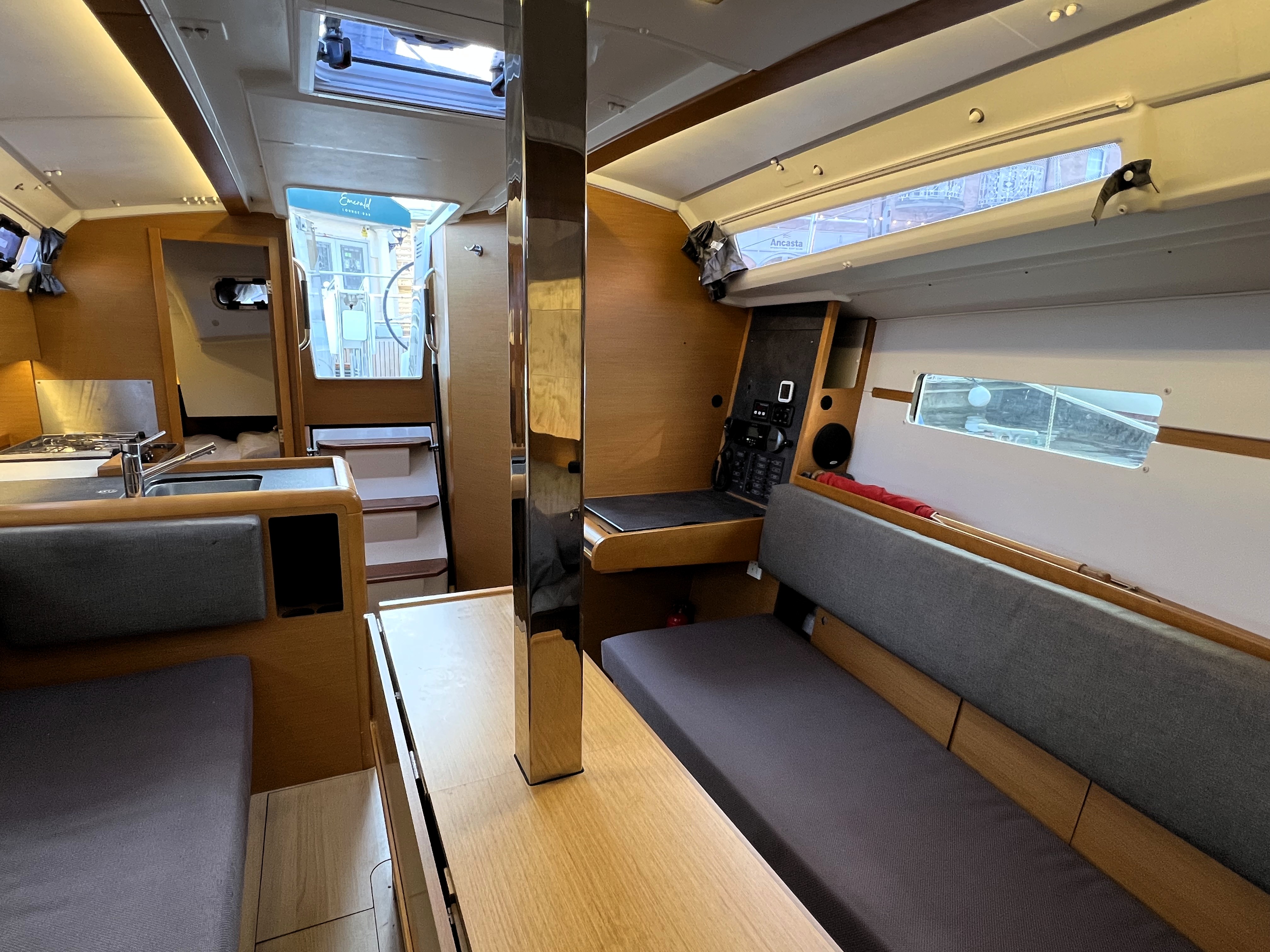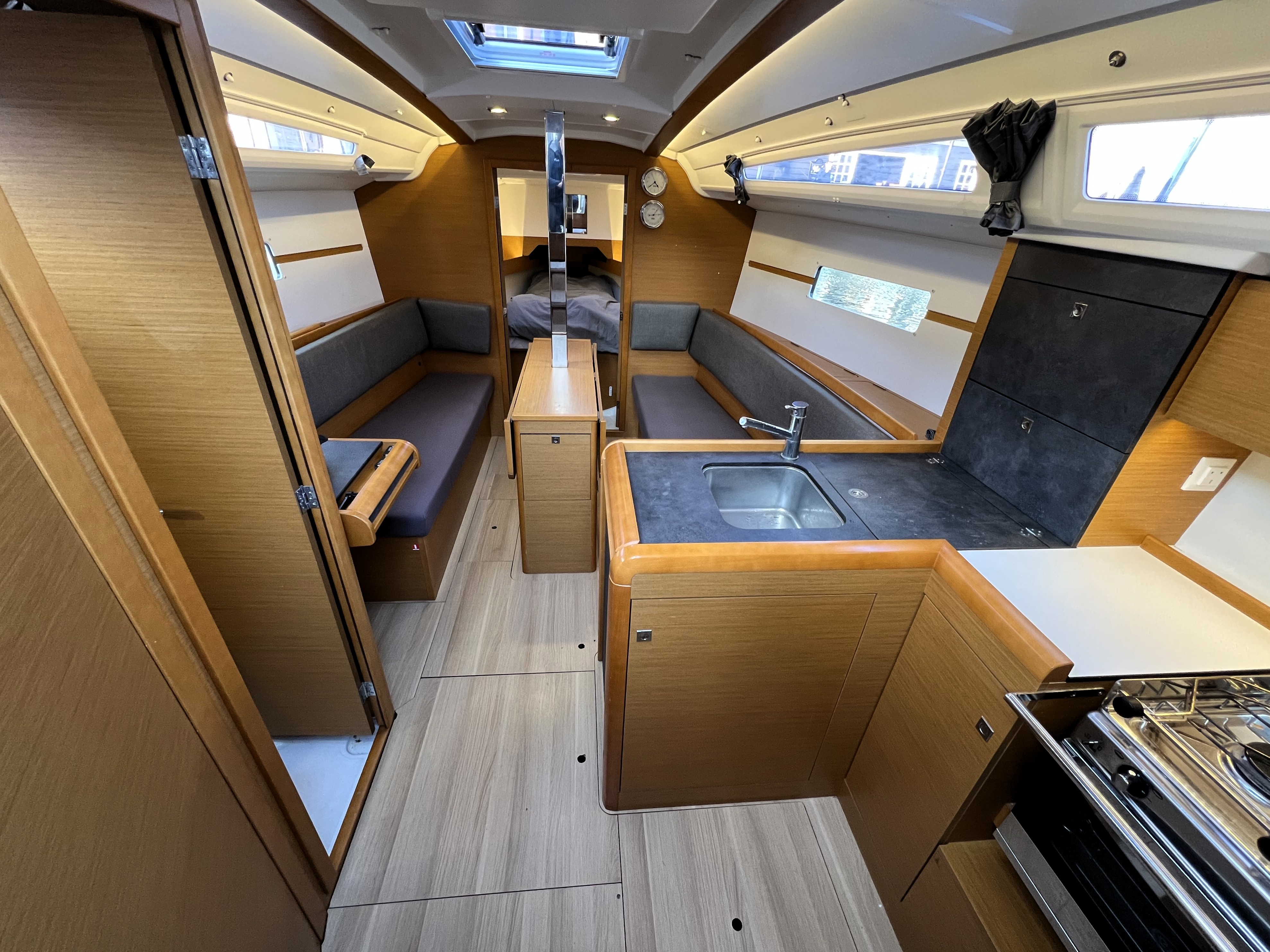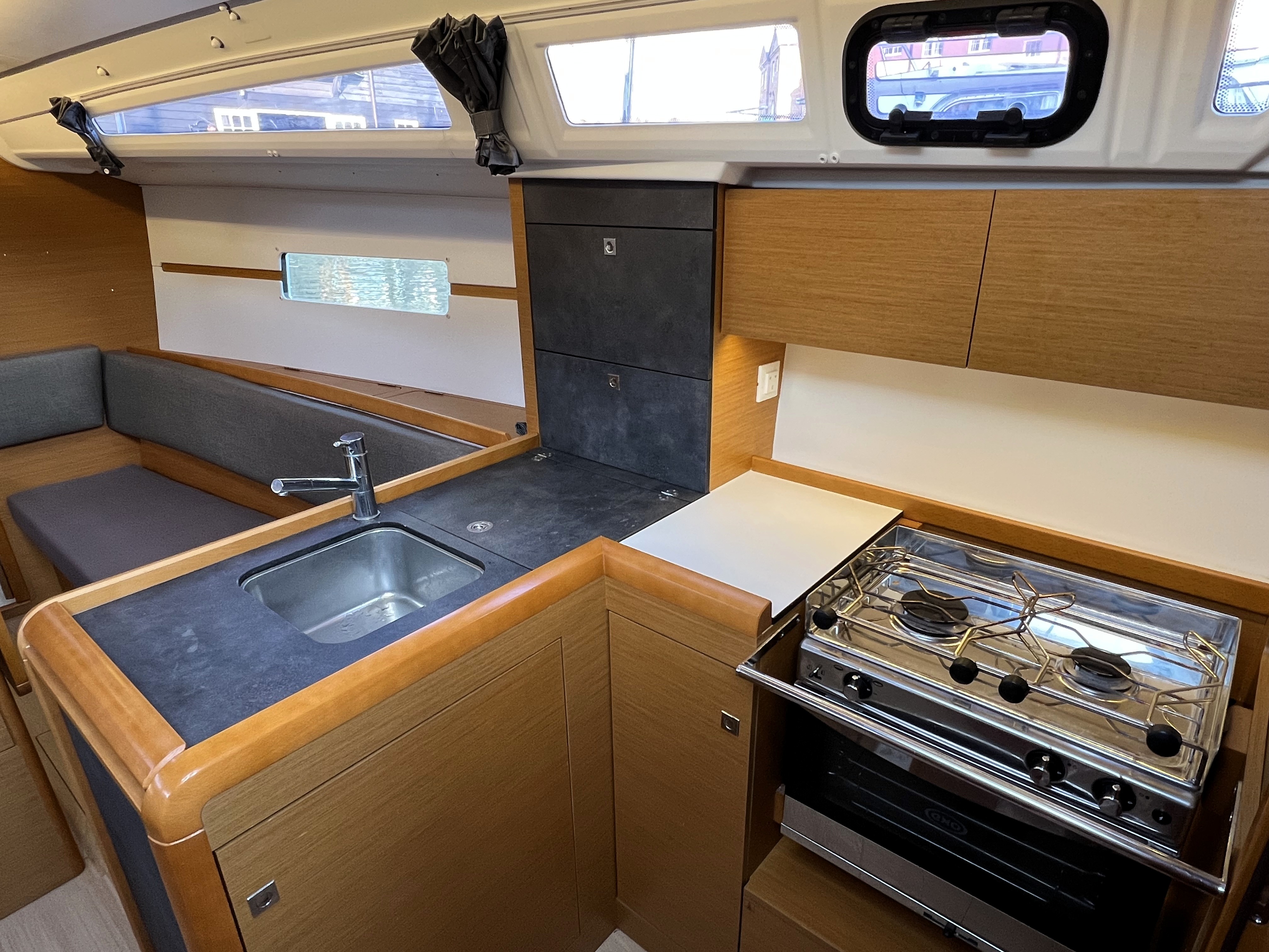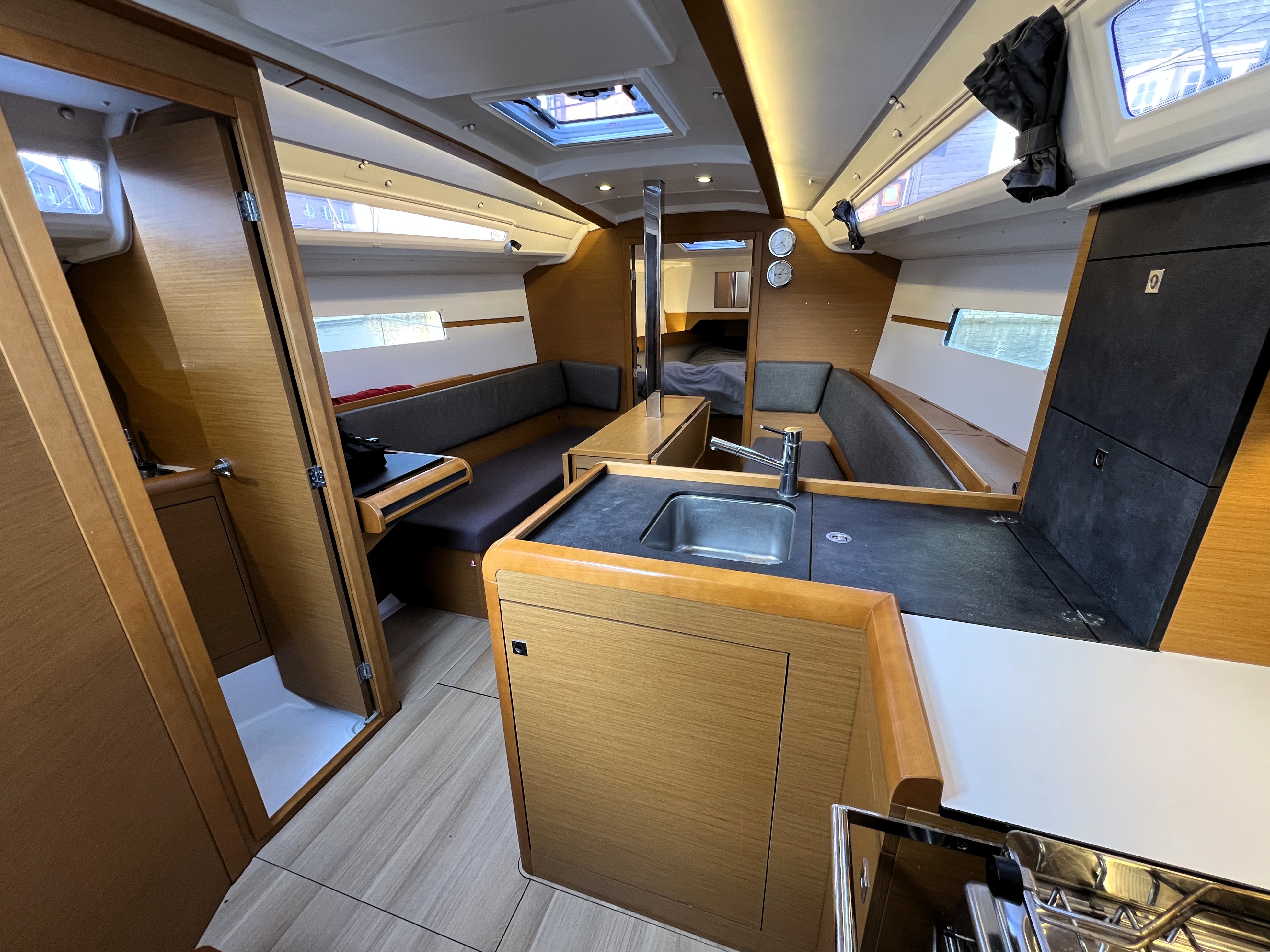 L-shaped galley to starboard with stainless steel sink.