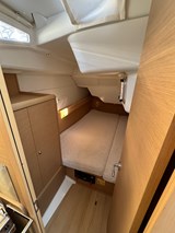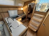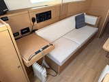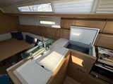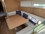 Saloon with U-shaped seating area to starboard (convertible in two berth), table with extension, storage. Seating to port. Navigation table with leatherette lining and hanging locker.