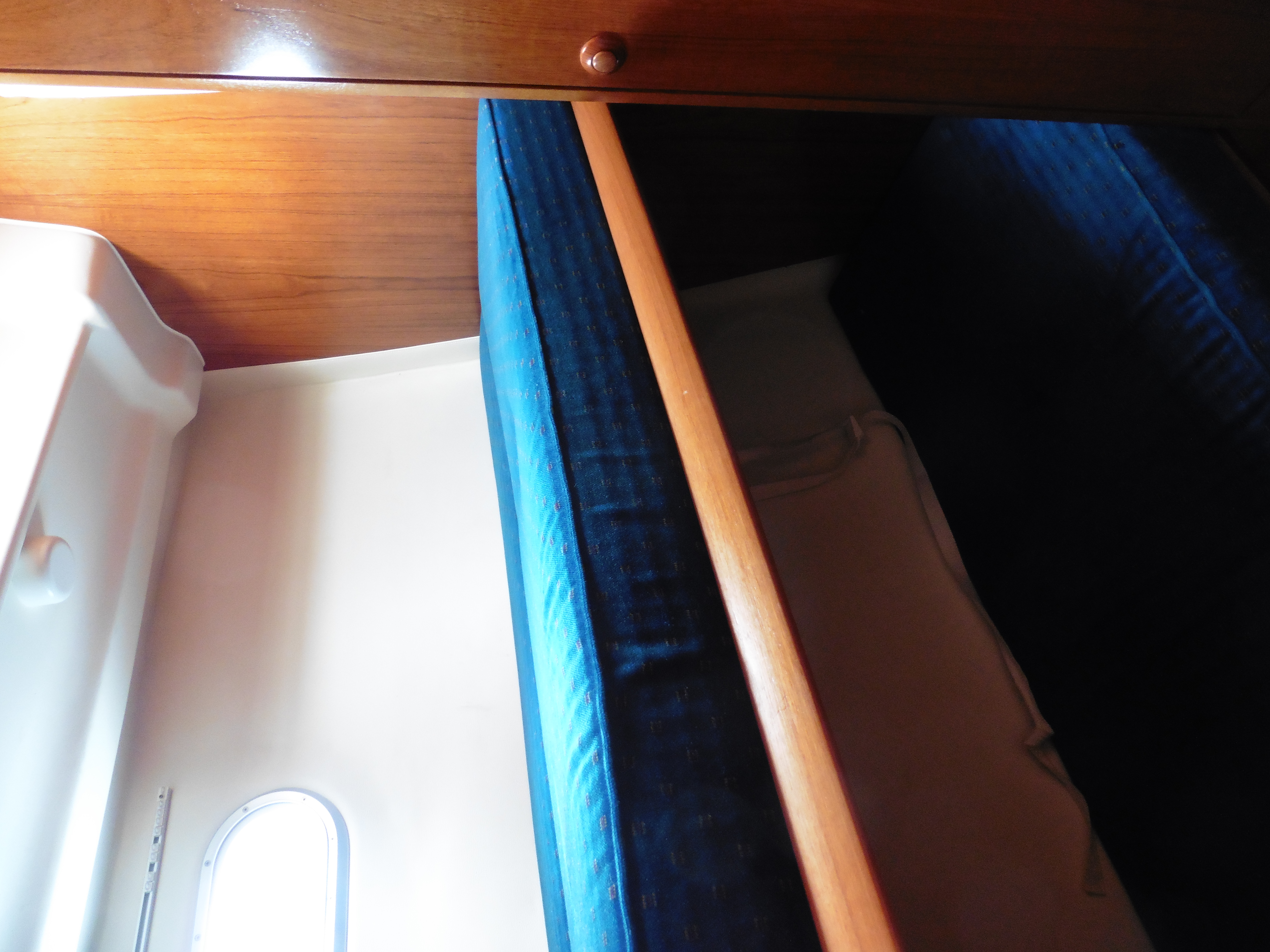 Fixed teak salon table with solid teak fiddle (lowers to create large double)