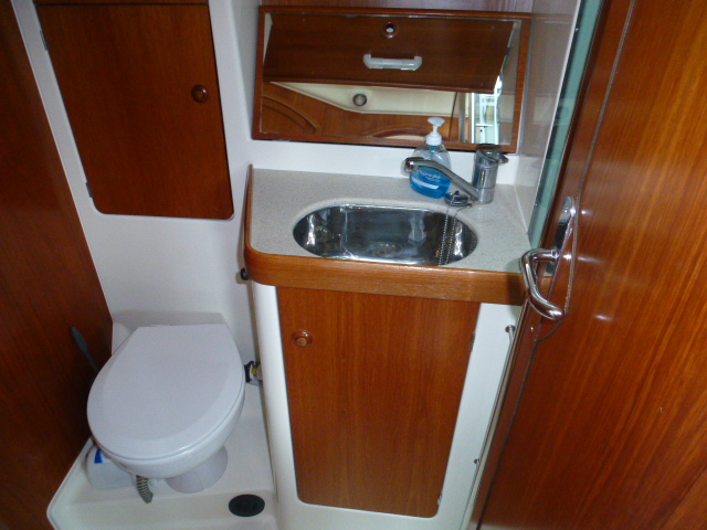 Aft head with Jabsco electric flush toilet, large shower with screen and hand basin