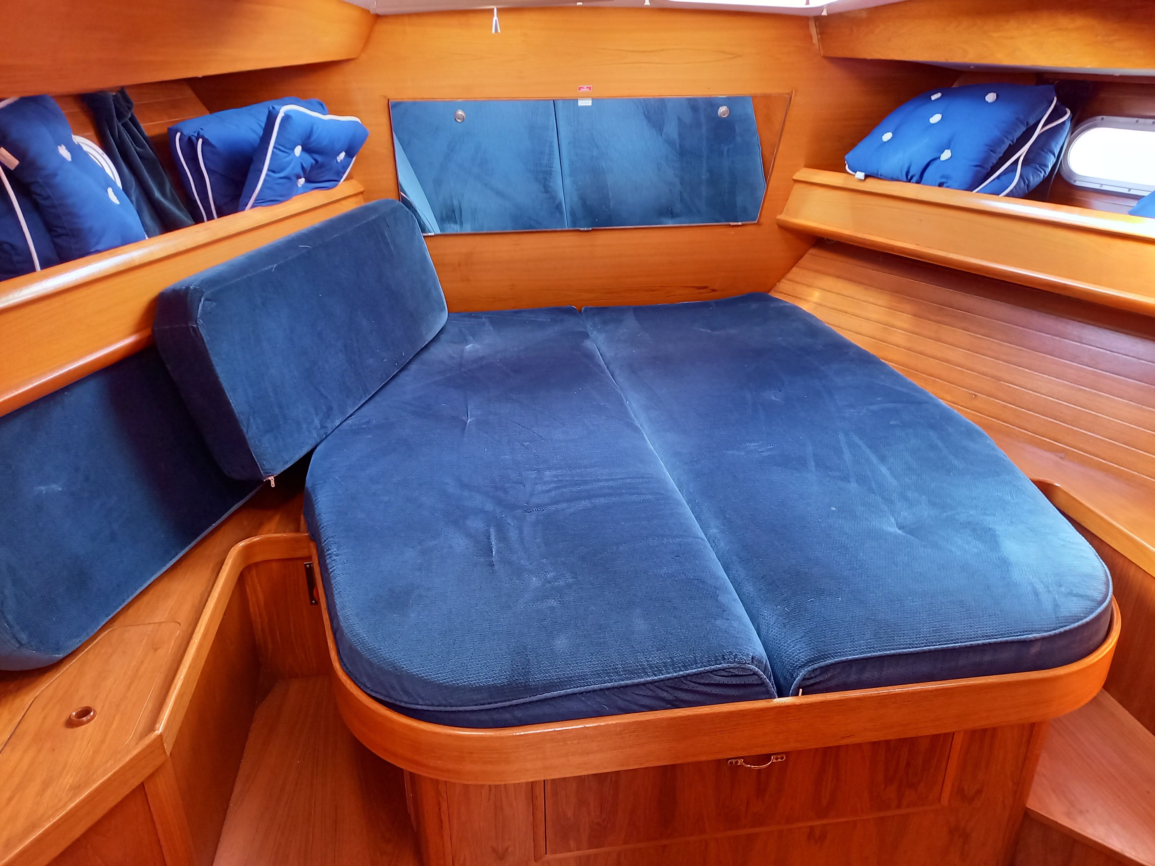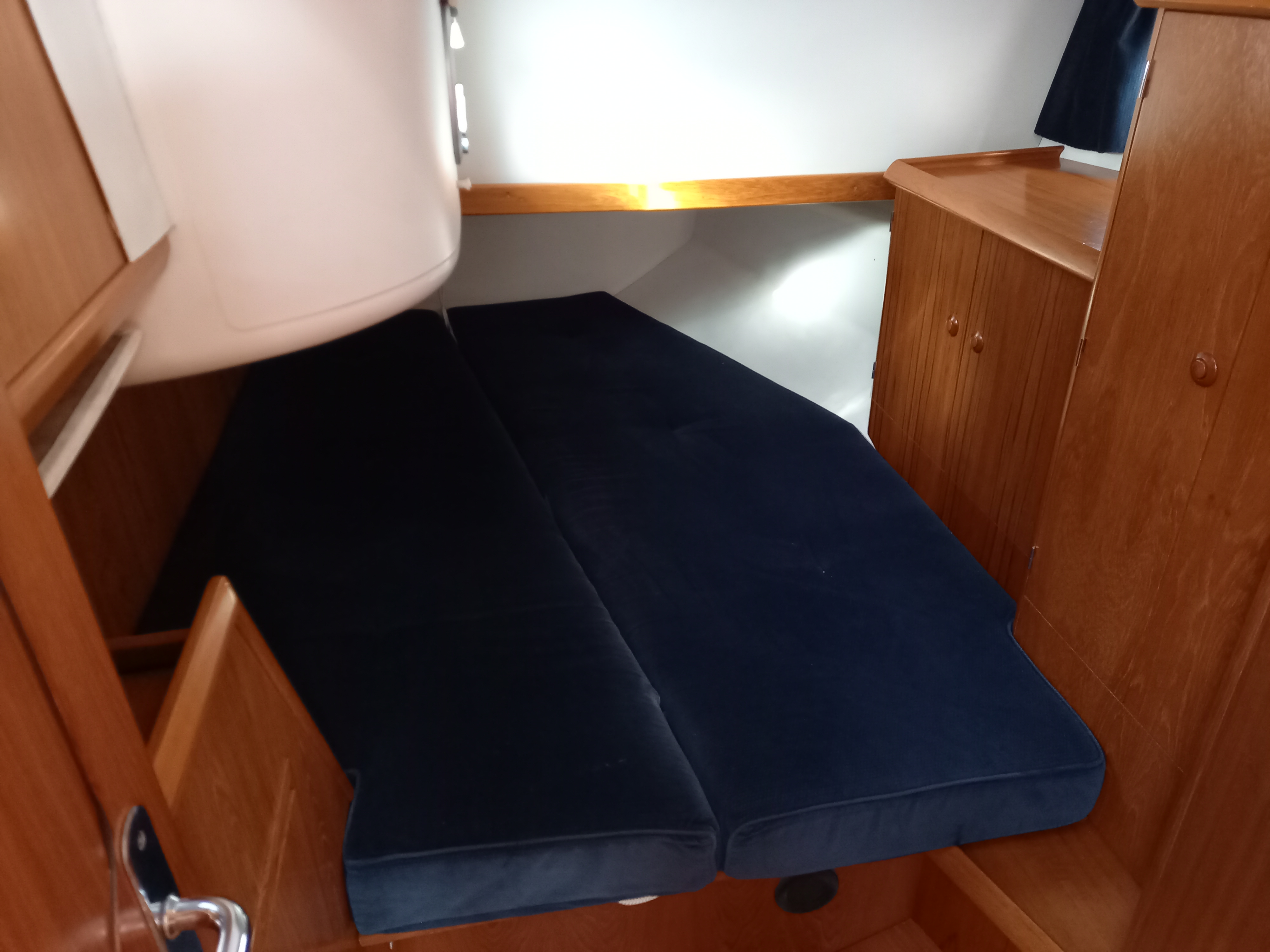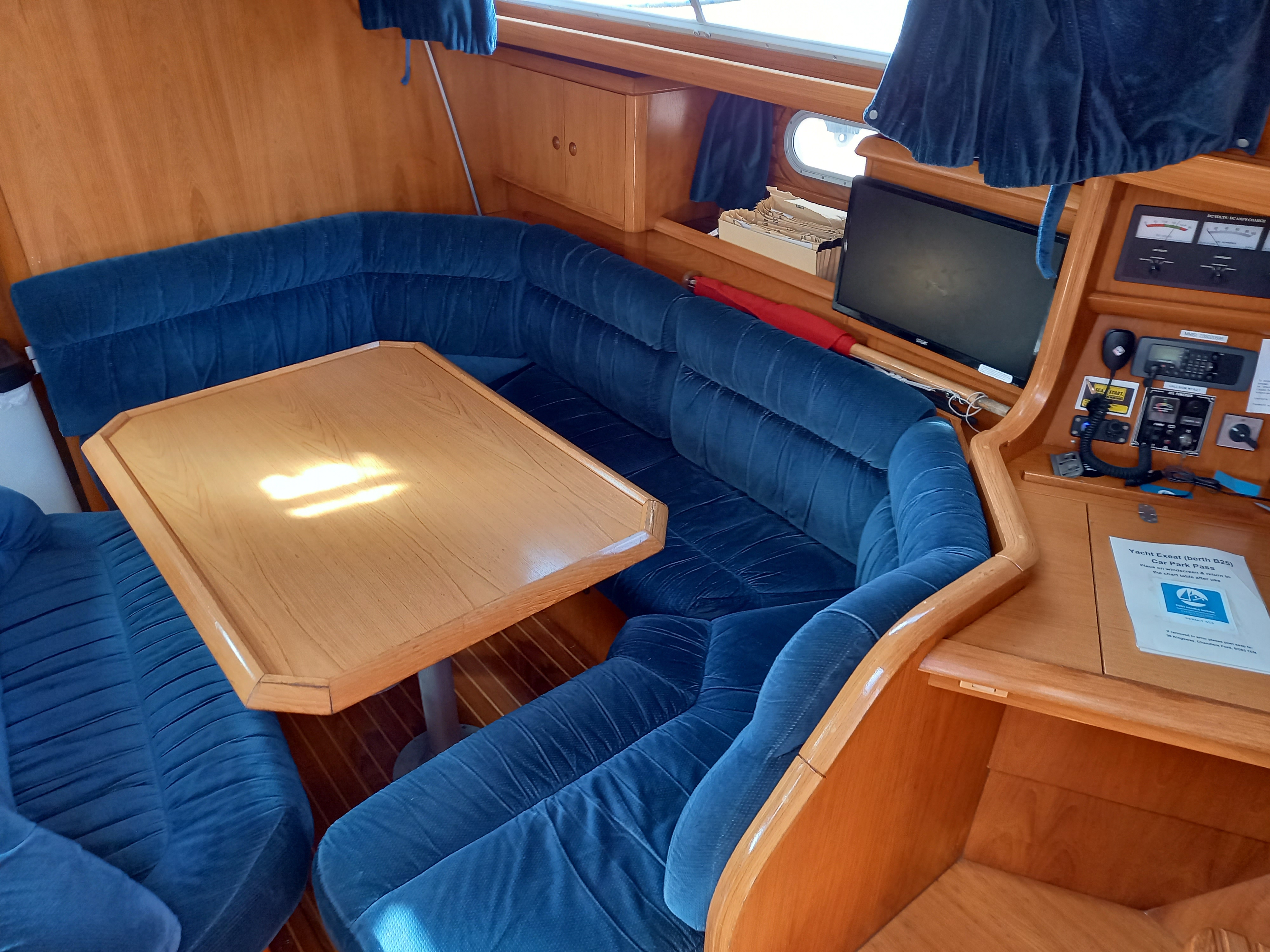 In the saloon there is a wrap-around settee to starboard and a free-standing seat on the centreline enclosing a large, handsome teak table that can comfortably seat 6 for dinner. There are lockers behind the settees for storage and space for the television.