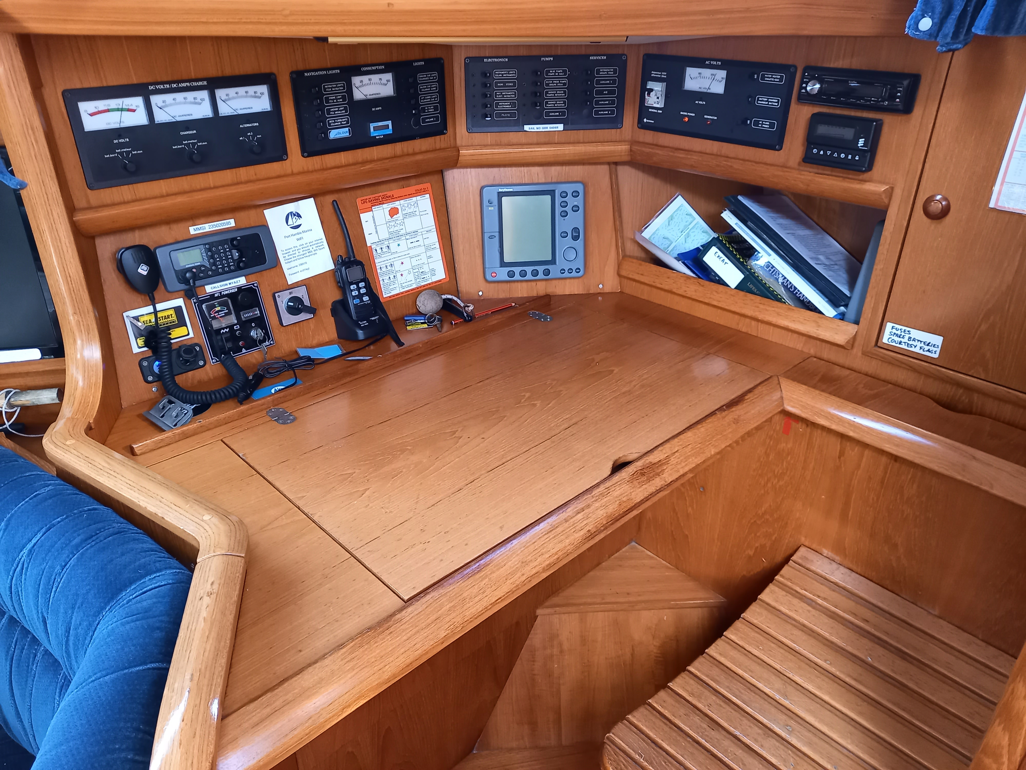 Further aft and to starboard is the nav station, which is oriented 30 degrees off center and tucked under the side deck. The desktop is large and houses the electronics and electrical switches. Besides being located out of the main traffic flow, there is a nice sense of privacy, making this space ideal for an on-board office. The aft head is located opposite. Like the forward head, it is completely moulded in fiberglass, which makes splashing water around less troublesome and complete with electric flush heads.