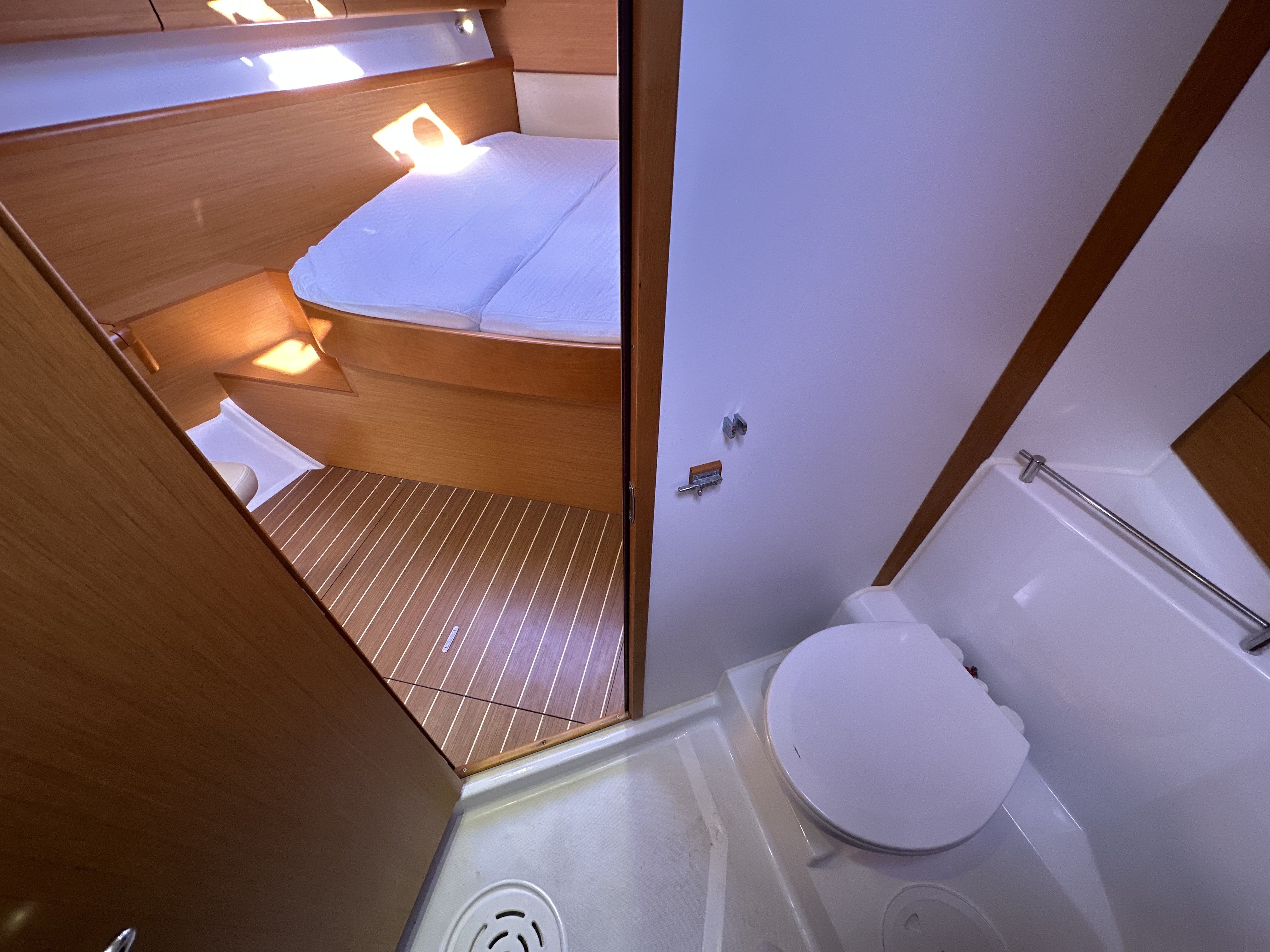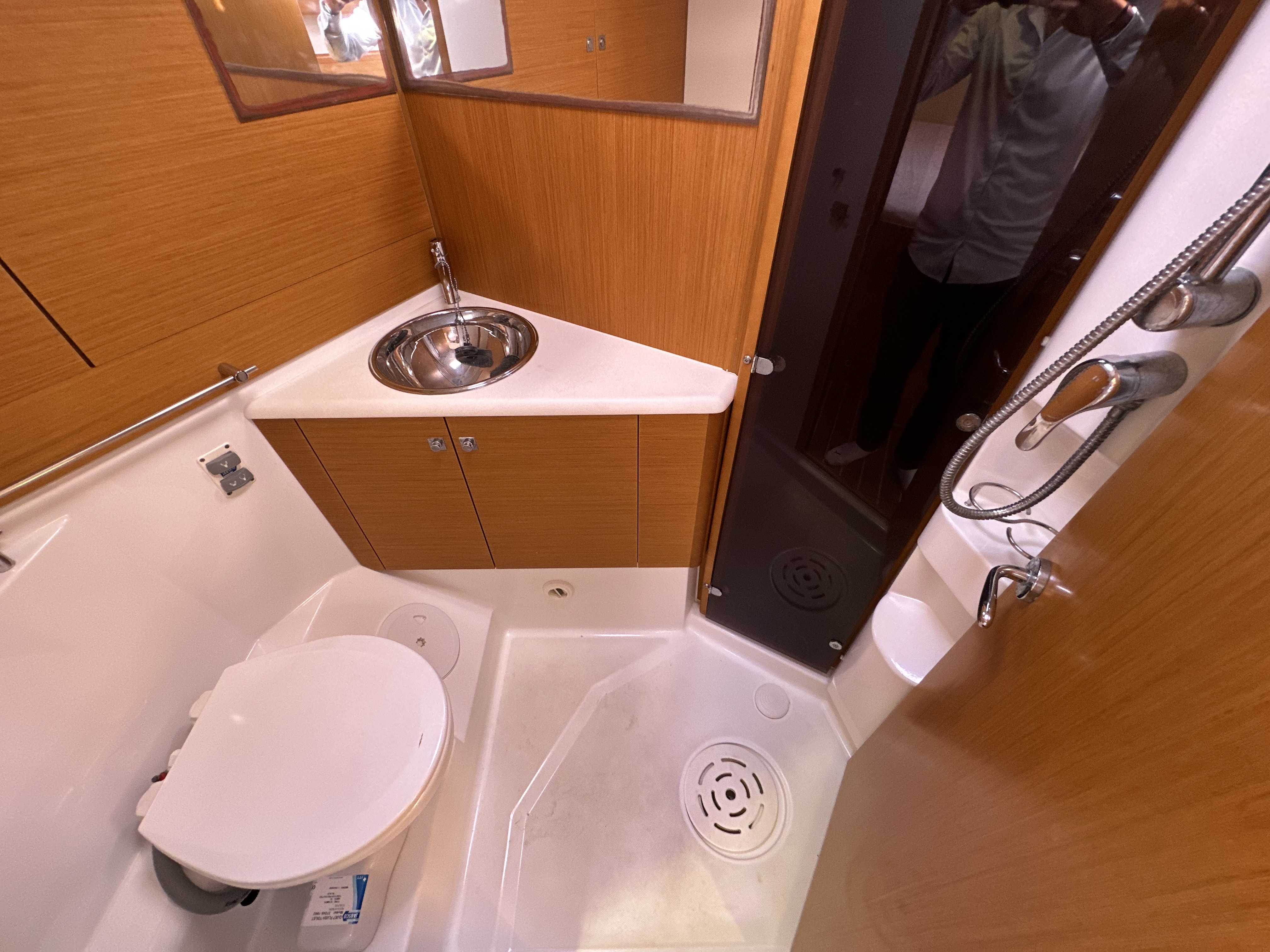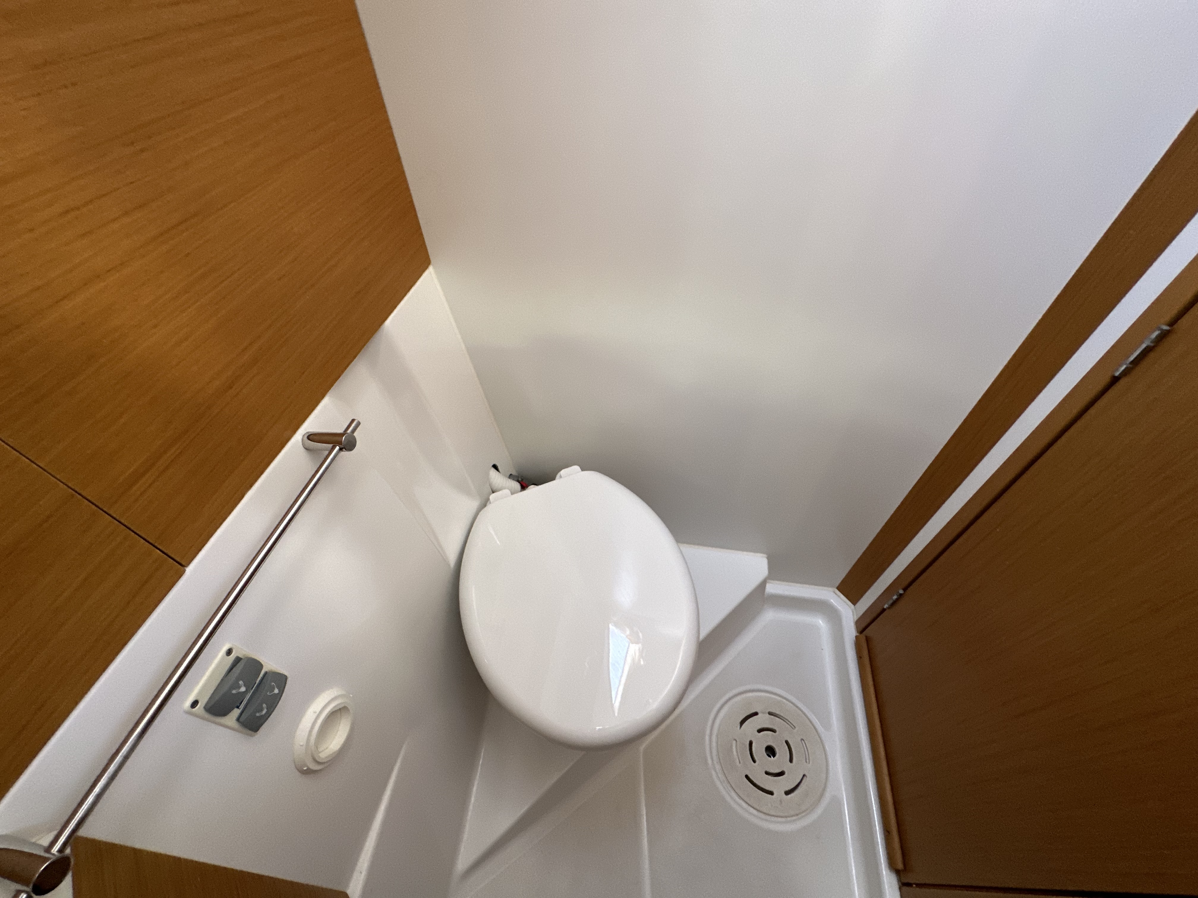 Guest heads has hand basin, shower and electric flush sea toilet (replaced in 2022)