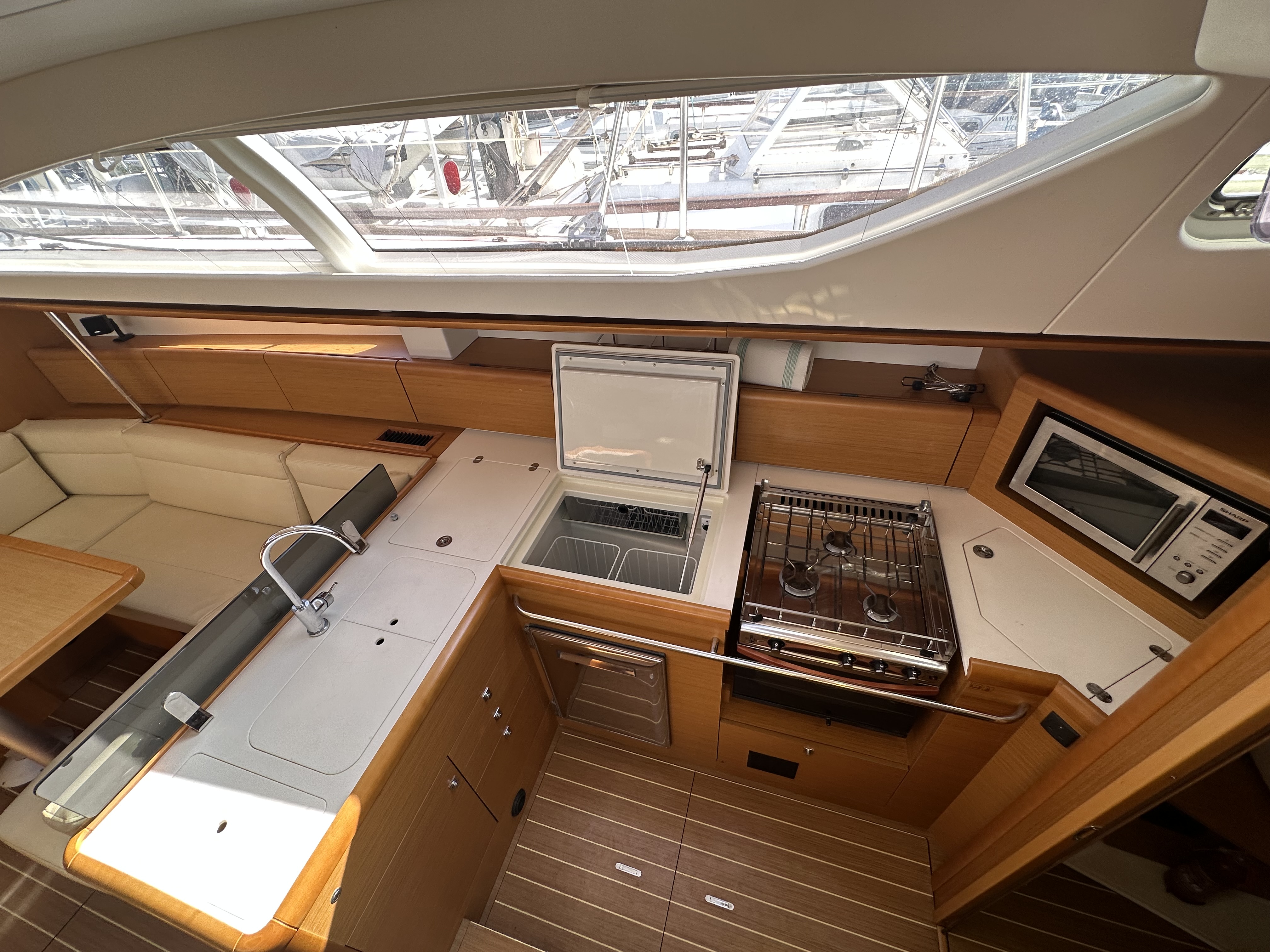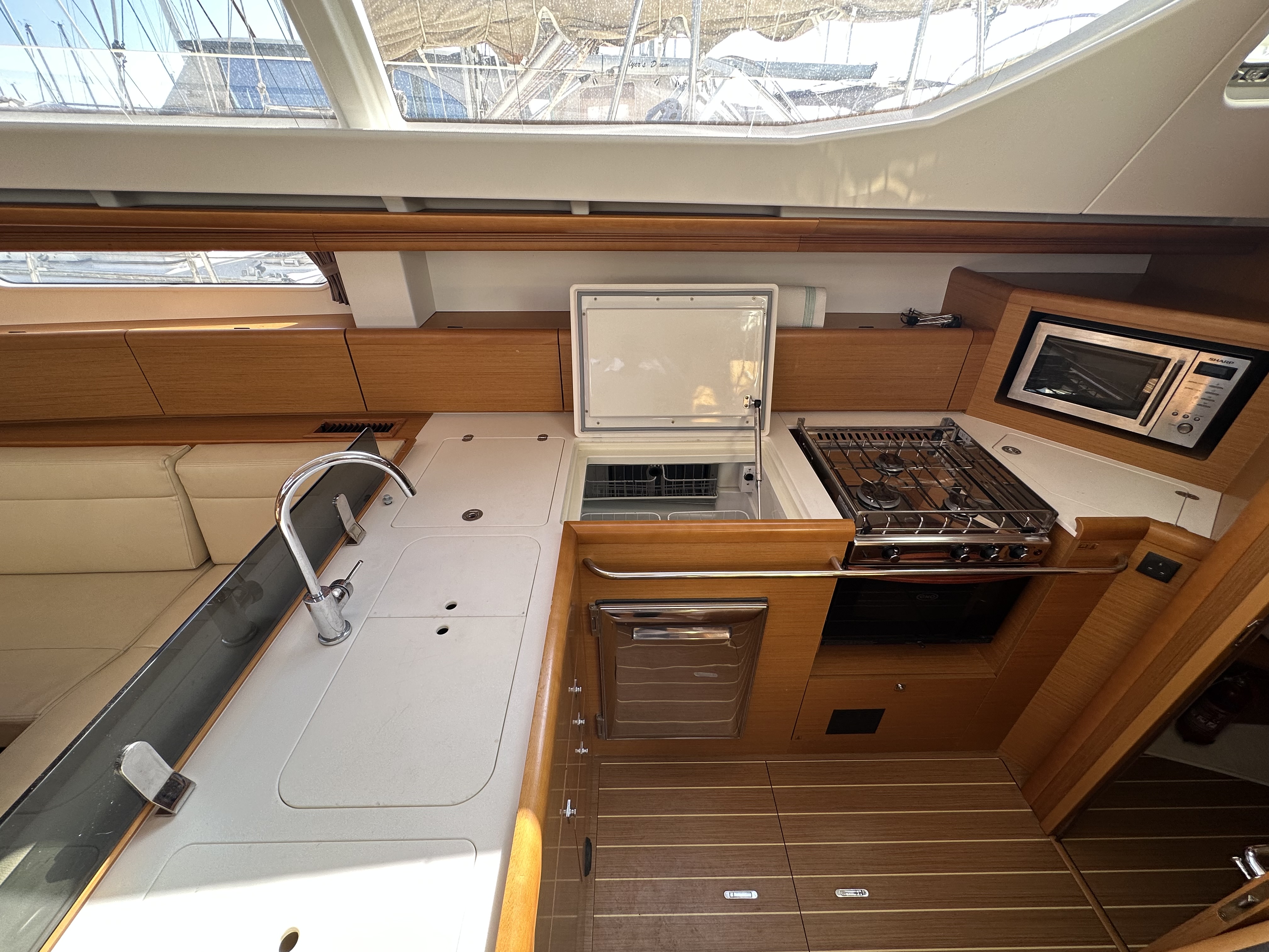 The galley to starboard is very well equipped and practical and comes with an Eno three-burner stainless steel stove with grill, double 12v fridge with two opening lids and storage bins, 12v freezer unit with dual thermostat, microwave oven, twin stainless steel sinks with mixer tap and plenty of work surfaces