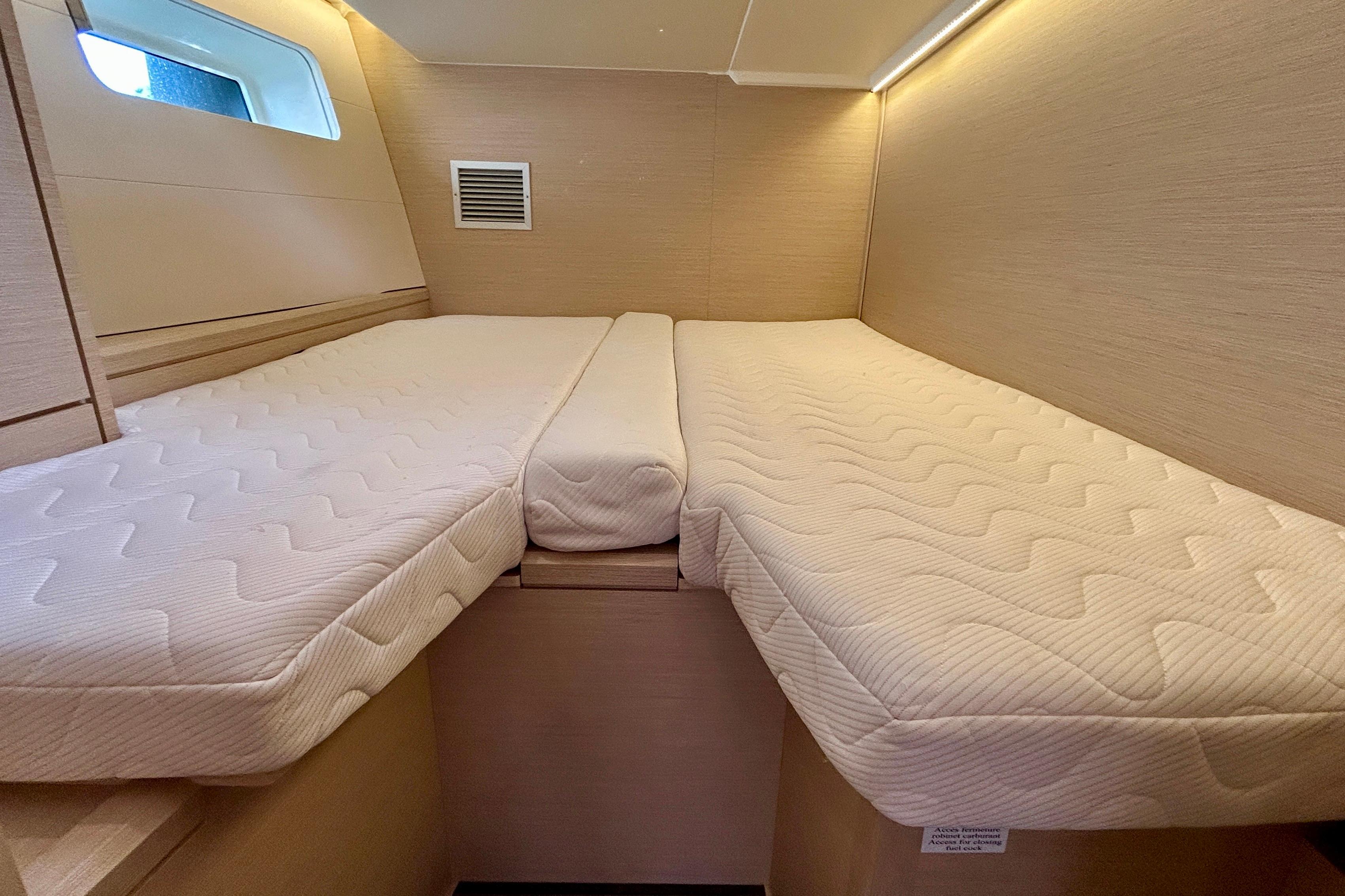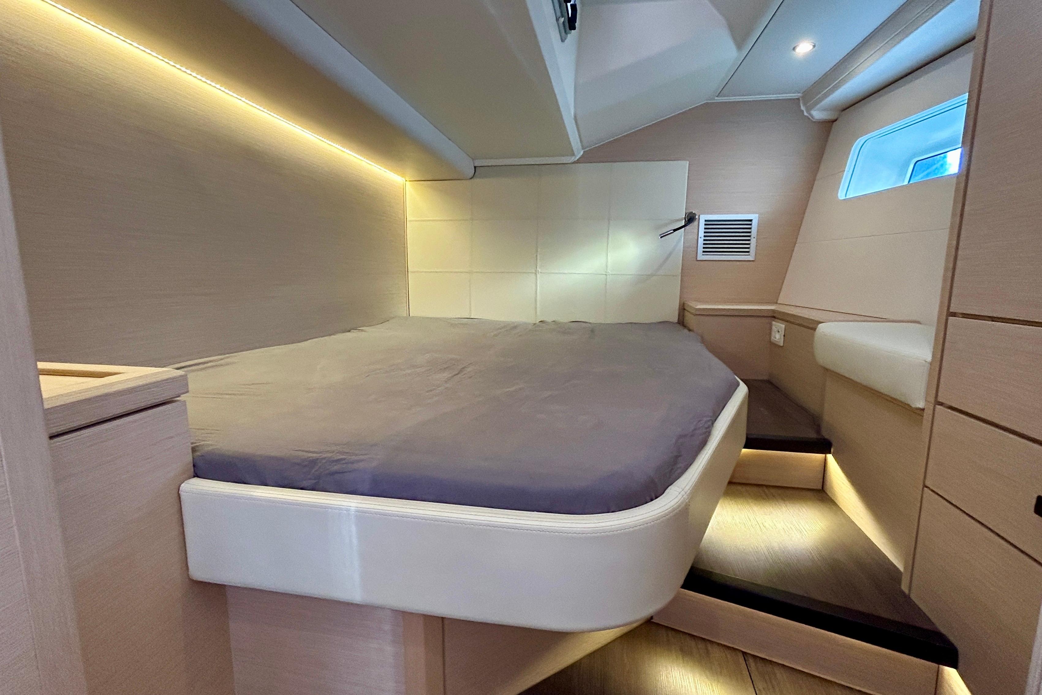 À bord, tout respire l’art de vivre en mer. Le cockpit, vaste comme une terrasse flottante, accueille les moments partagés, tandis que les aménagements soignés enveloppent l’équipage d’un confort chaleureux. Chaque détail du plan de pont dégagé aux volumes intérieurs baignés de lumière témoigne d’une recherche d’harmonie entre élégance, sécurité et plaisir.