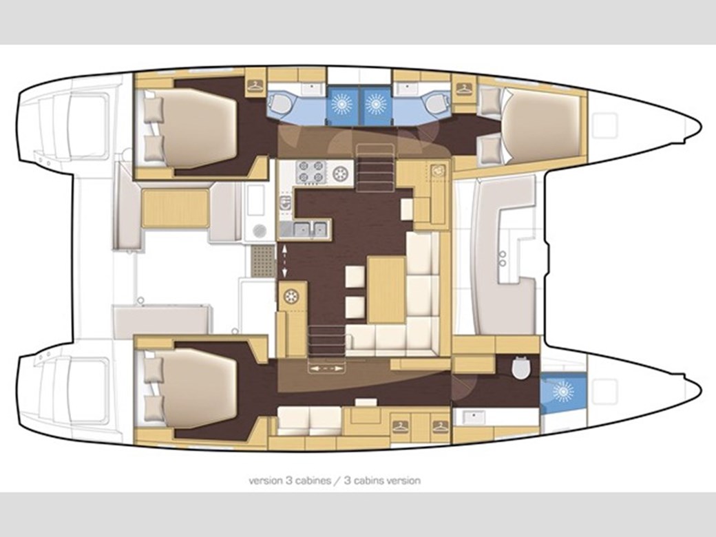 Queen-size 2 berth island bed (2,04m / 6’7”x 1,60m / 5’2” at widest point) with optional under bed spring slats, in starboard aft hull