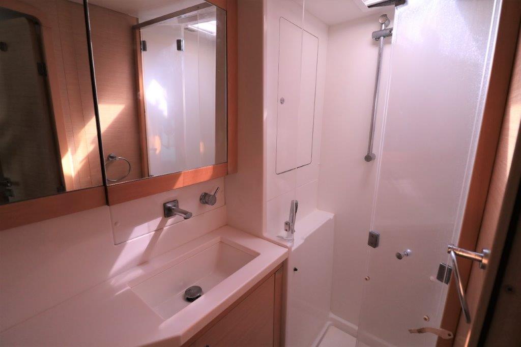 En-suite head in starboard bow with separate shower enclosure, optional electric quiet flush marine toilet and sink with mixer tap and wooden floor
