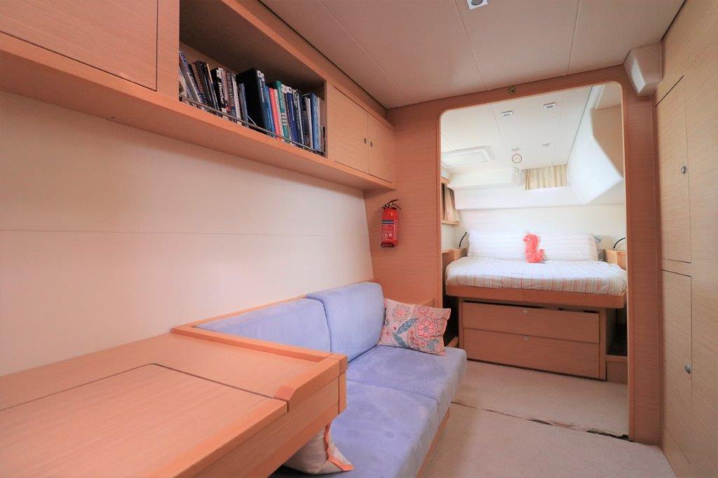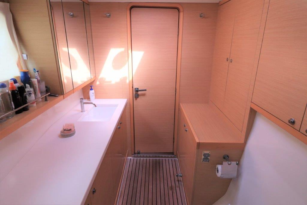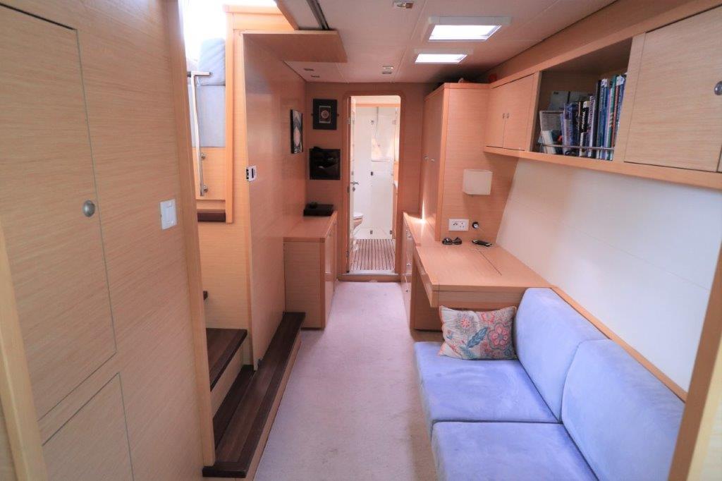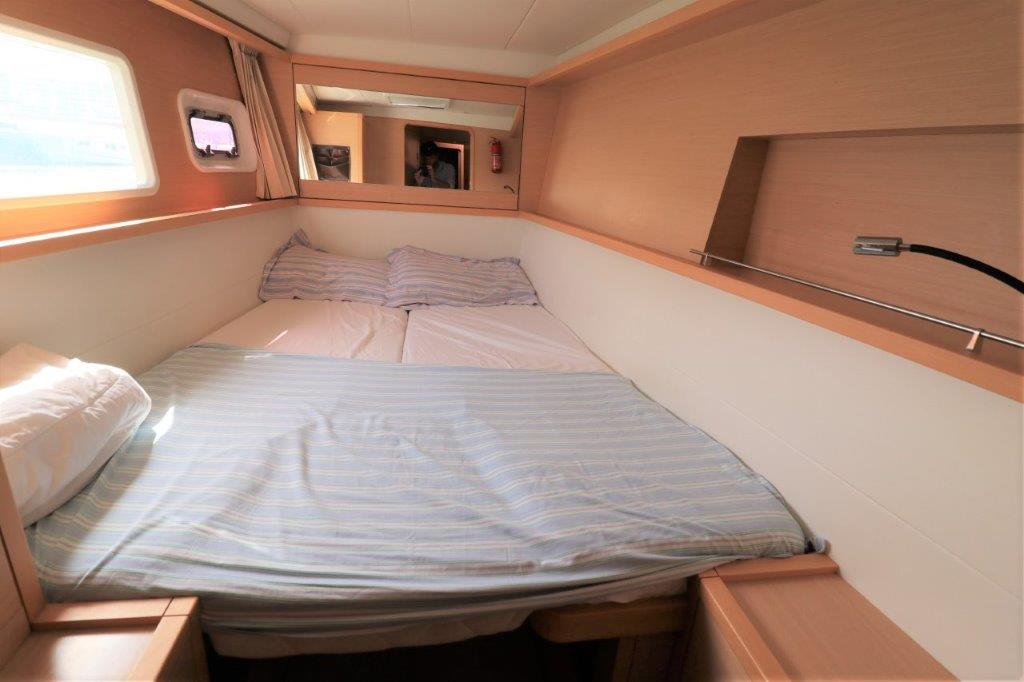Queen-size 2 berth island bed (2,04m / 6’7”x 1,60m / 5’2” at widest point) with optional under bed spring slats, in starboard aft hull