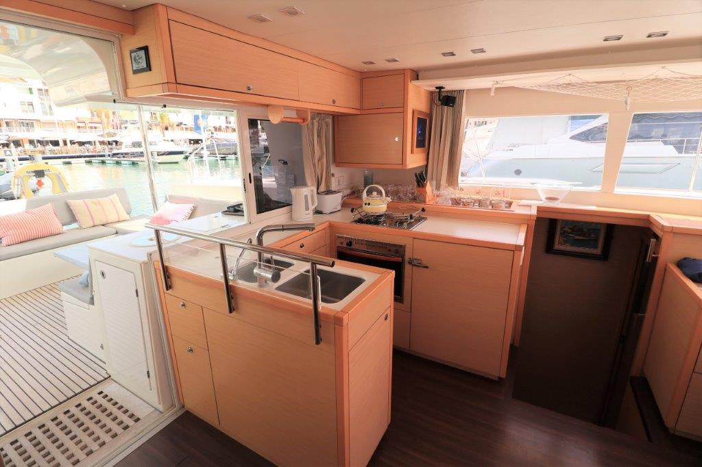 Galley in main saloon to port with direct access to cockpit through sliding window