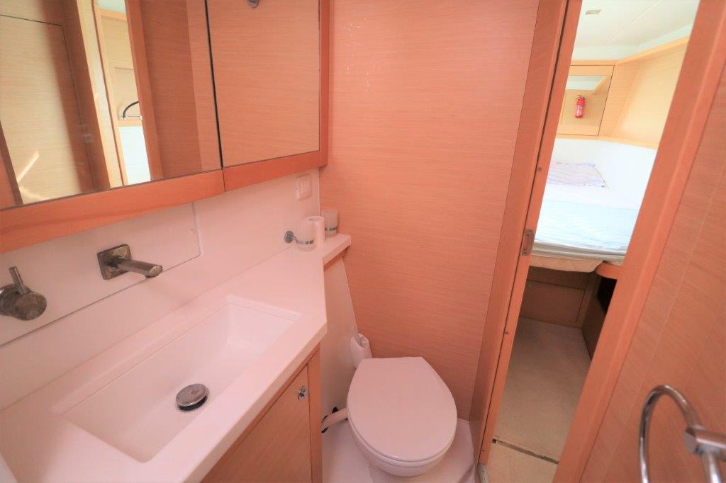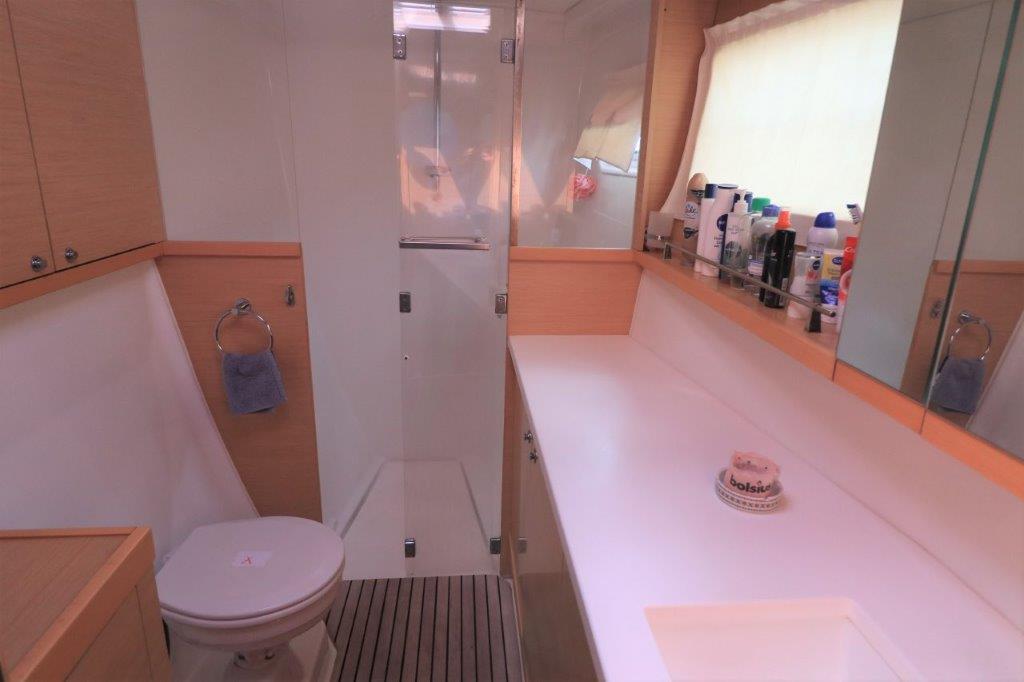 En-suite head with separate shower, optional electric quiet flush marine toilet and sink with mixer tap