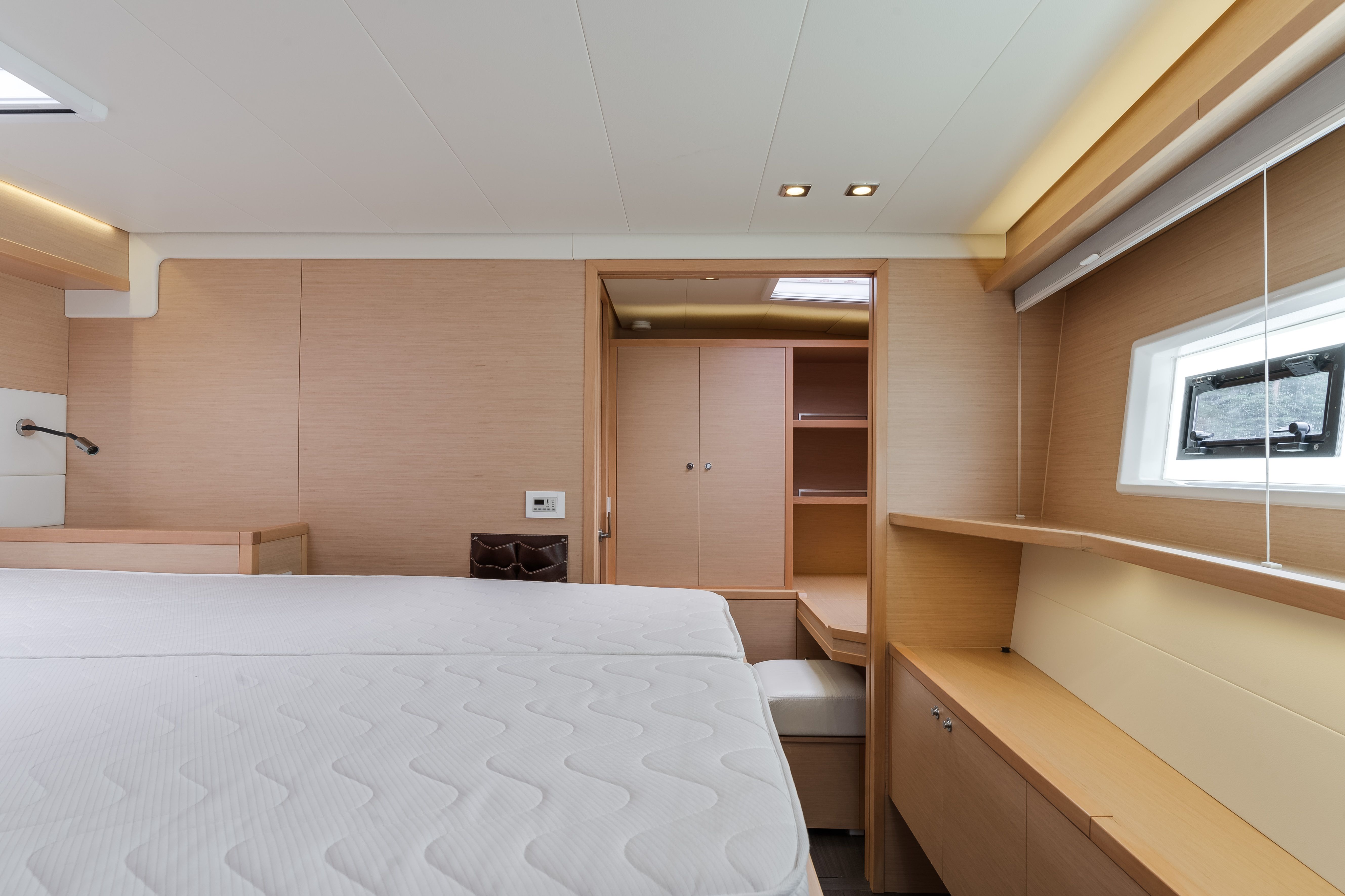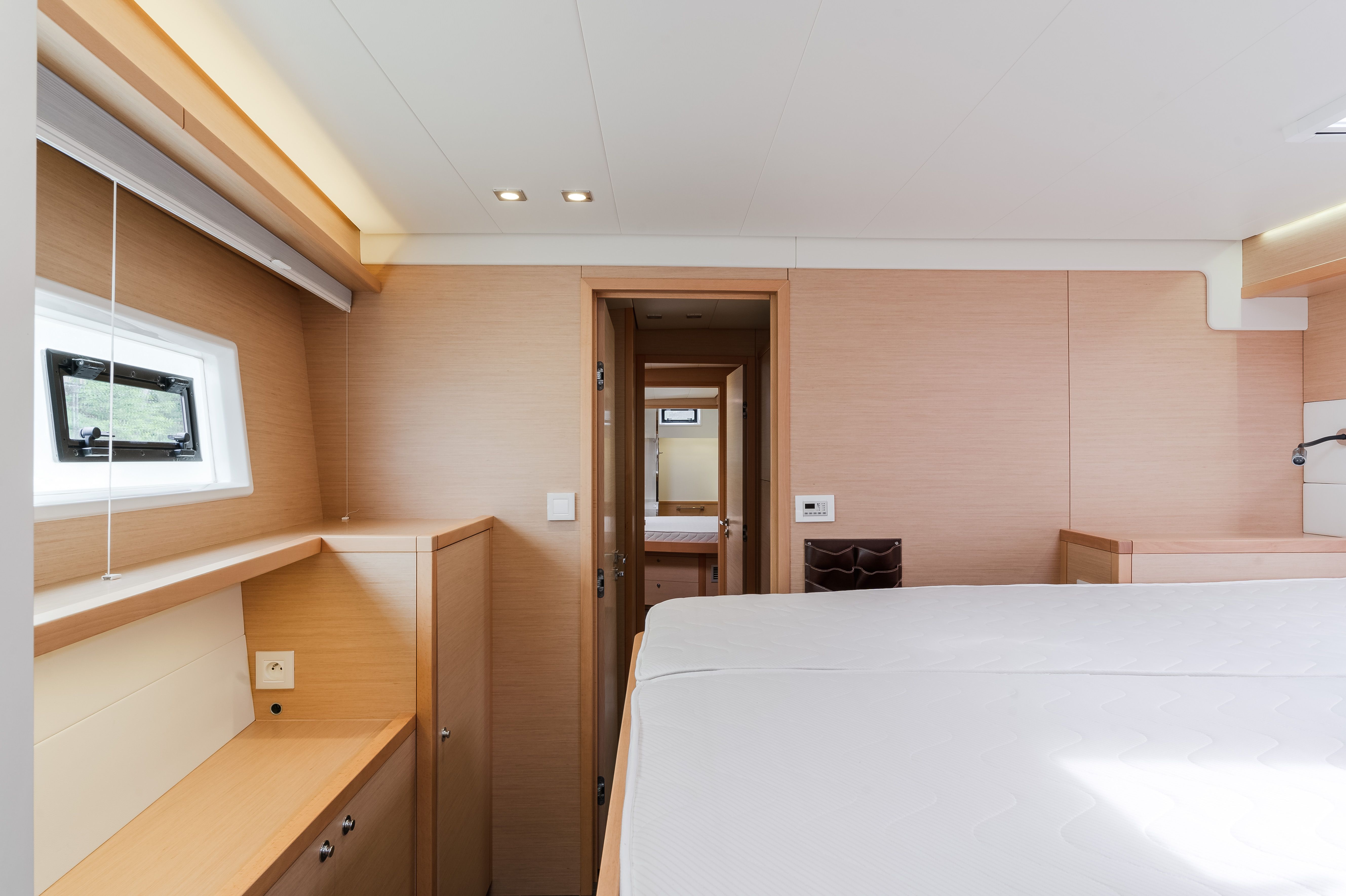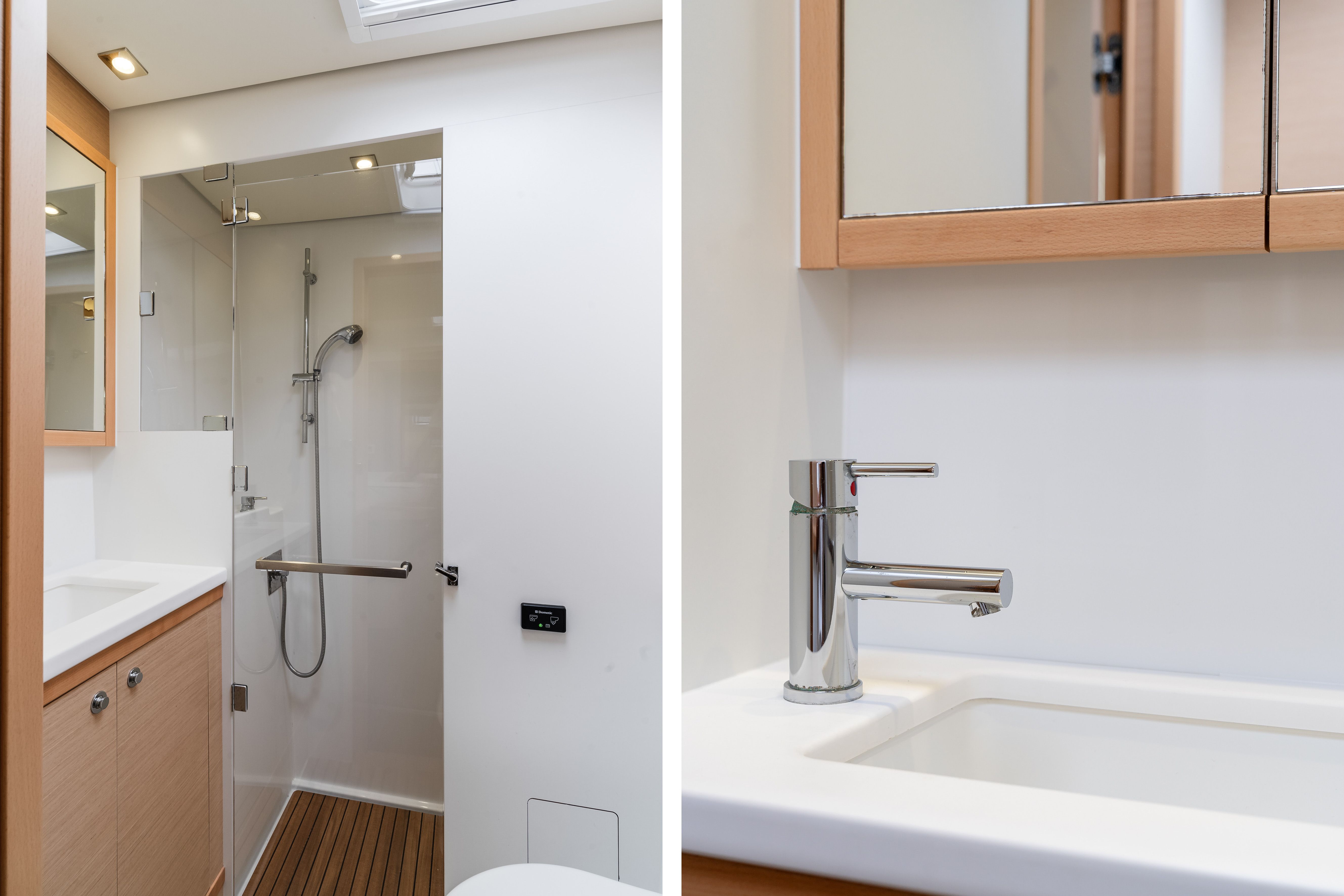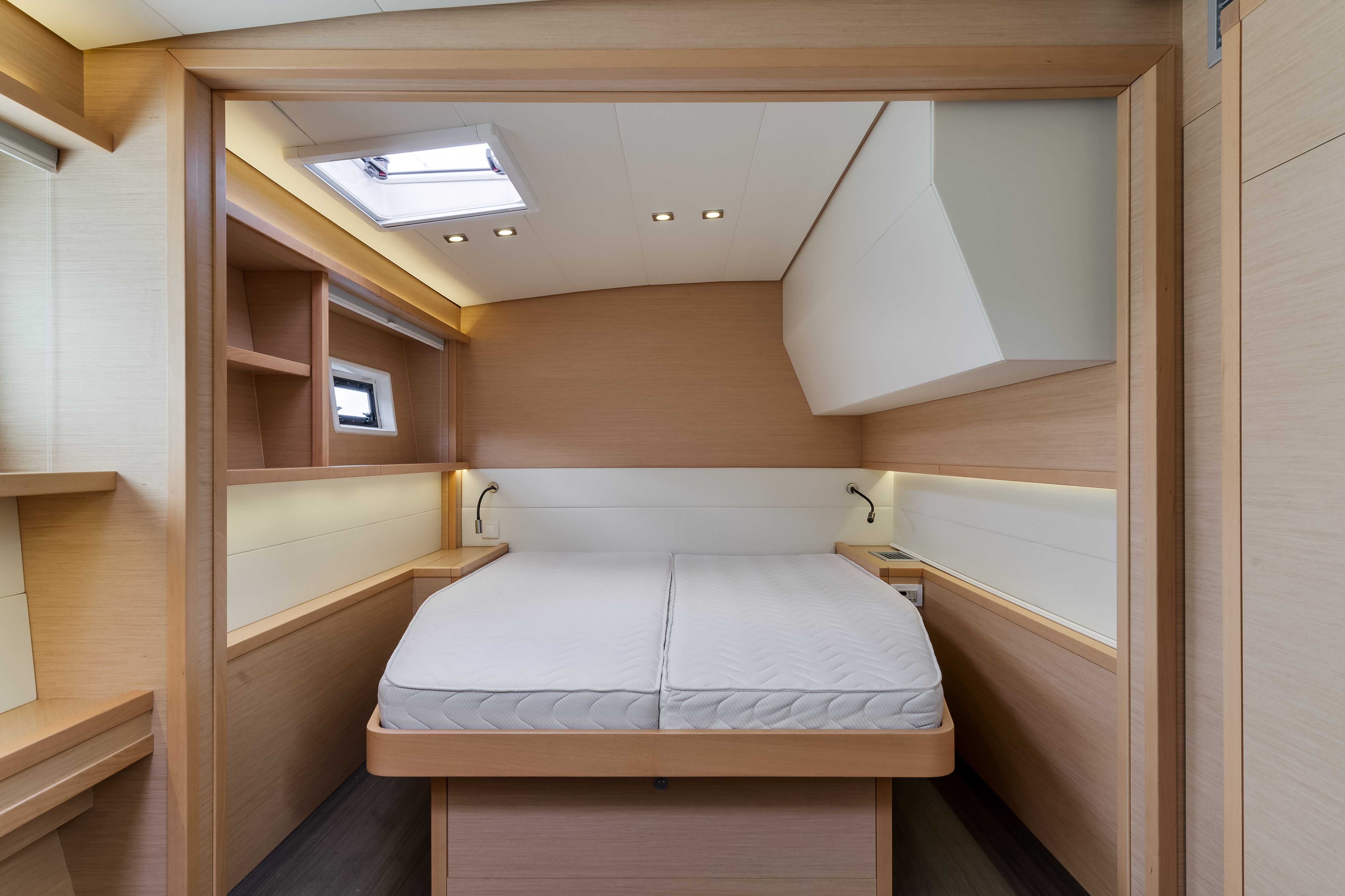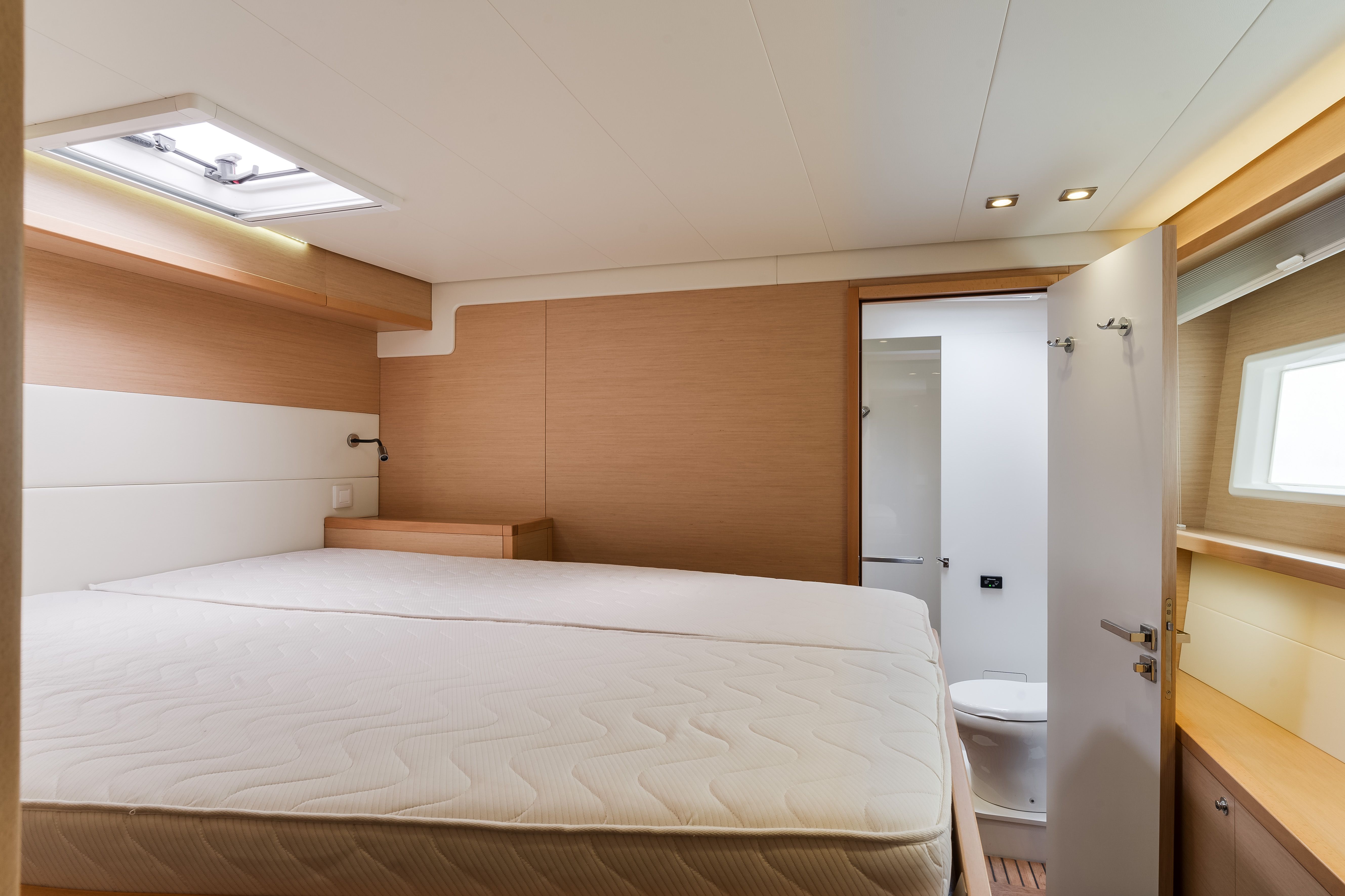 Four cabins with double berths with slats and matrasses, dressing table & stool, storage and en suite facilities including shower enclosures, quiet-flush electric marine toilets and hand basin