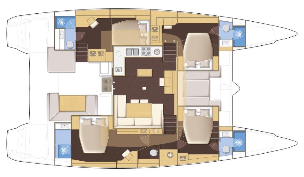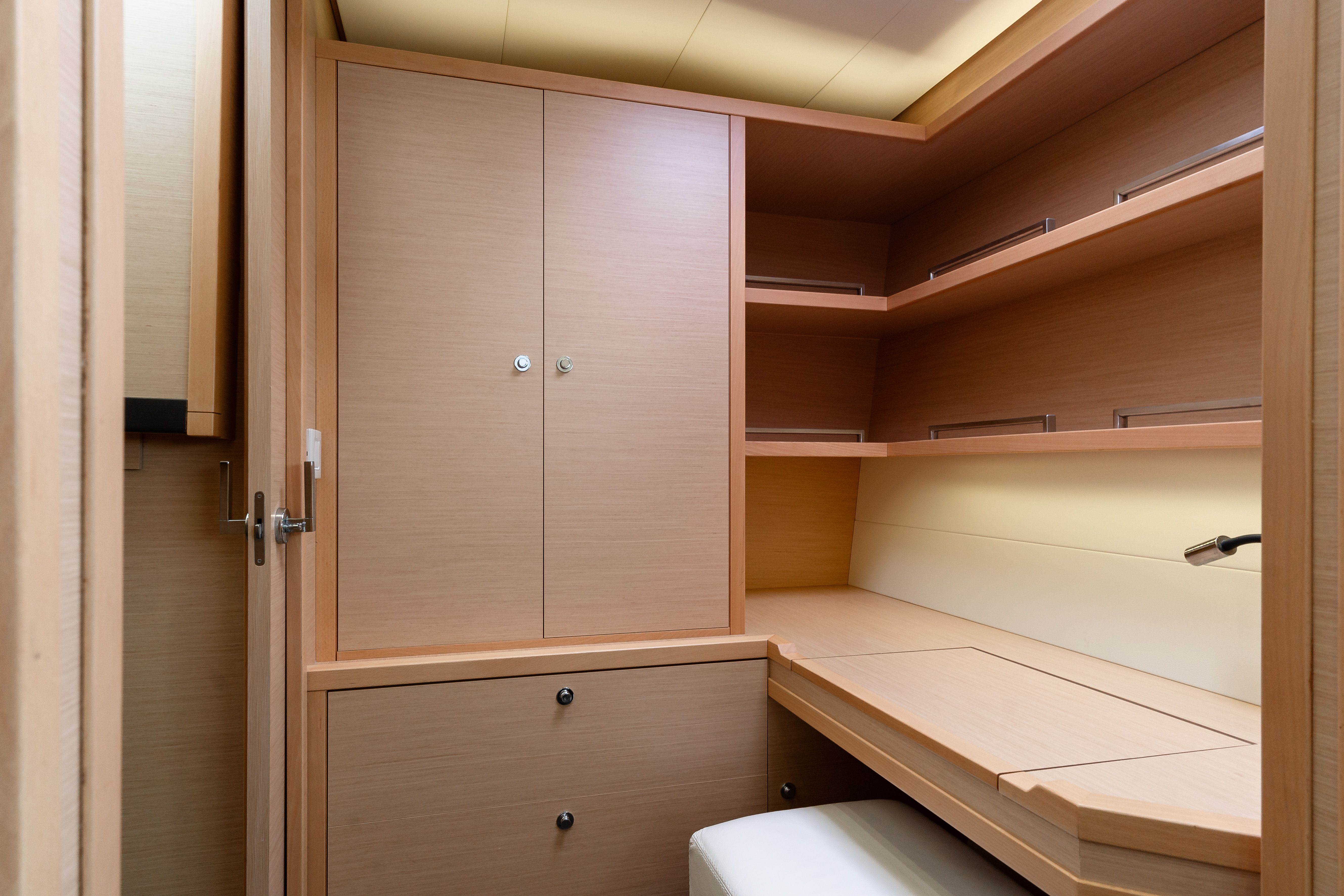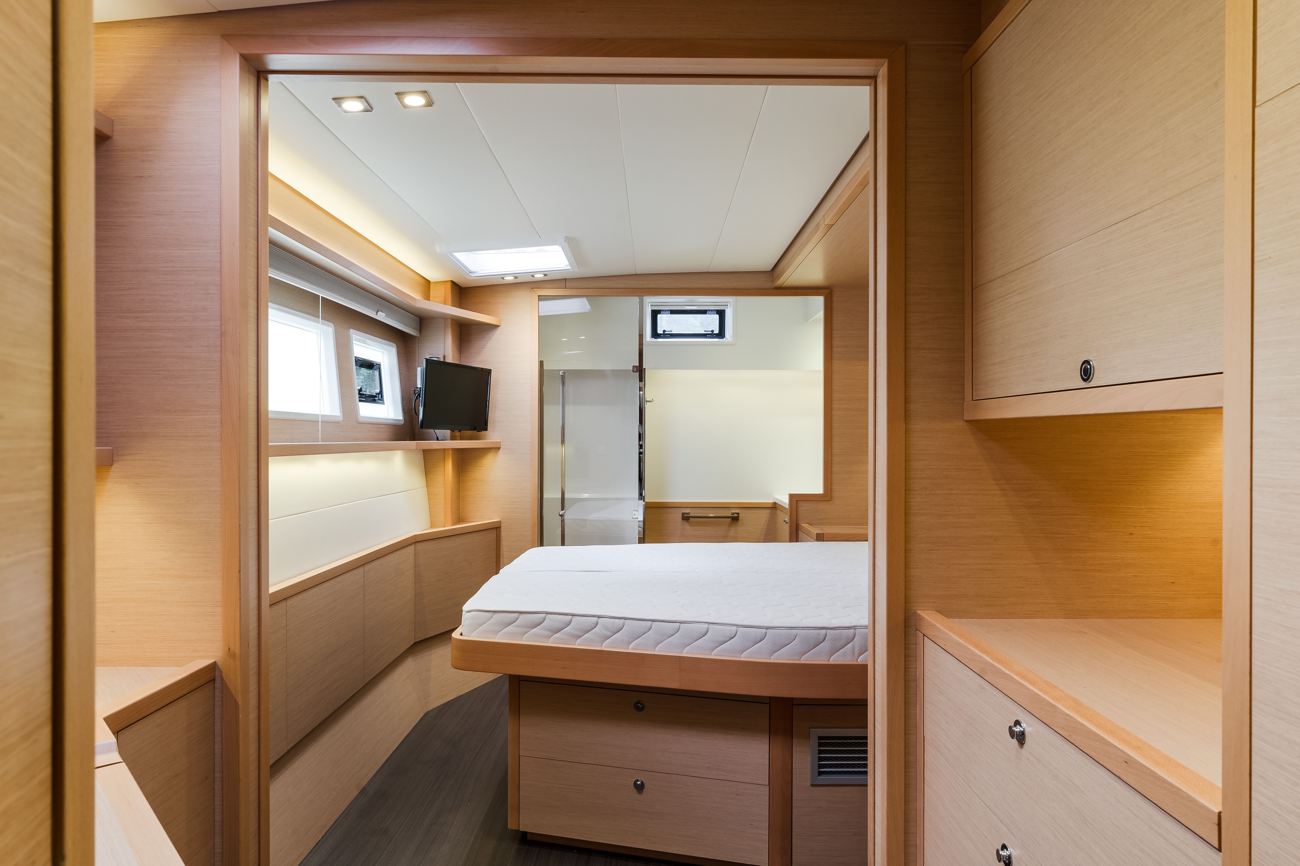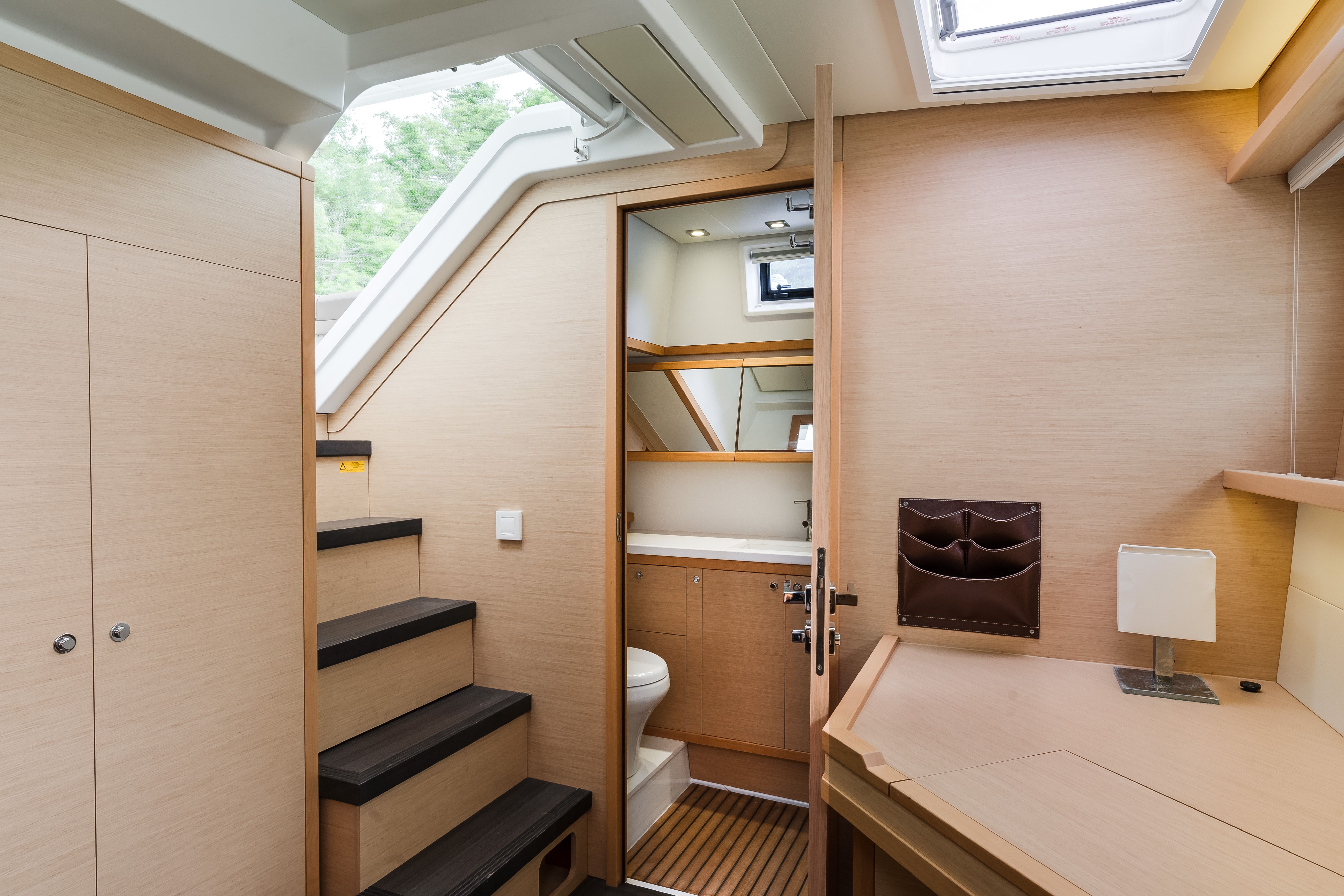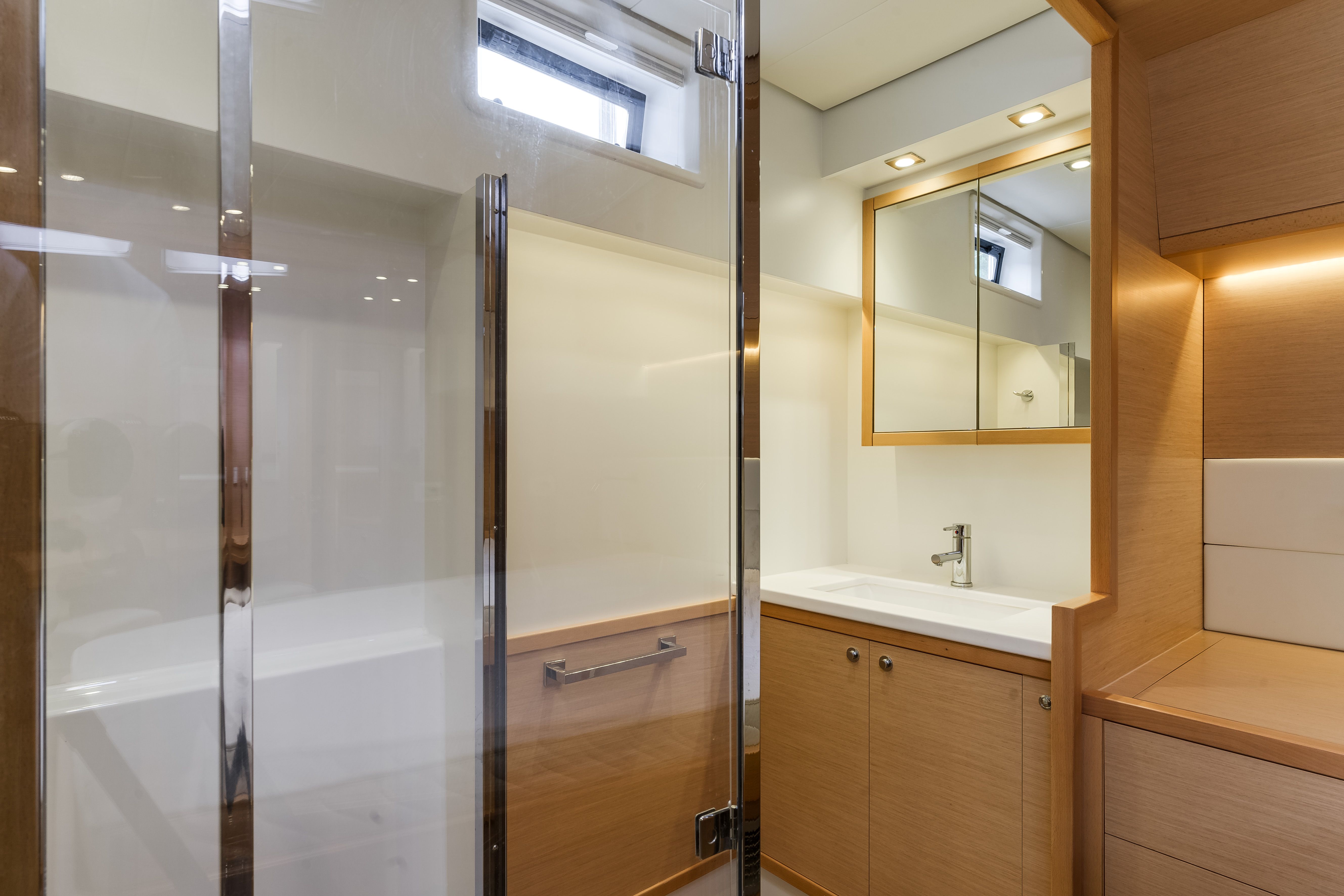 Four cabins with double berths with slats and matrasses, dressing table & stool, storage and en suite facilities including shower enclosures, quiet-flush electric marine toilets and hand basin