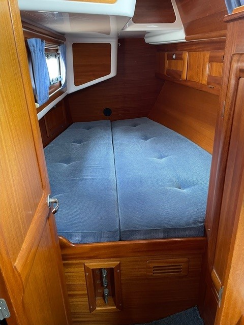 Forward cabin with wardrobe to port, mirror, seat and extensive stowage , 2 book cases.