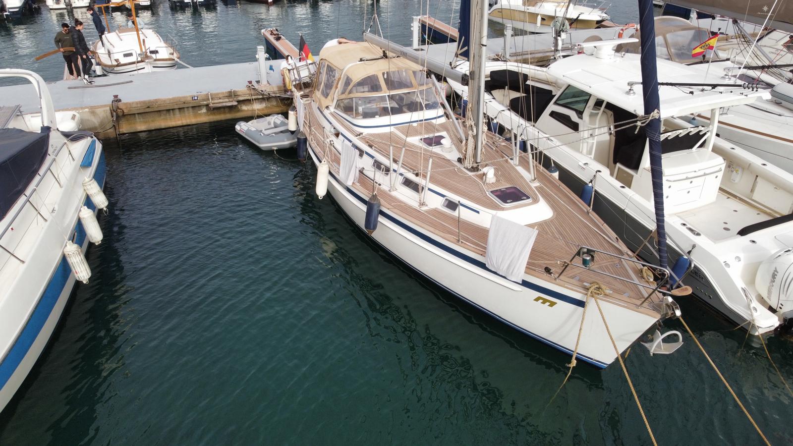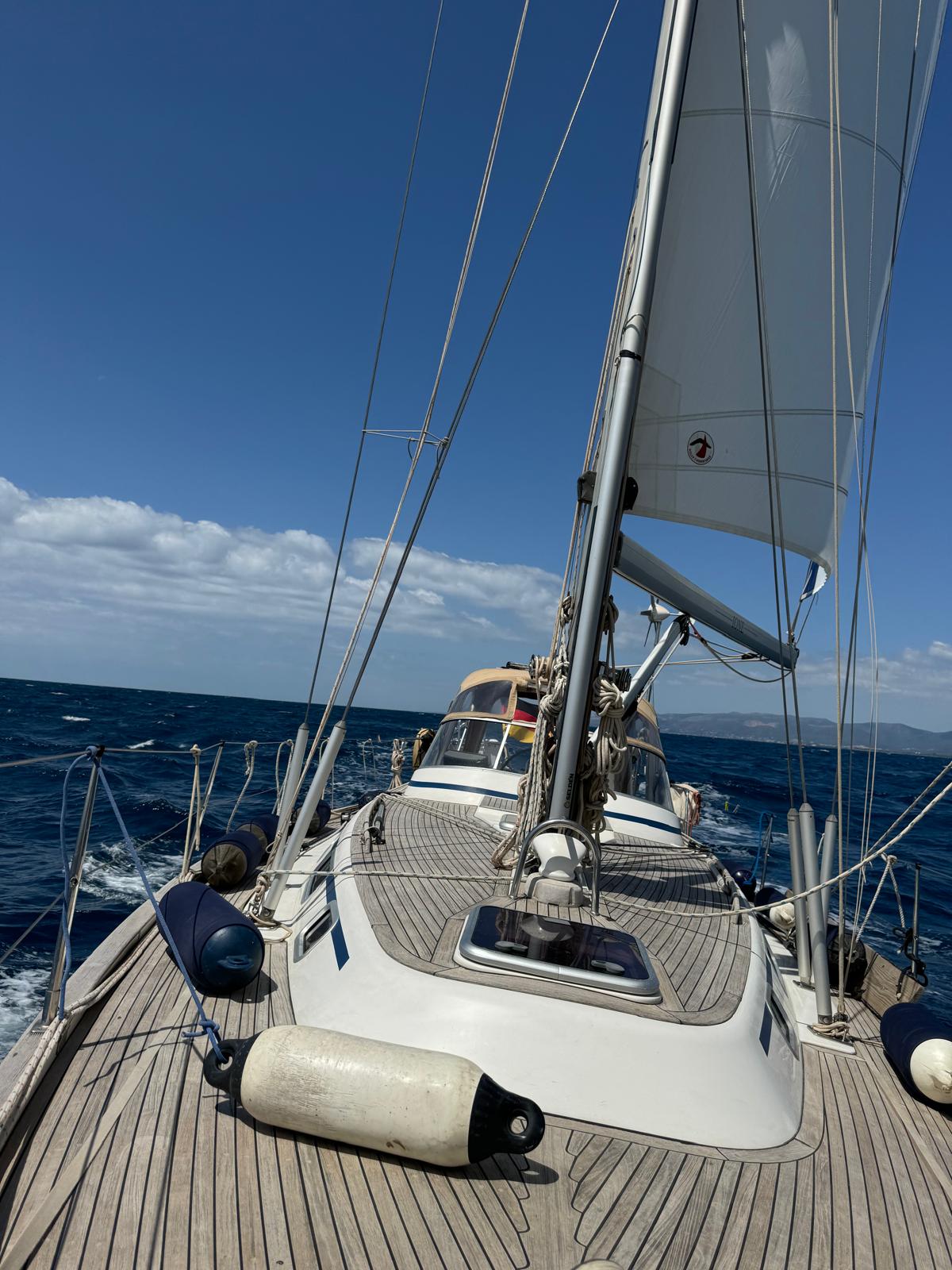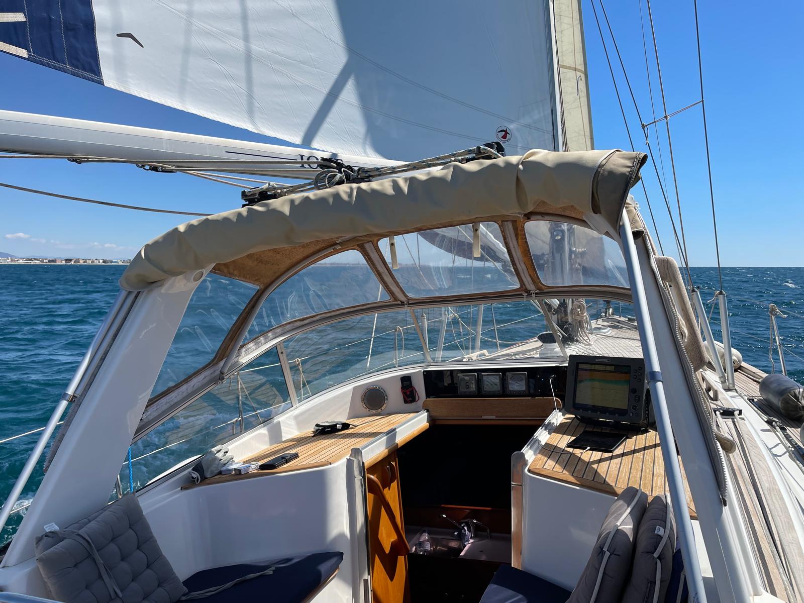 A partial rig and a full 69 m2 of sail (main and genoa) combined with a long waterline and a broad, load bearing stern along with the furling main and genoa winches with all the lines pulled to the cockpit make her an easily handled boat that is full of life.
