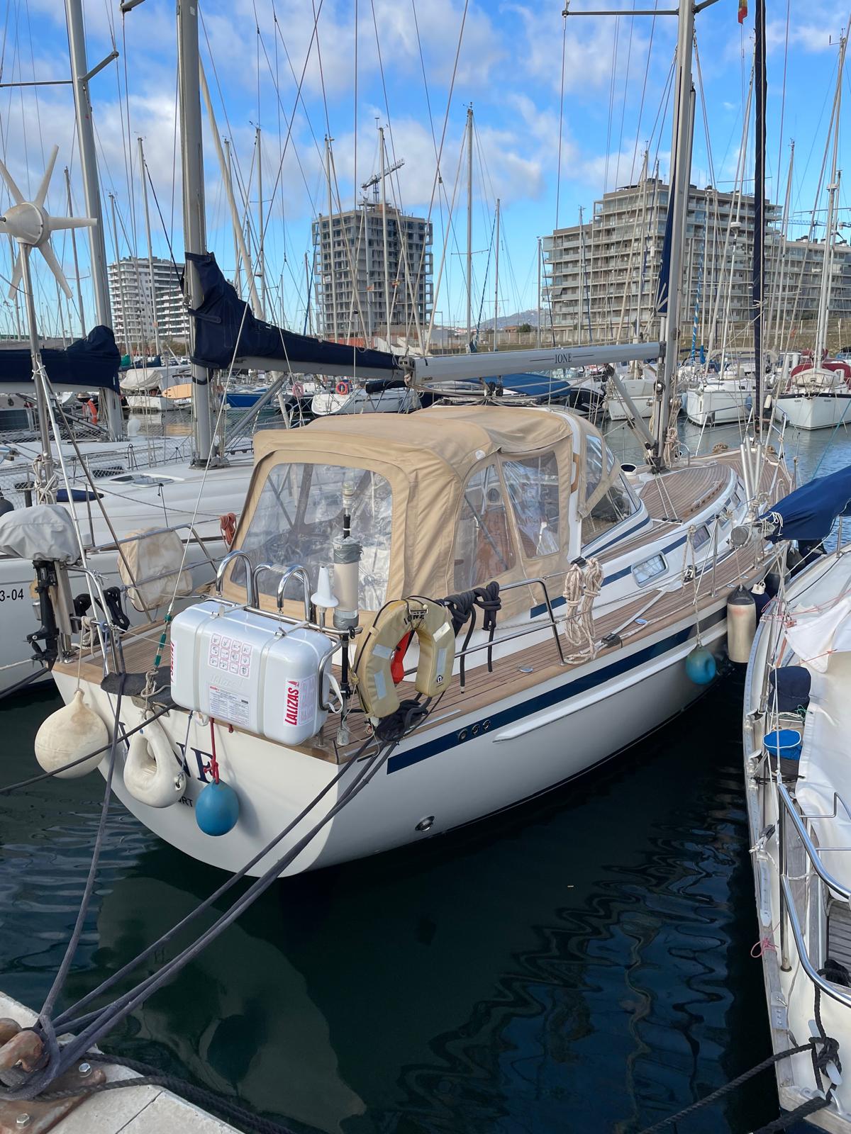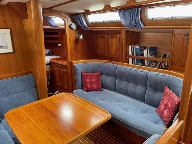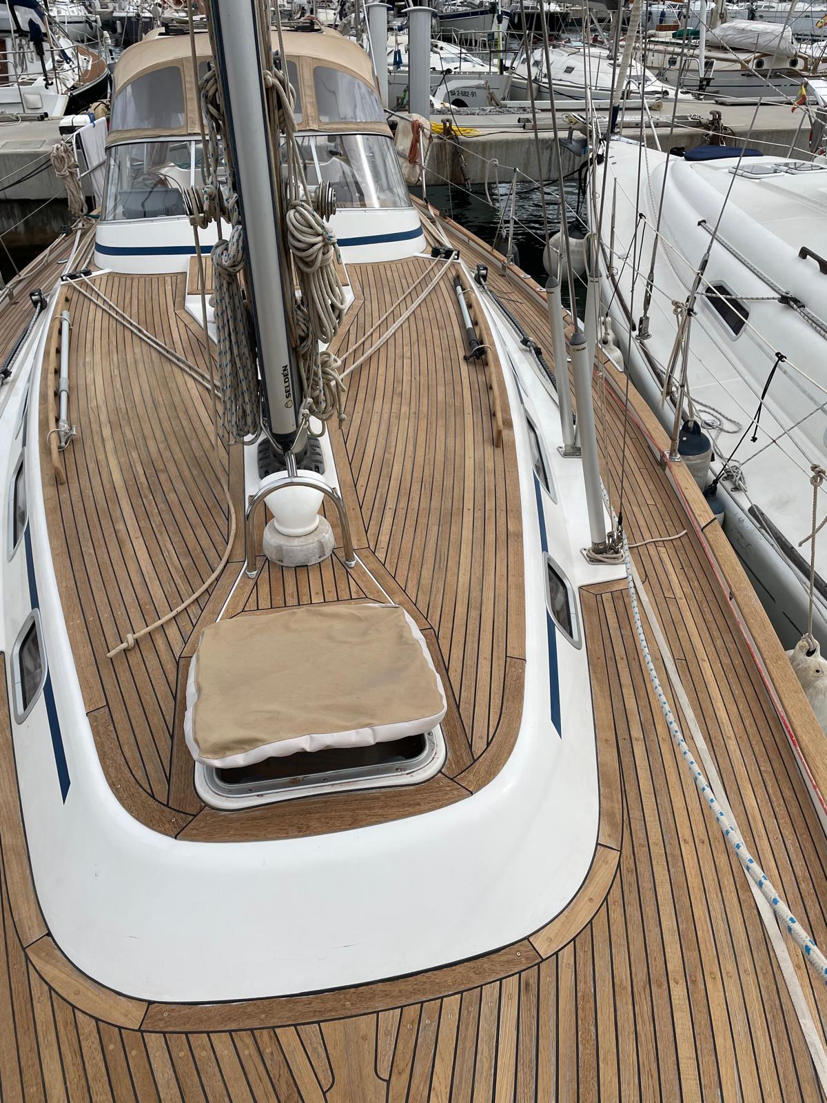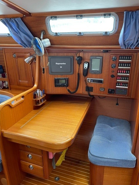A partial rig and a full 69 m2 of sail (main and genoa) combined with a long waterline and a broad, load bearing stern along with the furling main and genoa winches with all the lines pulled to the cockpit make her an easily handled boat that is full of life.