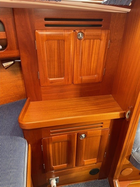 Joinery work below decks of mahogany veneered panels with solid mahogany doors.