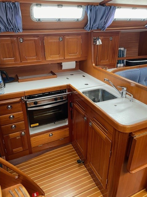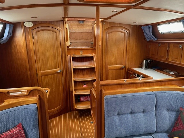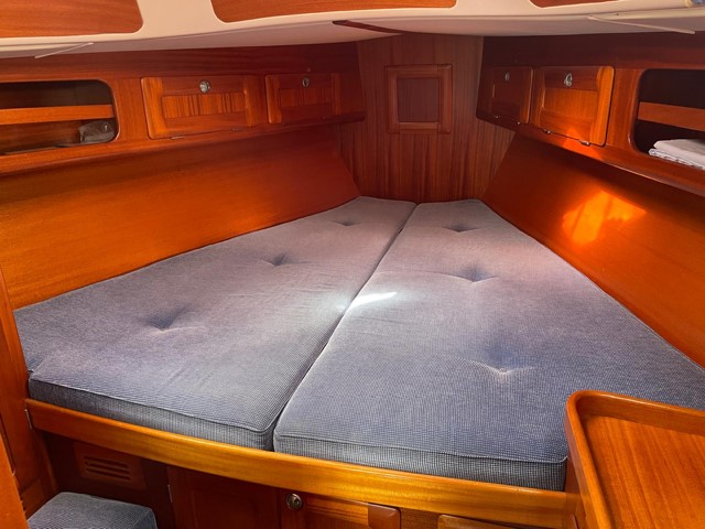 The layout includes two cabins and a spacious saloon with a flexible table normally found in larger boats. The galley is placed to port and navigation and heads with shower on the starboard side. Lots of cupboards and storage space both inside and outside. The interior is built in mahogany with the best finish.