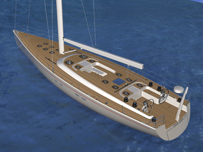 The flush deck and low coach roof of the vessel is finished with hand laid teak