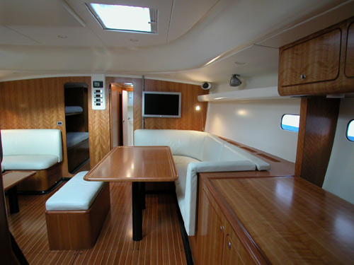 The entertainment system in the saloon includes a Linn home theatre Hifi system with 5 speakers and a sub woofer in the dinette and 4 speakers on deck.