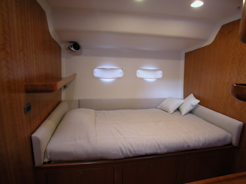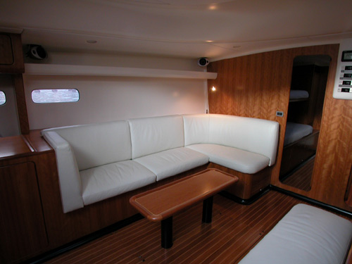 The owners suite is located amidships and provided with two separate single berths with desk and office in between. The saloon is very well lit superbly finished and comfortable for socialising. The two guest cabins are upper and lower berths provided and they are forward preceding the sail locker.