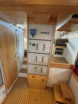 Panneau alimentation extérieure 220 V situé dans la cabine arrière (possibilité de câblage en 110V). Interrupteur de sécurité, disjoncteur différentiel, transformateur d’isolement 3kWA (1.5kWA si câblé en 110 V), isolateur galvanique, Indicateur ampèremètre, disjoncteurs secondaires pour le chargeur de batteries et les quelques prises 220V (110V) distribuées dans le bateau.