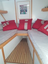 Very spacious aft cabin of 11m2 with a double bed of 160, free access all around. Adjacent toilet. Closet on port and starboard.
