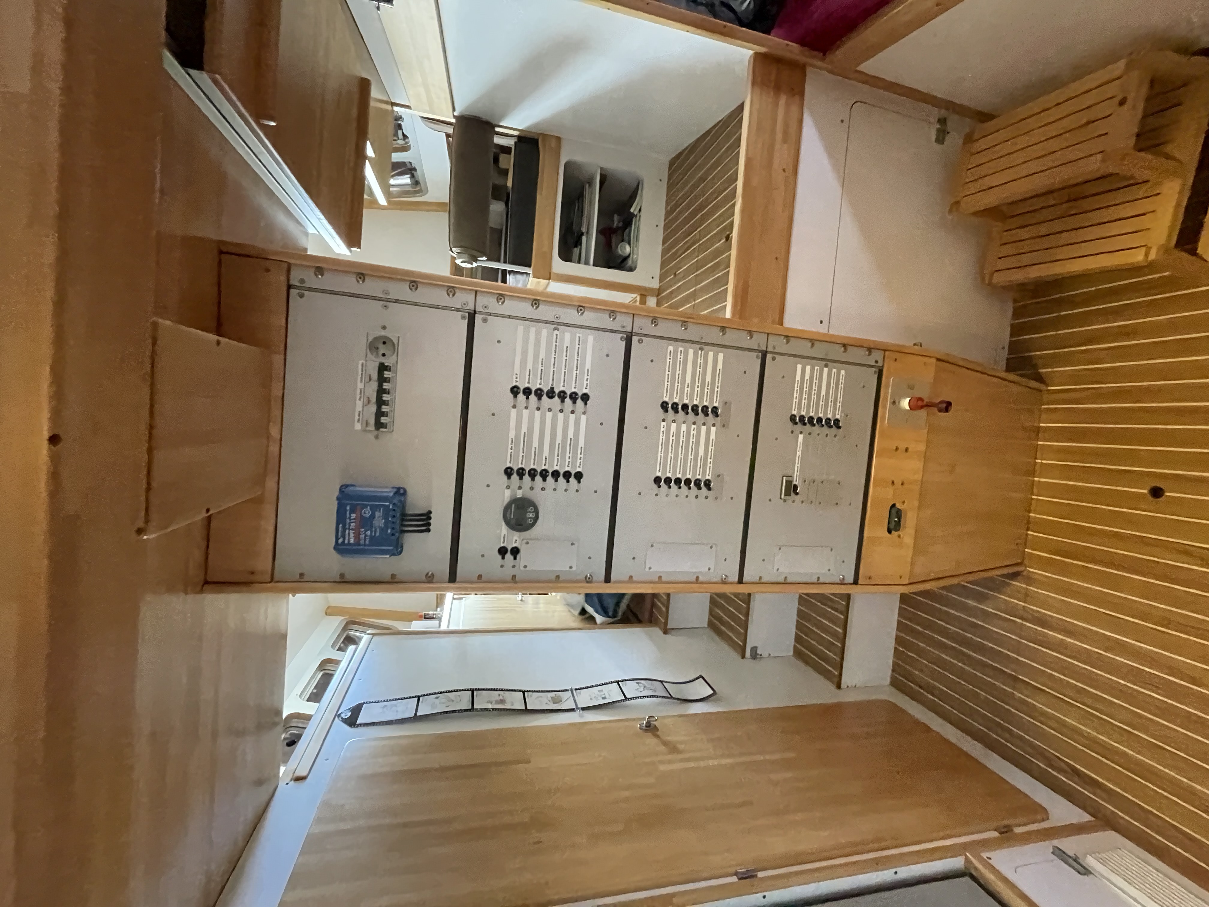 Panneau alimentation extérieure 220 V situé dans la cabine arrière (possibilité de câblage en 110V). Interrupteur de sécurité, disjoncteur différentiel, transformateur d’isolement 3kWA (1.5kWA si câblé en 110 V), isolateur galvanique, Indicateur ampèremètre, disjoncteurs secondaires pour le chargeur de batteries et les quelques prises 220V (110V) distribuées dans le bateau.