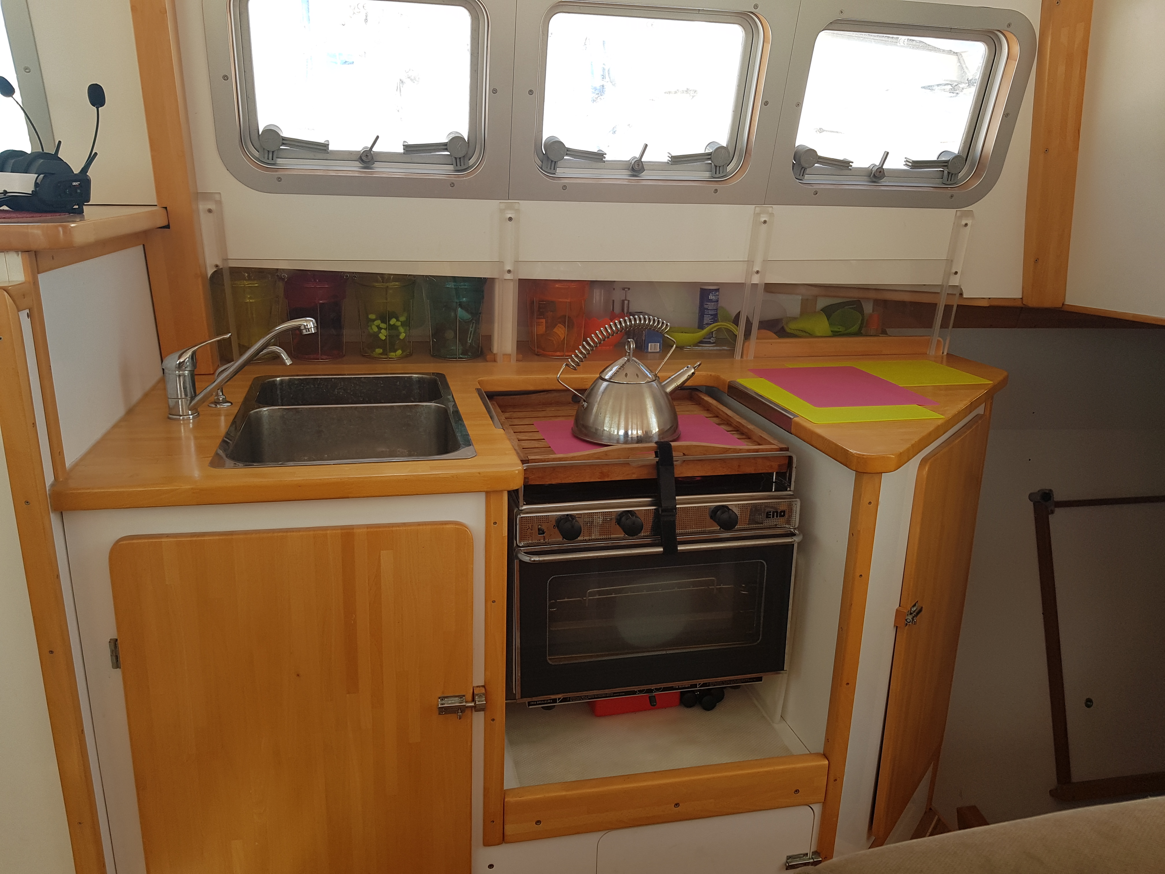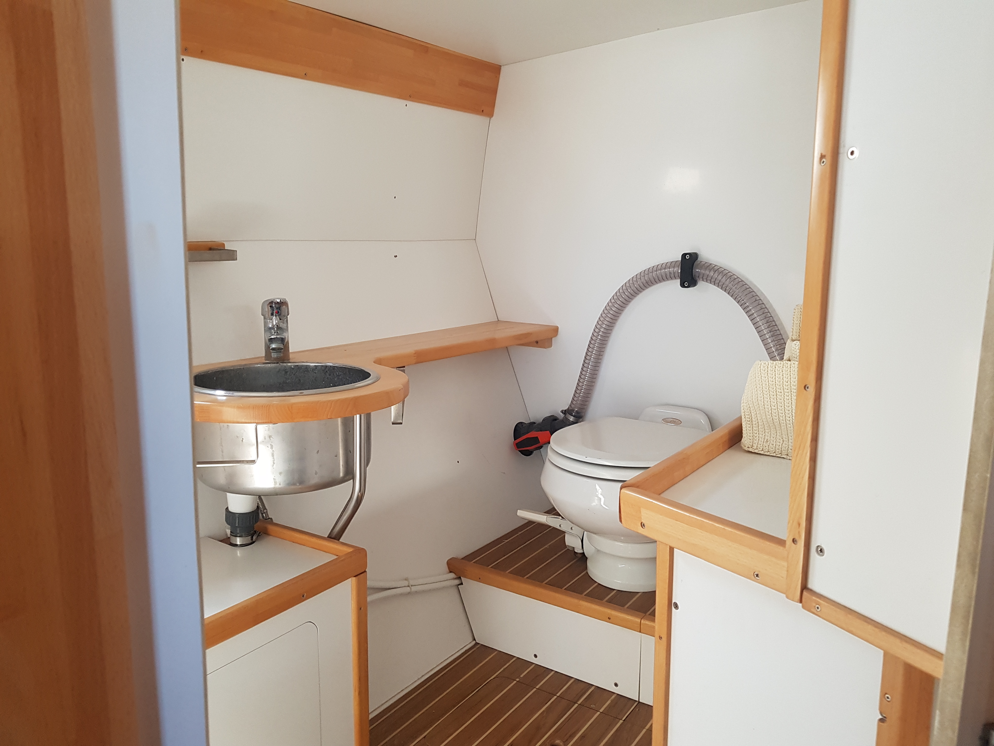 This boat is equipped with a sophisticated black water treatment system. For this purpose the toilets are equipped with Vacuflush vacuum toilets, only 0.5 liters of water per flush. The black water is then treated by a Lectrasan electrolyser. The material thus rendered bacteriologically inactive is returned to the 160L polyethylene black water tank equipped with a level gauge (by pressure measurement). Moreover, the pump associated with this gauge allows the oxygenation of the tank in order to limit the development of anaerobic bacteria. This tank allows one week of use with three people before emptying. The emptying in authorized area is done towards the outside by a dedicated internal transfer pump or by external pumping in the ports.