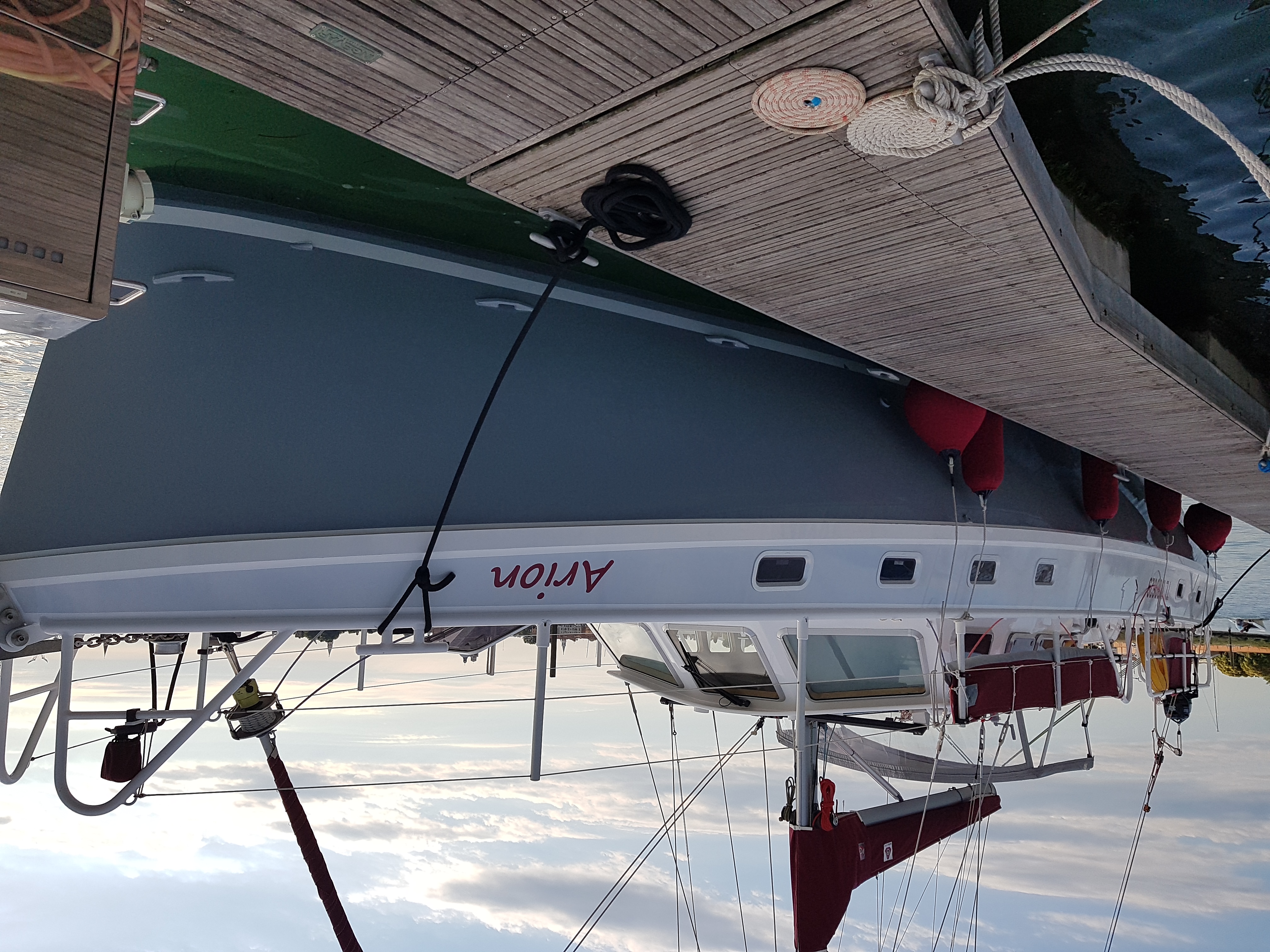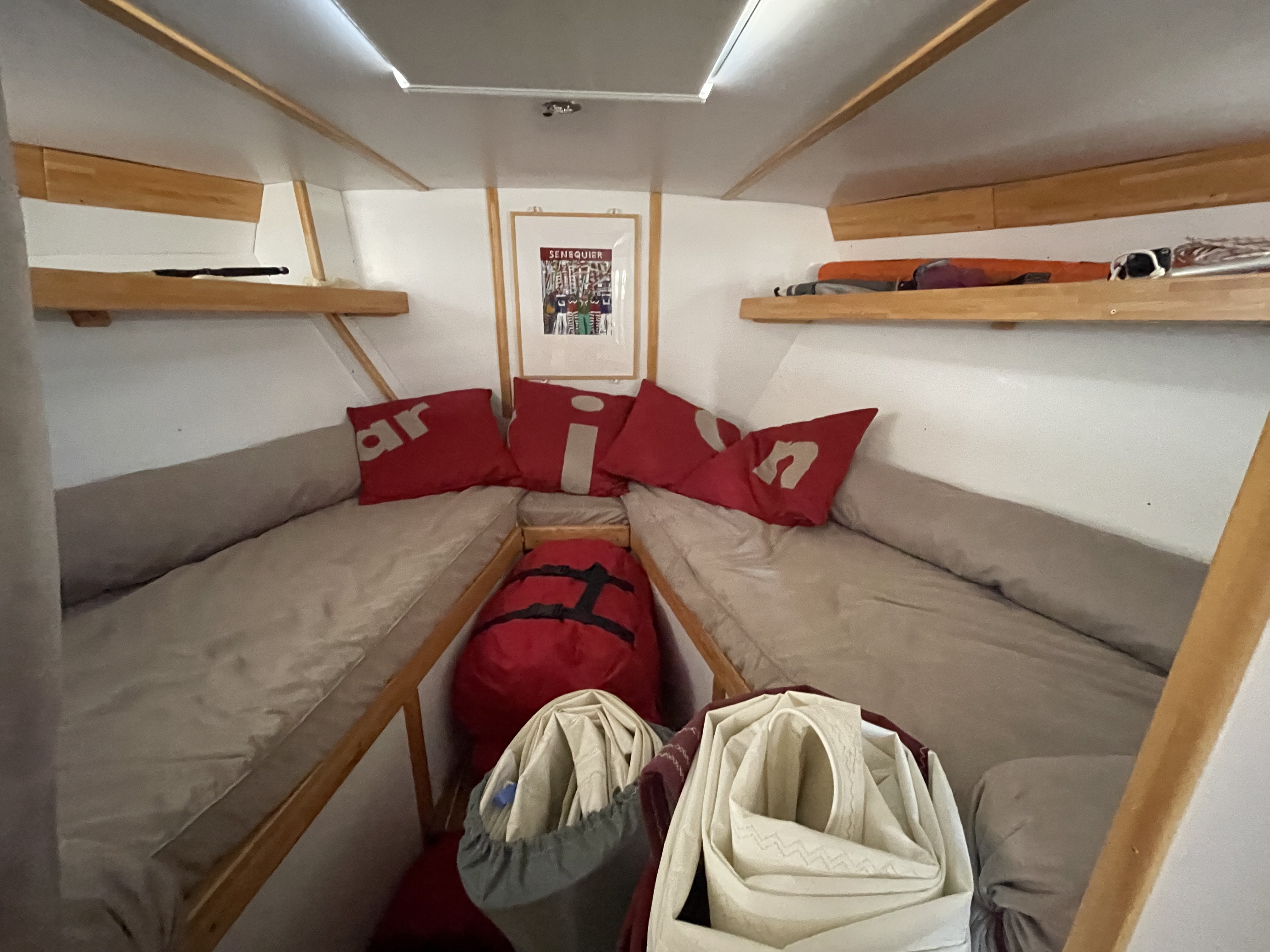 VOILE DE CAP : Delta Voiles. Pour limiter la navigation sur l’ancre au mouillage par fort vent, il a été développé un system unique de deux voiles jumelles (3 m2) (formant un tétraèdre) montées sur un emmagasineur qui est gréé sur le pataras tribord