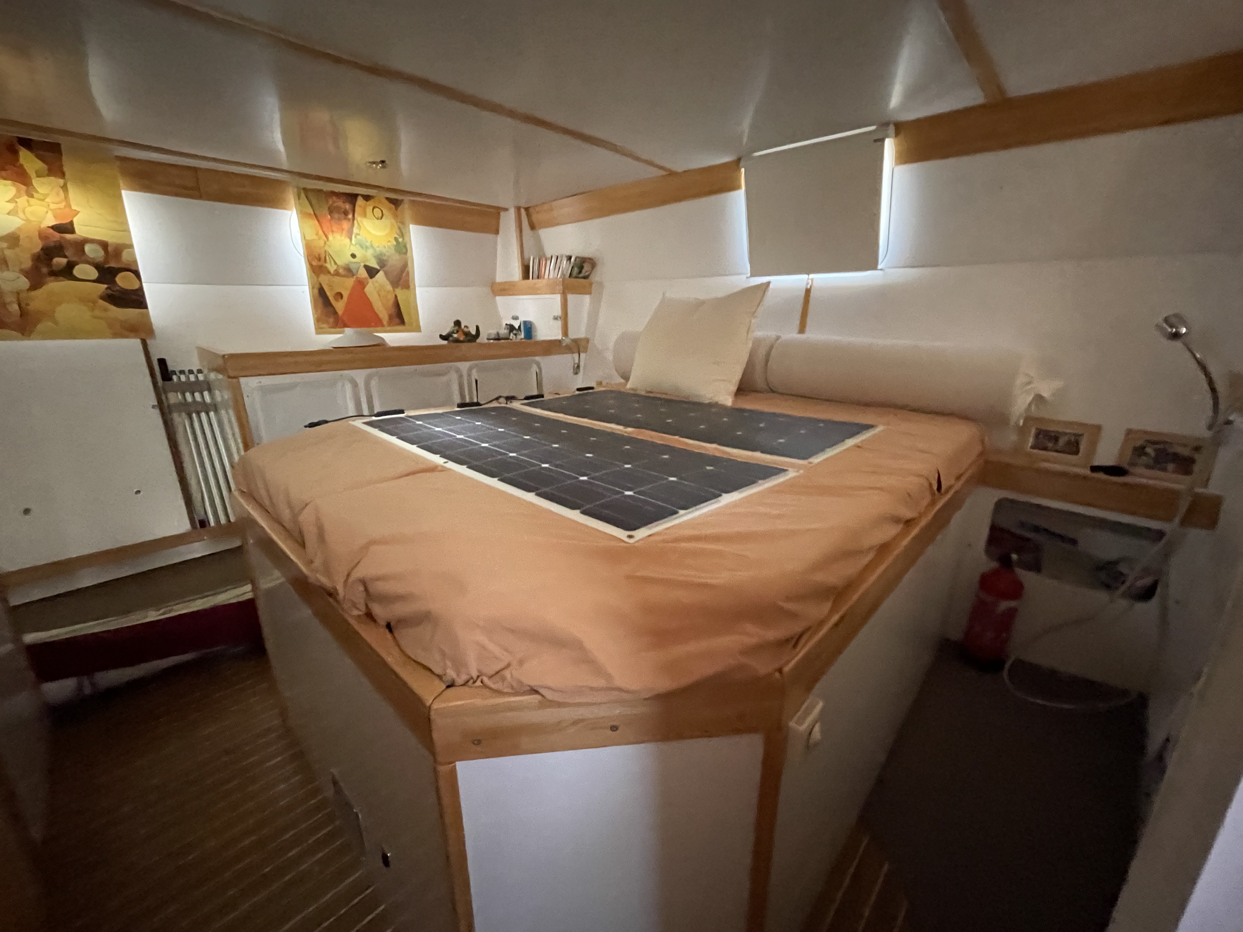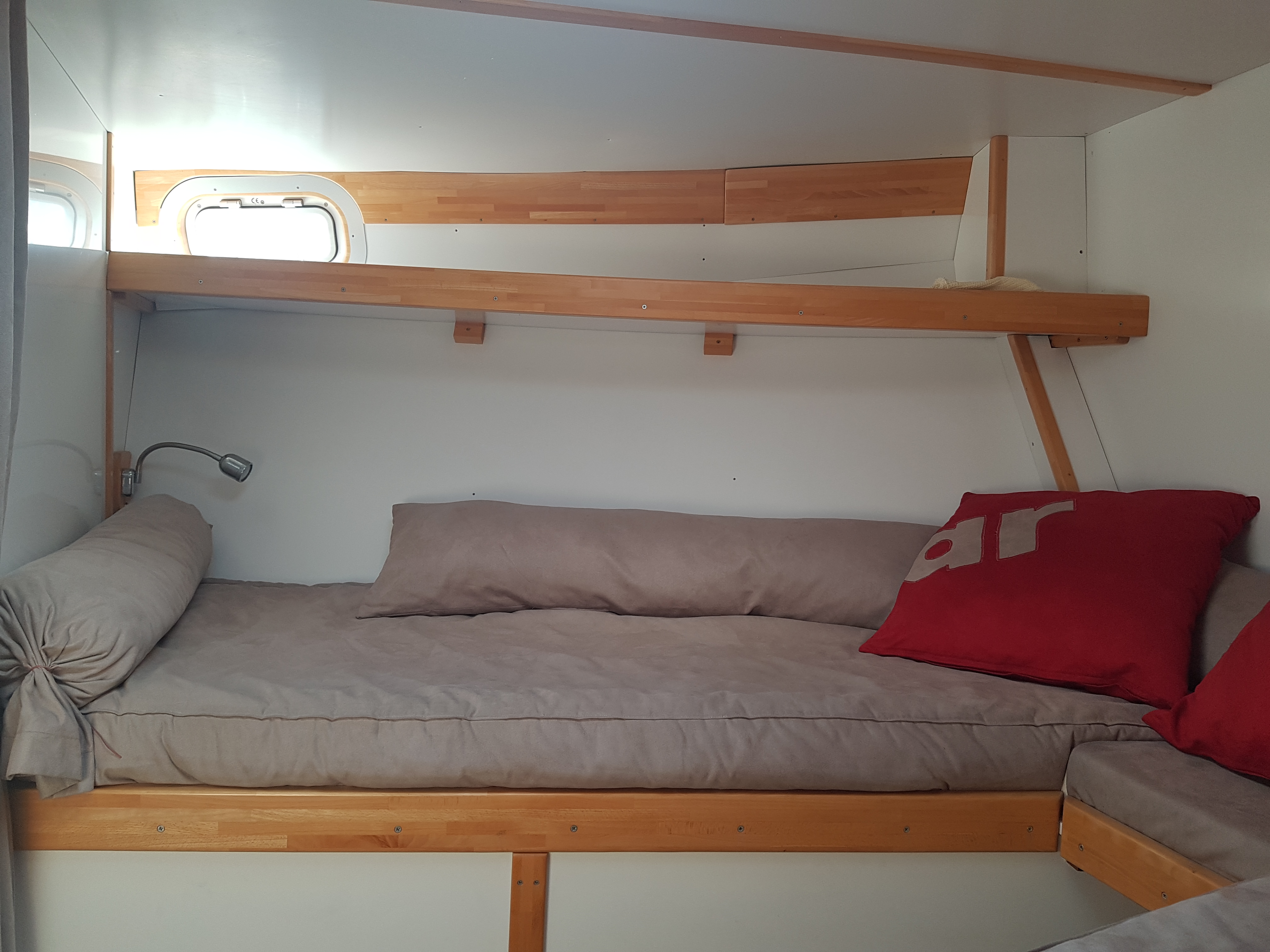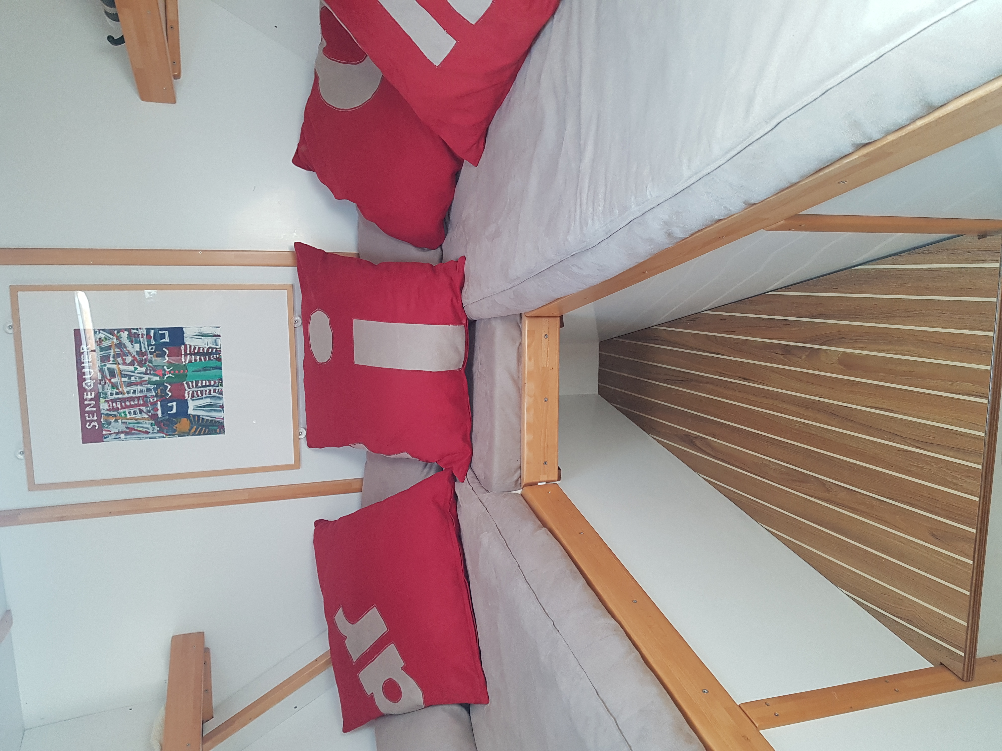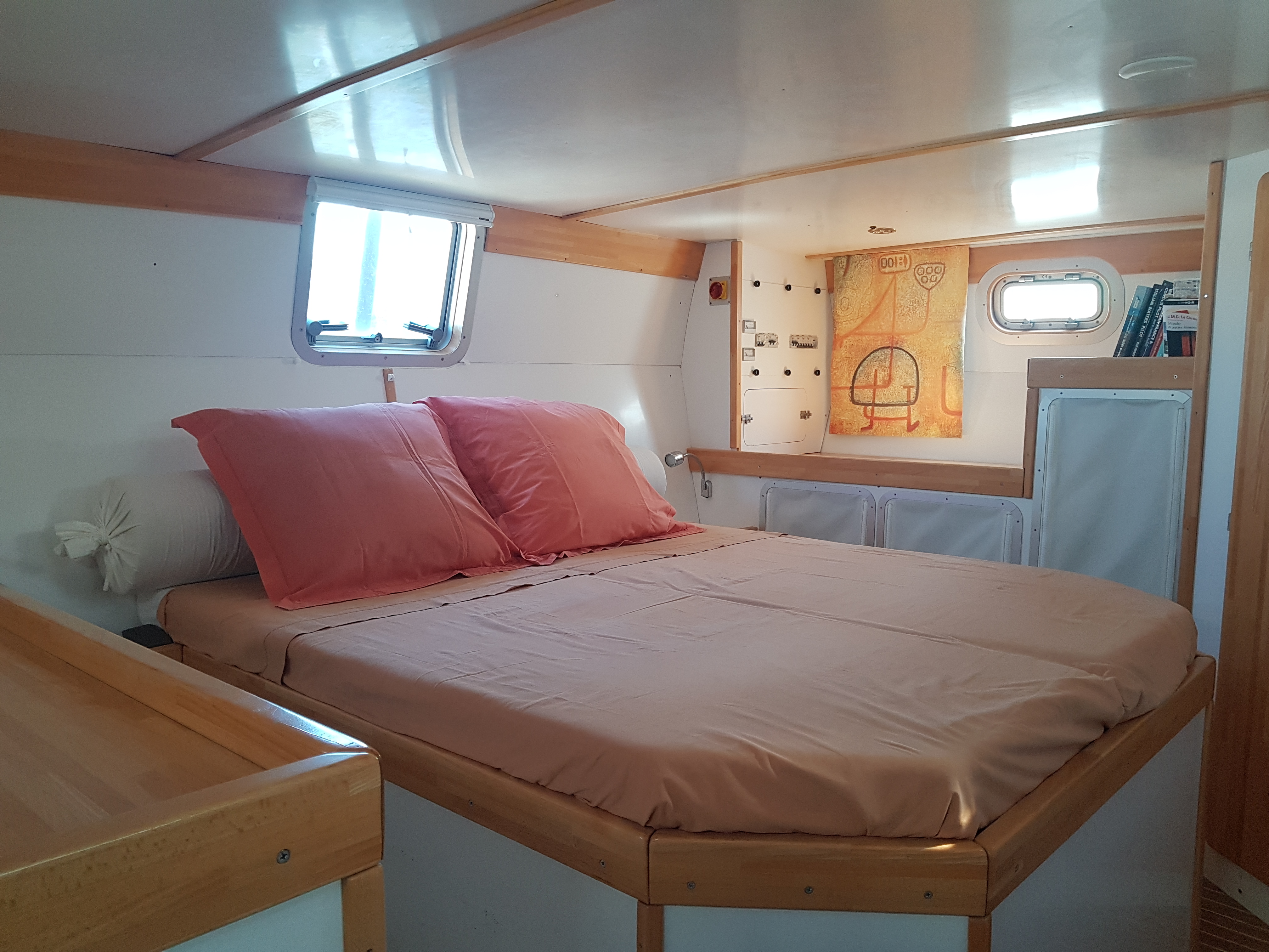 Very spacious aft cabin of 11m2 with a double bed of 160, free access all around. Adjacent toilet. Closet on port and starboard.