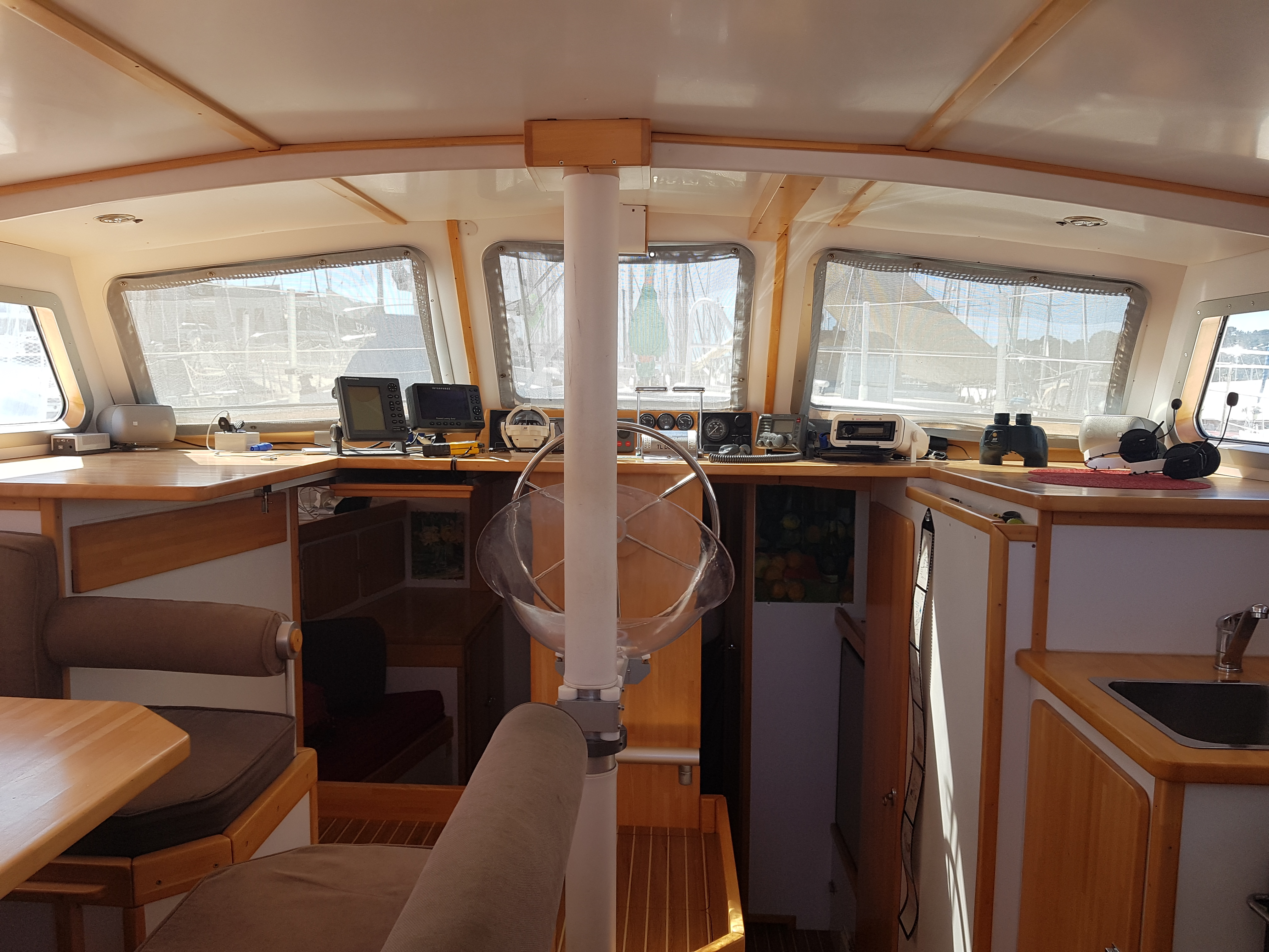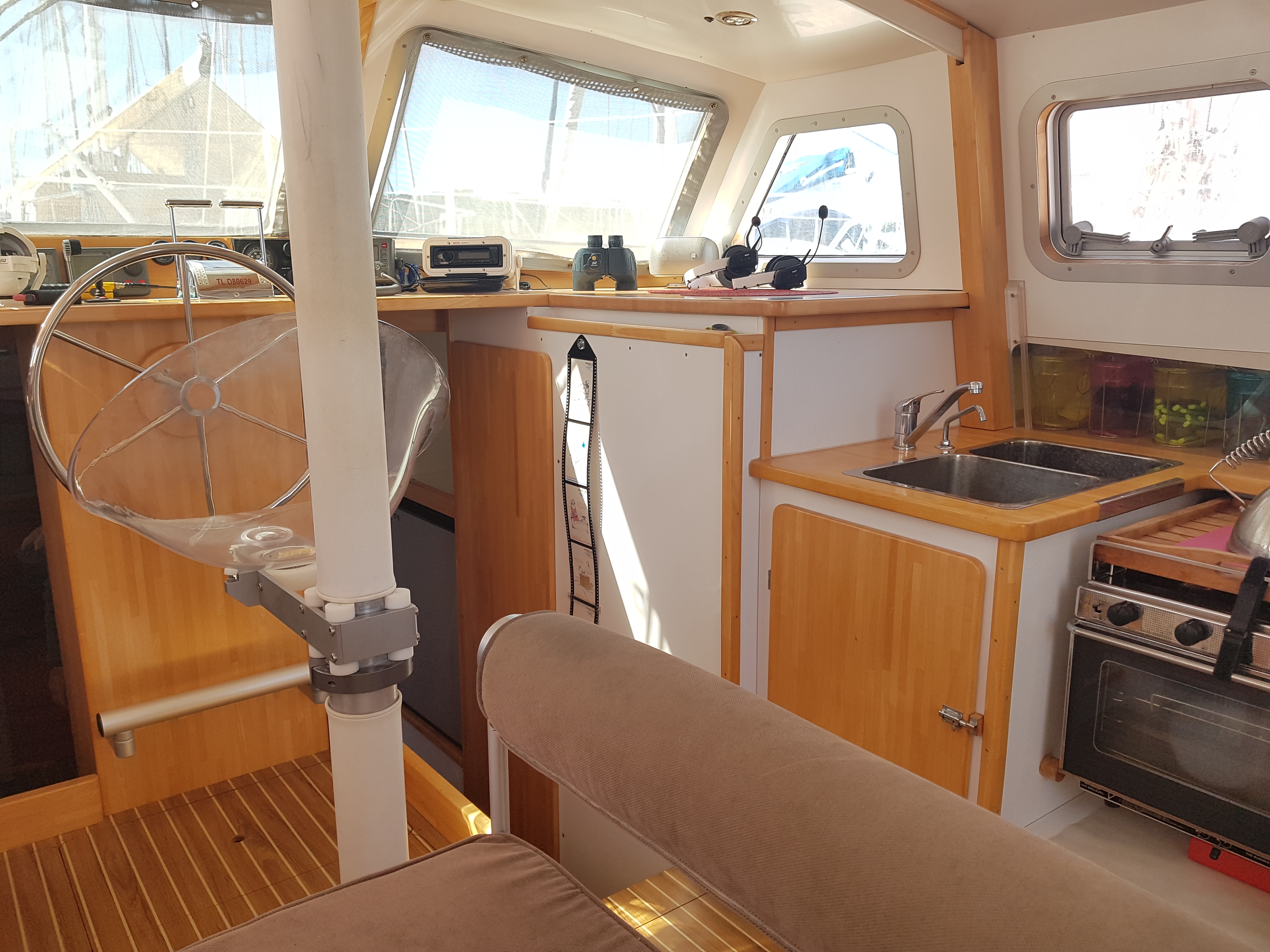 It is a unit construction in Strongal aluminum from Naval Meta shipyards. It consumes about 5 liters per hour at 7 knots and sometimes less if the wind is downwind. Its very shallow draft opens the interior channels, moreover ballasted at the bottom of the hull, it is certified according to the category of construction A which authorizes it the great oceanic cruising. The secure central cockpit allows for a very large owner's cabin at the rear. The kitchen and dining area are in the deck saloon, which gives a perfect view on the outside. The large and spacious forward cabin berths and navigator's berth are down below.